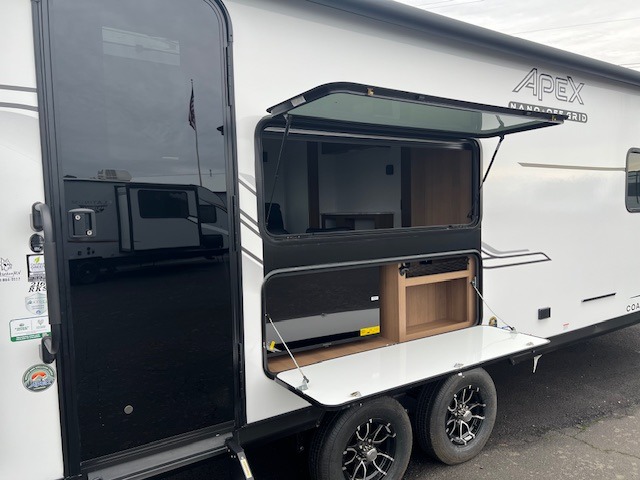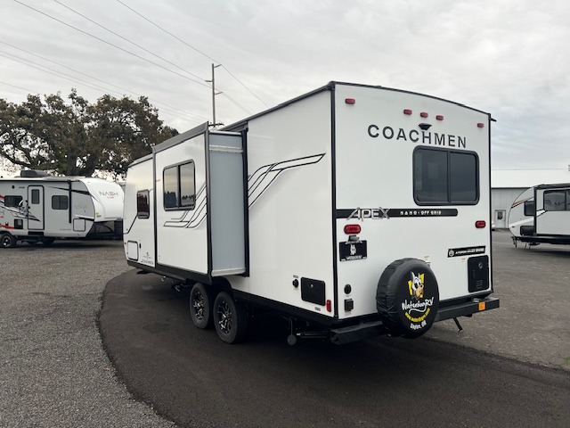 You will find comfort, convenience, and a sturdy construction with each of these Coachmen RV Apex Nano travel trailers! They are held together with an aluma-cage construction, an I-beam chassis, plus vacuum-bonded laminated dual Azdel fiberglass walls for double the protection against the elements. The 400-watt solar panel with a 30 amp control charger is included, along with two 20 lb. LP tanks, a high velocity power roof vent, plus 12V outlets to keep you powered up. More exterior features include a hot/cold shower, four stabilizer jacks, a power awning with LED lighting, and radius thumb latch baggage doors to easily pack and unload your gear. You will love the interior of your Apex Nano with Congoleum residential flooring, one-piece seamless edge countertops, matte black hardware in the galley, and a hand-crafted wood medicine cabinet in the bath.