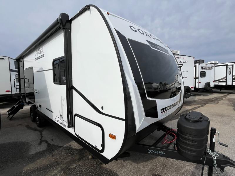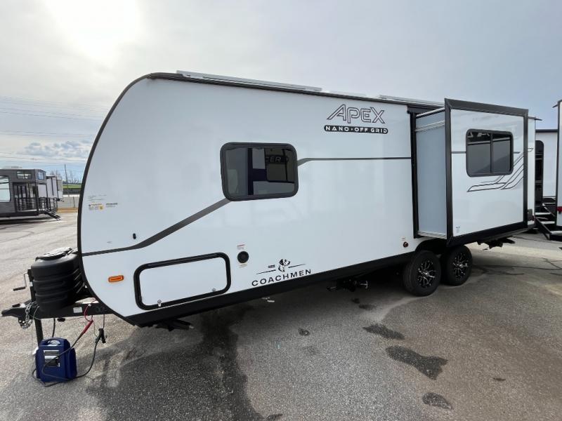 You will find comfort, convenience, and a sturdy construction with each of these Coachmen RV Apex Nano travel trailers! They are held together with an aluma-cage construction, an I-beam chassis, plus vacuum-bonded laminated dual Azdel fiberglass walls for double the protection against the elements. The 400-watt solar panel with a 30 amp control charger is included, along with two 20 lb. LP tanks, a high velocity power roof vent, plus 12V outlets to keep you powered up. More exterior features include a hot/cold shower, four stabilizer jacks, a power awning with LED lighting, and radius thumb latch baggage doors to easily pack and unload your gear. You will love the interior of your Apex Nano with Congoleum residential flooring, one-piece seamless edge countertops, matte black hardware in the galley, and a hand-crafted wood medicine cabinet in the bath.