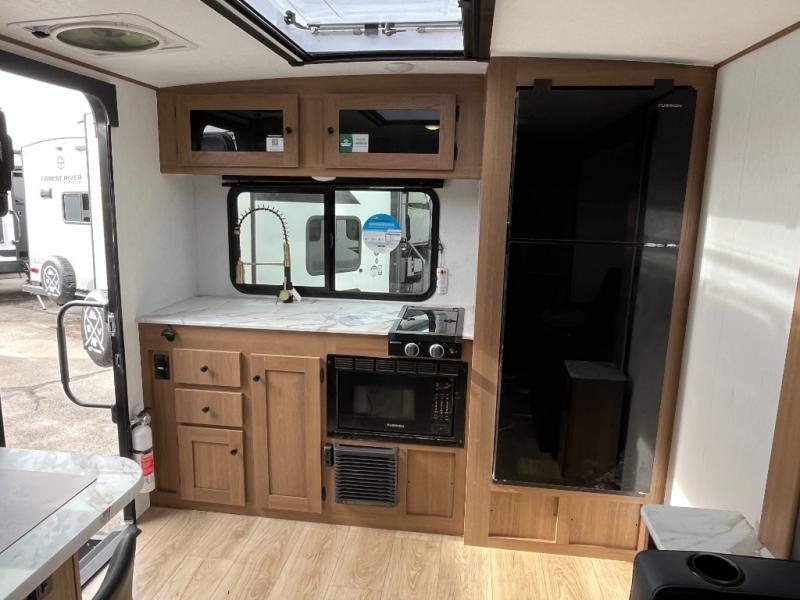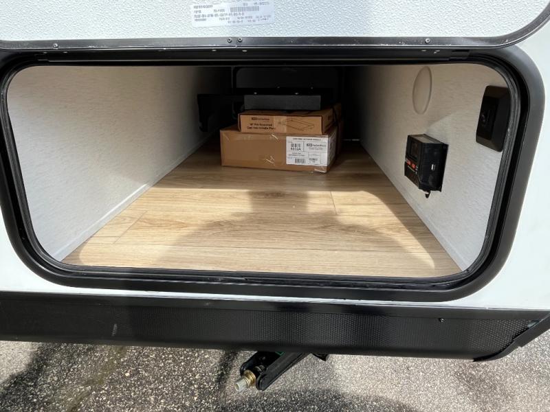 As you step inside, you’re welcomed by a spacious rear kitchen that spans the full width of the trailer, making meal prep both convenient and enjoyable. The kitchen is equipped with a stainless-steel sink featuring a flush mount cover for added counter space, a 2-burner cooktop, an air fryer microwave, and a 10 cu. ft. refrigerator, perfect for storing all your groceries. A pantry adds even more storage for dry goods and kitchen essentials. Just in front of the kitchen, a Bar-V counter with chairs offers a great spot to dine, work, or relax with company. Across from the counter, a comfortable sofa slide provides a cozy lounging area and can also convert into an extra sleeping space when needed. Moving forward, the walk-through bathroom features a shower, a skylight for natural light, and a foot flush toilet for added convenience. At the front of the trailer, the private bedroom includes a queen bed flanked by wardrobes on each side, offering both comfort and practical storage for all your essentials.