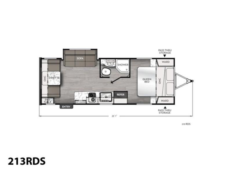 As you step inside, you’re welcomed by a spacious rear kitchen that spans the full width of the trailer, making meal prep both convenient and enjoyable. The kitchen is equipped with a stainless-steel sink featuring a flush mount cover for added counter space, a 2-burner cooktop, an air fryer microwave, and a 10 cu. ft. refrigerator, perfect for storing all your groceries. A pantry adds even more storage for dry goods and kitchen essentials. Just in front of the kitchen, a Bar-V counter with chairs offers a great spot to dine, work, or relax with company. Across from the counter, a comfortable sofa slide provides a cozy lounging area and can also convert into an extra sleeping space when needed. Moving forward, the walk-through bathroom features a shower, a skylight for natural light, and a foot flush toilet for added convenience. At the front of the trailer, the private bedroom includes a queen bed flanked by wardrobes on each side, offering both comfort and practical storage for all your essentials.
