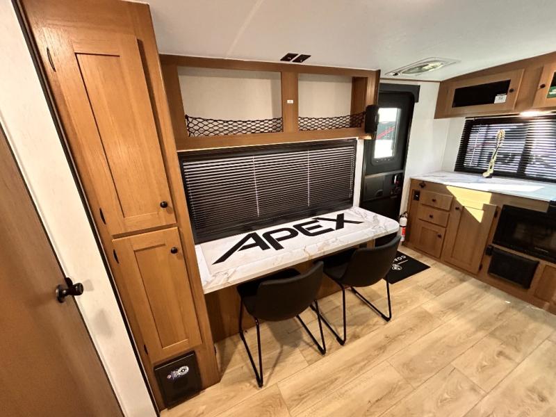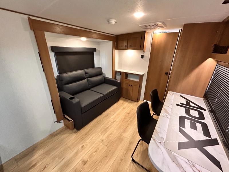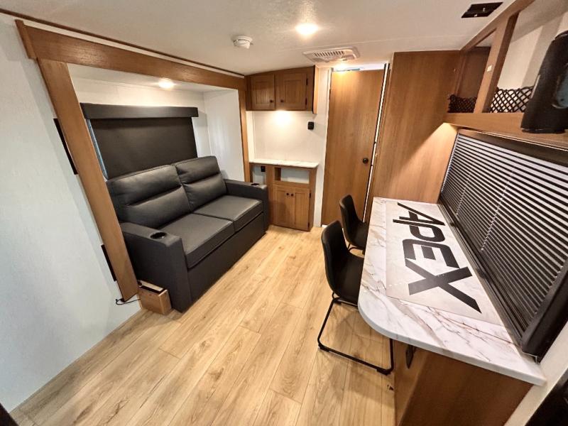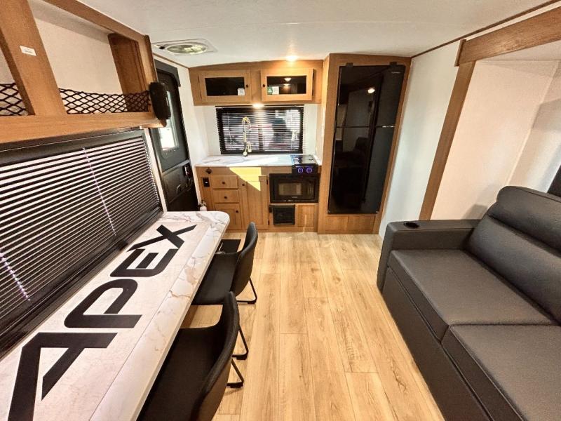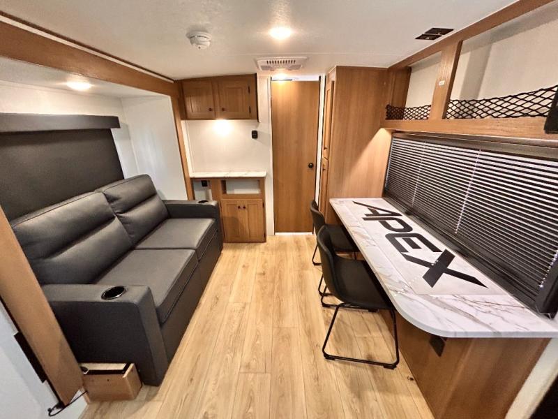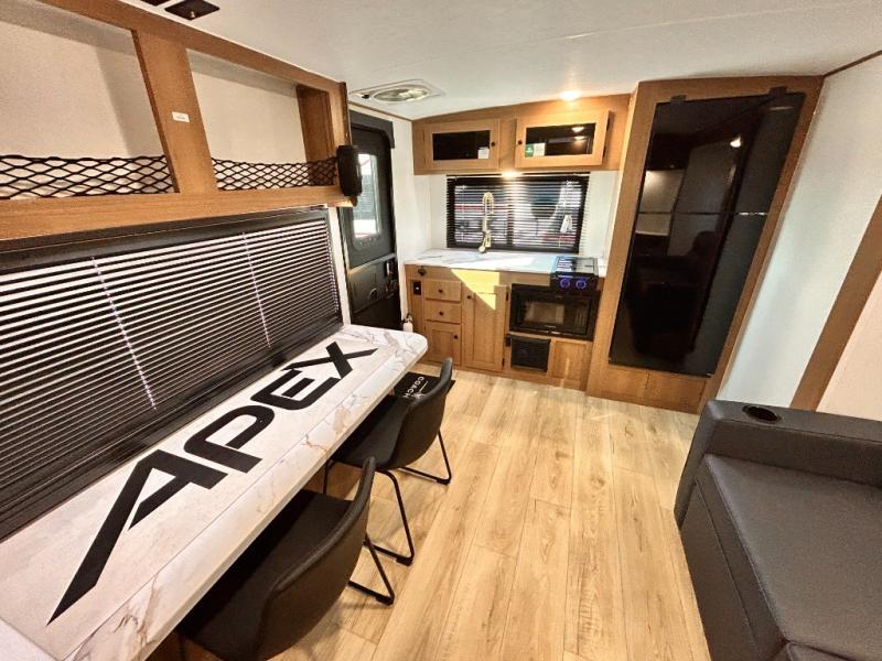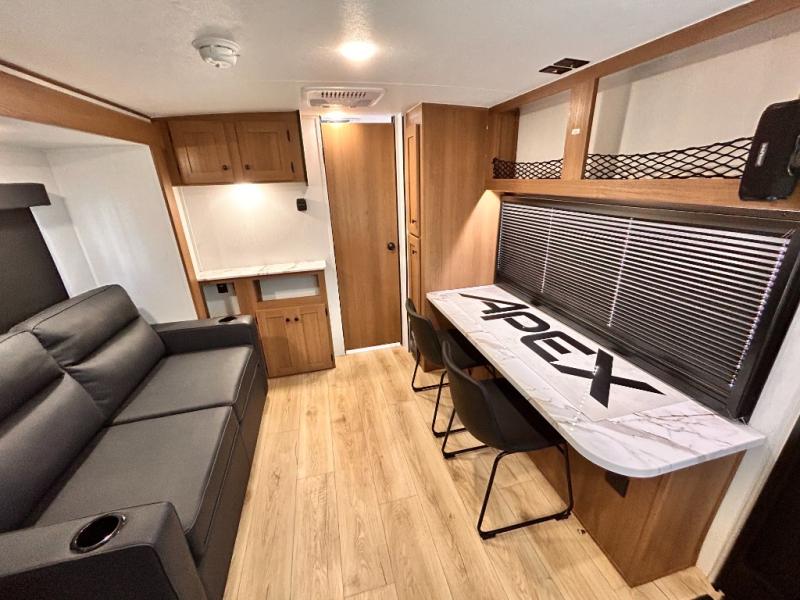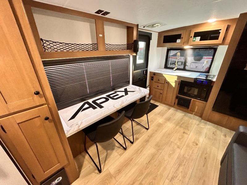 - APEX NANO PACKAGE VACUUM-BONDED LAMINATED AZDEL FIBERGLASS SIDEWALLS, REAR WALL, AND CROWNED ROOF, LAMINATED ALUMINUM FRAME FLOOR, FIBERGLASS FRONT CAP W/ WINDOW, LED LIGHT & FRONT STONE GUARD, ALUMA-CAGE CONSTRUCTION, ENCLOSED UNDERBELLY W/ FORCED AIR/HEAT (DBL AXLE), SLIDE SYSTEM (N/A 187RB AND BELOW), ALUMINUM RIMS, LADDER PREP, CAST IRON GRIDDLE, MOUNTED WIRELESS BLUETOOTH SPEAKER, STABILIZER JACKS, LP PORT, TANKLESS WATER HEATER, H/C OUTSIDE SHOWER, BLACK TANK FLUSH, SWING AWAY ASSIST HANDLE, FRICTION HINGE ENTRY DOOR, SOLID STEP, MAGNETIC BAGGAGE DOOR CATCH, HARD VALANCES W / ROLLER SHADES, LED INTERIOR LIGHTS, AIR FRYER MICROWAVE, 2- BURNER COOK-TOP, 10 CU FT 12V REFER, SINGLE SINK W/ COVER, ACCESS DOORS UNDER DINETTE, FRAME RECEIVE PREP (DBL AXLE ONLY), DIGITAL TV ANTENNA W/ CABLE CONNECTION, SHOWER/TUB SURROUND, SKYLIGHT IN BATH, MATTRESS W/ COVER, B/U CAMERA MOUNT, BATTERY DISCONNECT SWITCH