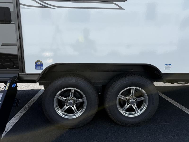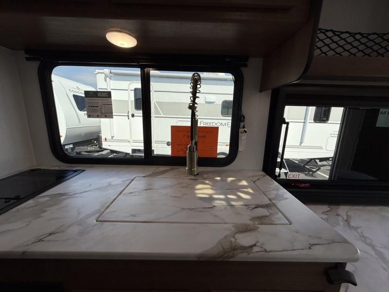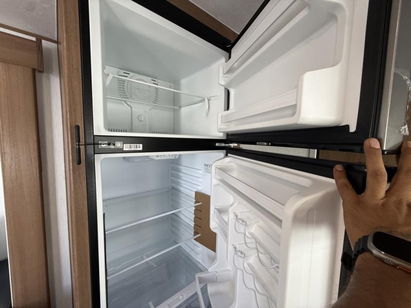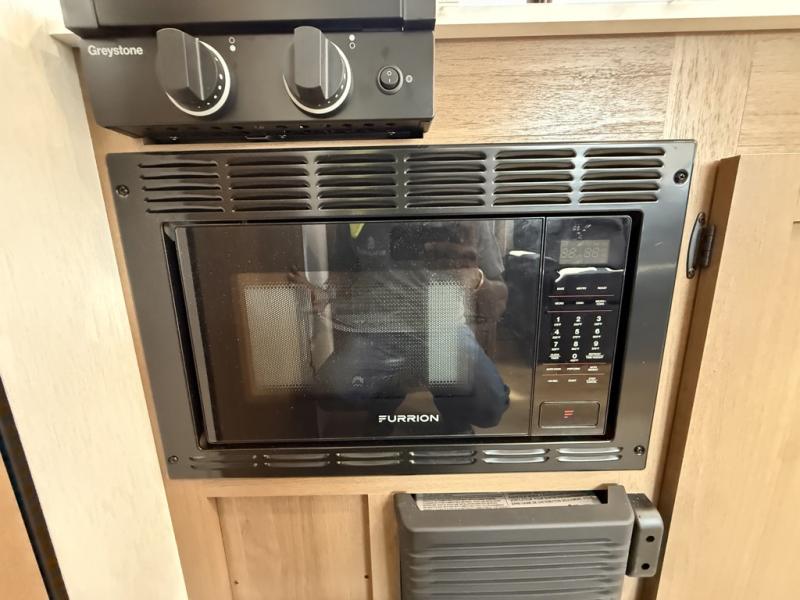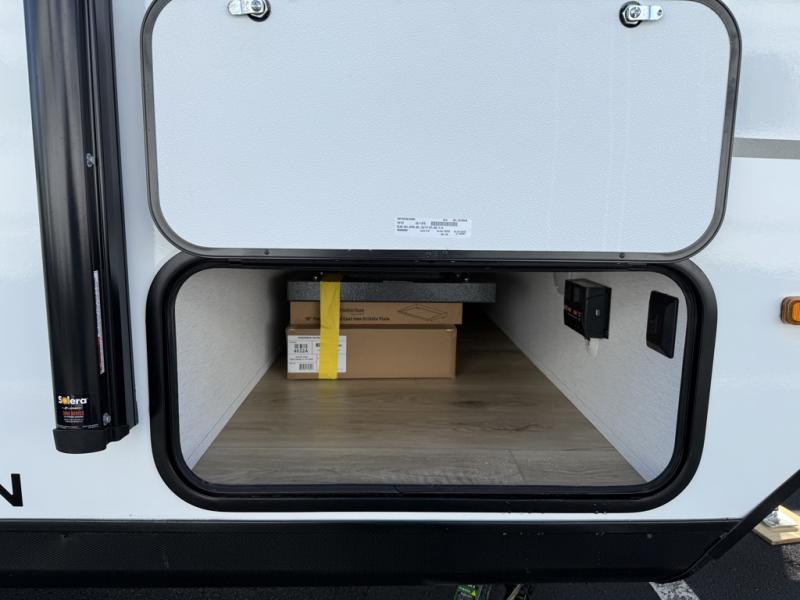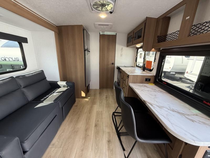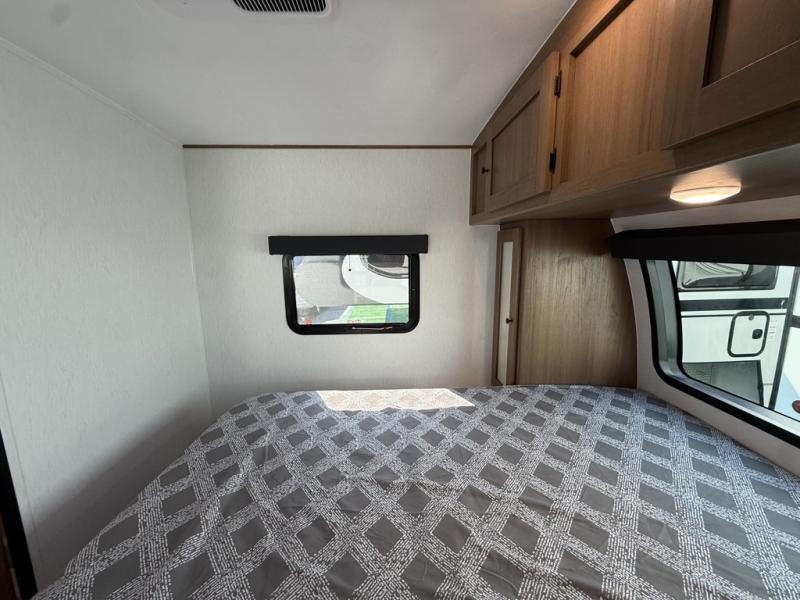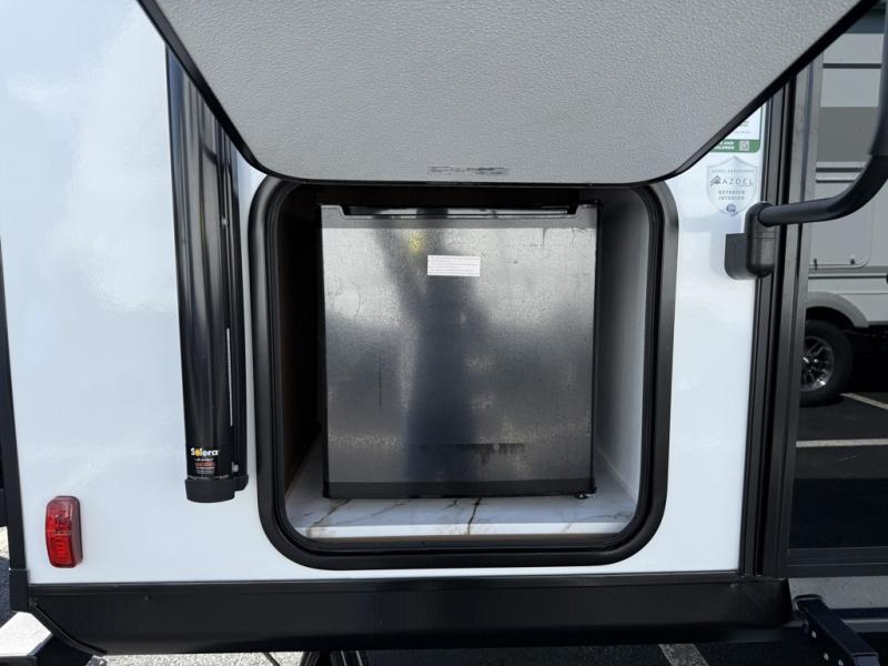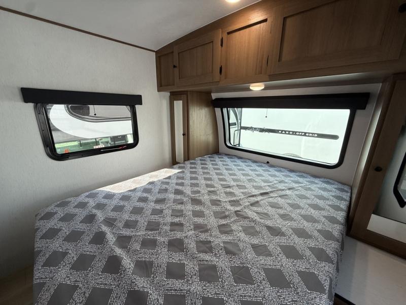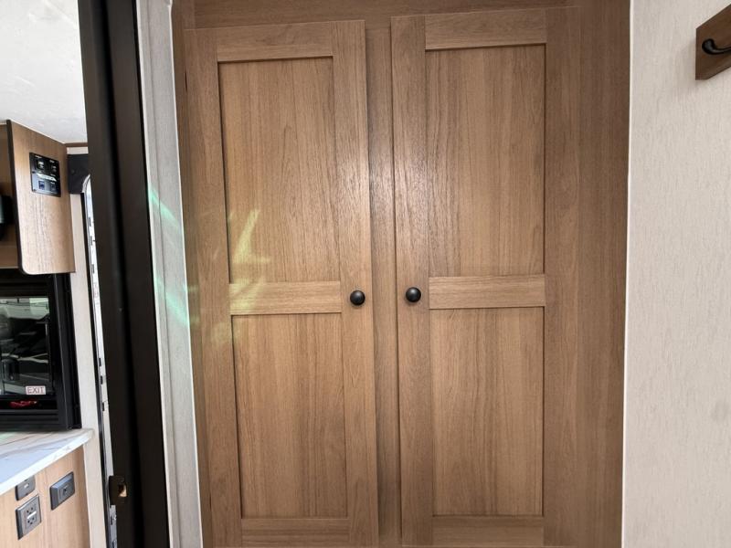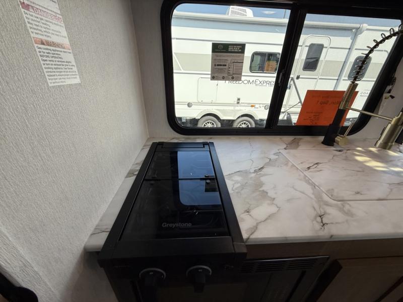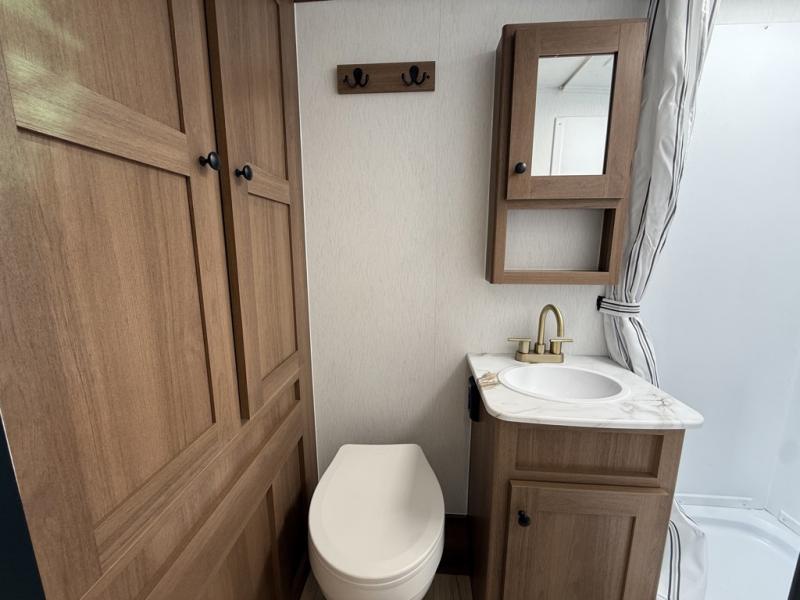 As you enter this travel trailer, you'll find the full rear bathroom designed for comfort and convenience. It features a shower, a skylight for natural light, and an on-demand tankless water heater, ensuring hot showers whenever you need them. A foot flush toilet and a wardrobe offer added practicality and storage for your essentials. Moving to the middle of the trailer, the main living area includes a sofa slide-out nestled between a pantry, perfect for storing snacks and dry goods, and a 10-cu. ft. refrigerator to keep your groceries fresh. Opposite the slide, the kitchen is fully equipped with a 2-burner cooktop and an air fryer microwave, allowing you to prepare meals with ease. Beside the kitchen is a counter with chairs, offering a cozy spot to dine or relax. At the front of the trailer, the private bedroom features a comfortable queen bed and dual wardrobes on either side, giving you a restful retreat with plenty of storage for your clothes and personal items.