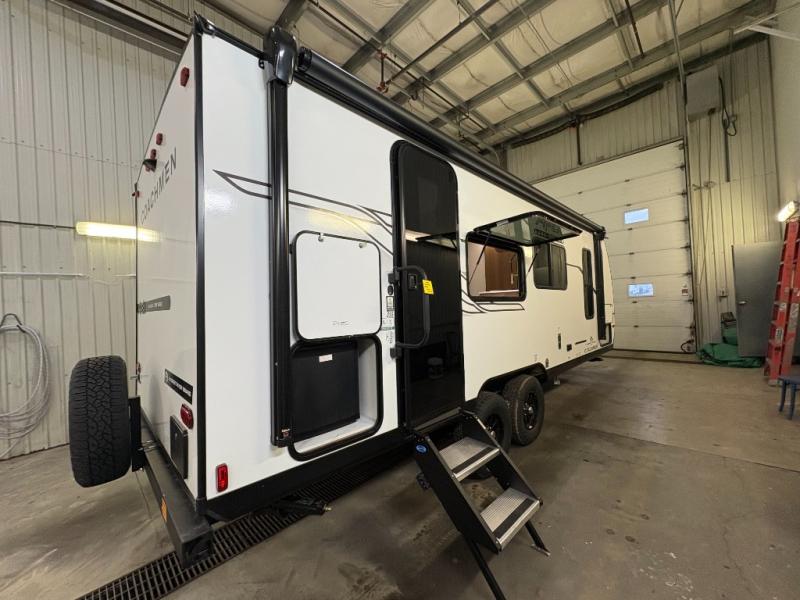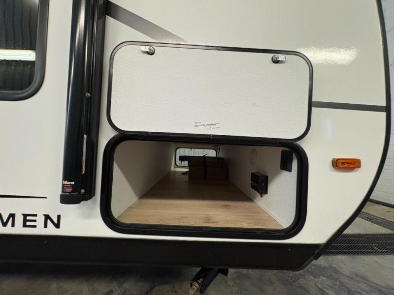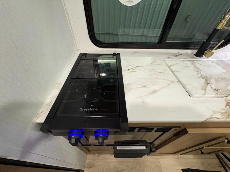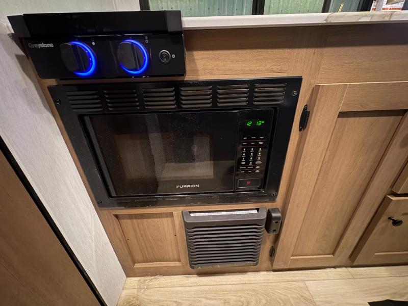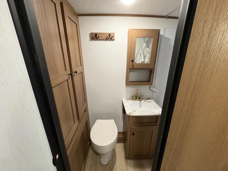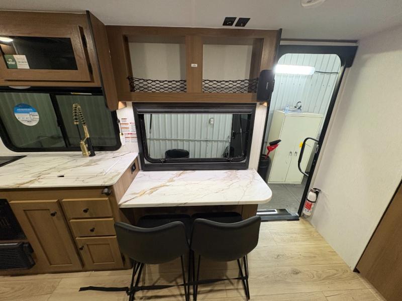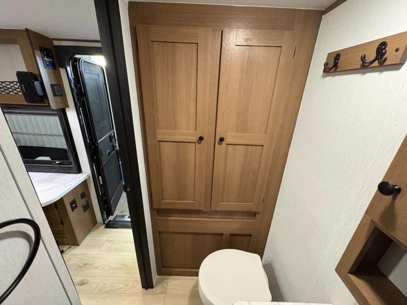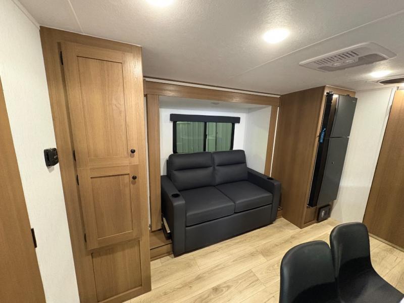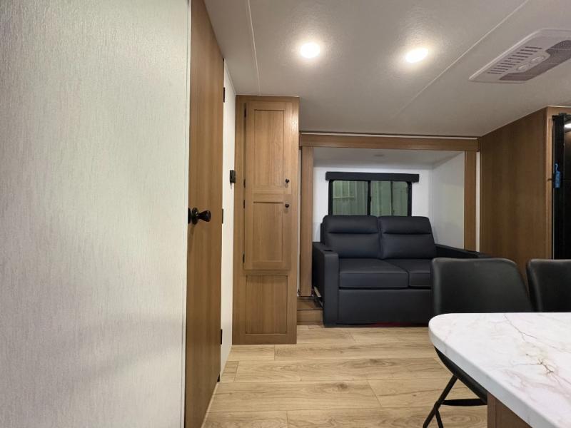 As you enter this travel trailer, you'll find the full rear bathroom designed for comfort and convenience. It features a shower, a skylight for natural light, and an on-demand tankless water heater, ensuring hot showers whenever you need them. A foot flush toilet and a wardrobe offer added practicality and storage for your essentials. Moving to the middle of the trailer, the main living area includes a sofa slide-out nestled between a pantry, perfect for storing snacks and dry goods, and a 10-cu. ft. refrigerator to keep your groceries fresh. Opposite the slide, the kitchen is fully equipped with a 2-burner cooktop and an air fryer microwave, allowing you to prepare meals with ease. Beside the kitchen is a counter with chairs, offering a cozy spot to dine or relax. At the front of the trailer, the private bedroom features a comfortable queen bed and dual wardrobes on either side, giving you a restful retreat with plenty of storage for your clothes and personal items.