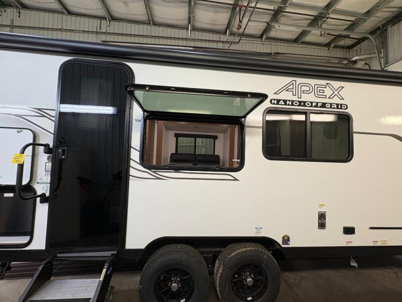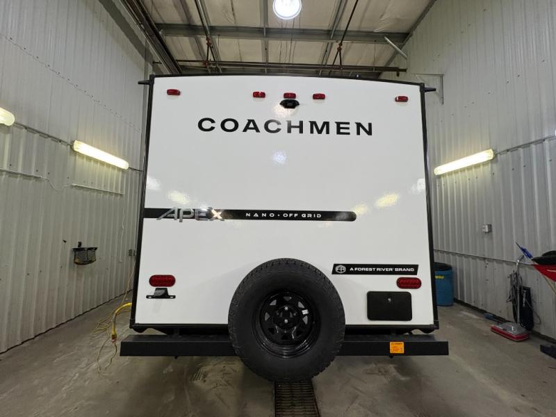 You will find comfort, convenience, and a sturdy construction with each of these Coachmen RV Apex Nano travel trailers! They are held together with an aluma-cage construction, an I-beam chassis, plus vacuum-bonded laminated dual Azdel fiberglass walls for double the protection against the elements. The 400-watt solar panel with a 30-amp control charger is included, along with two 20 lb. LP tanks, a high velocity power roof vent, plus 12V outlets to keep you powered up. More exterior features include a hot/cold shower, four stabilizer jacks, a power awning with LED lighting, and radius thumb latch baggage doors to easily pack and unload your gear. You will love the interior of your Apex Nano with Congoleum residential flooring, one-piece seamless edge countertops, matte black hardware in the galley, and a hand-crafted wood medicine cabinet in the bath.