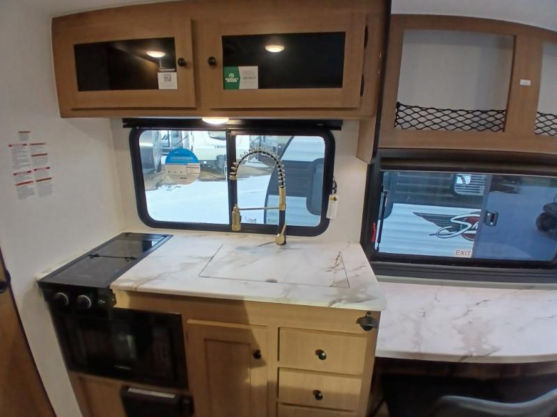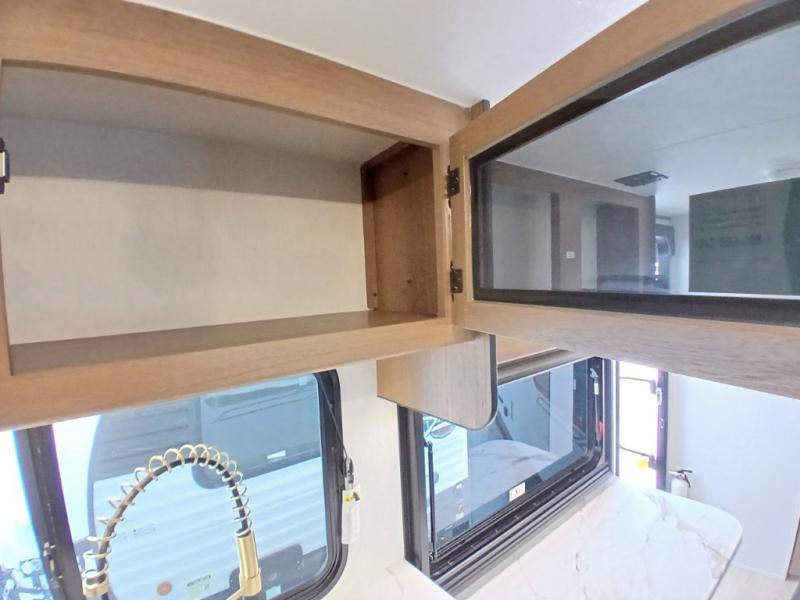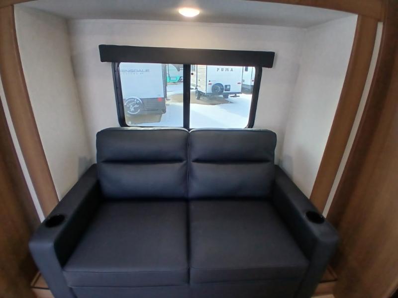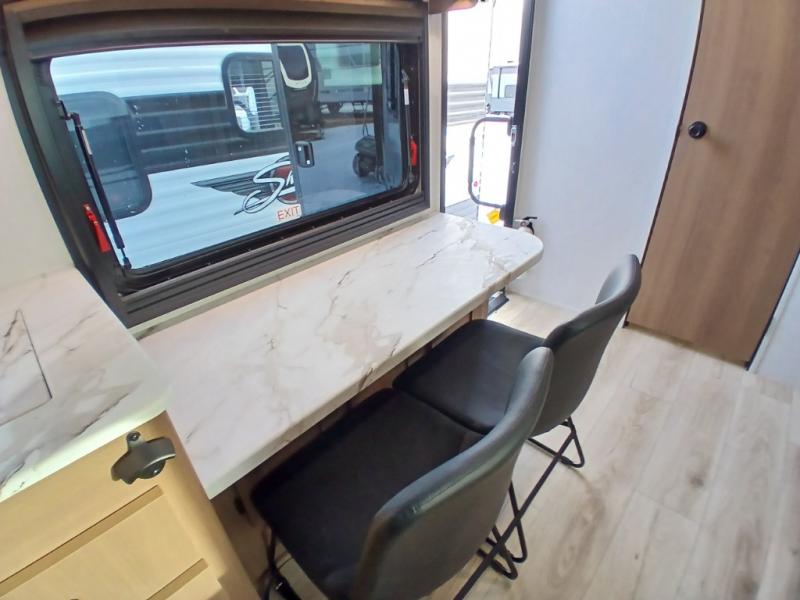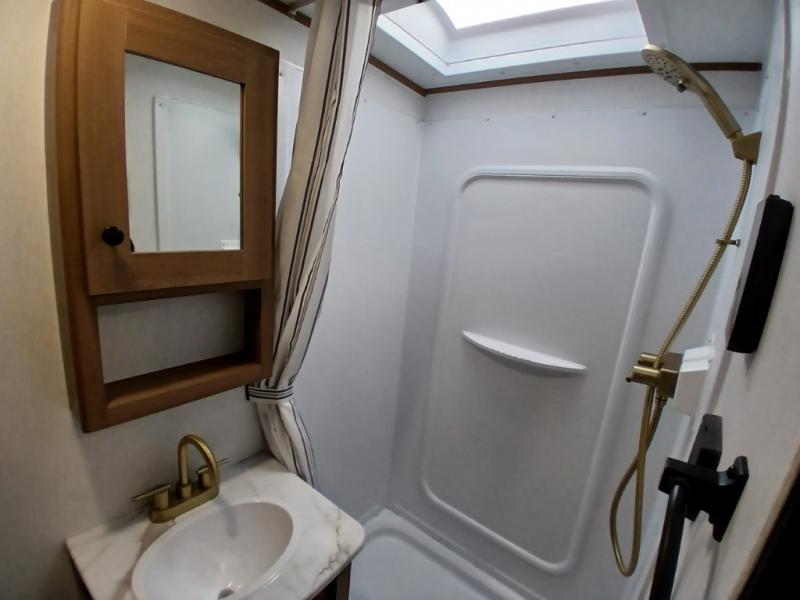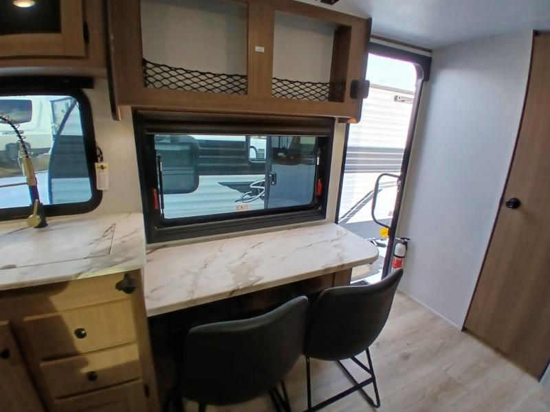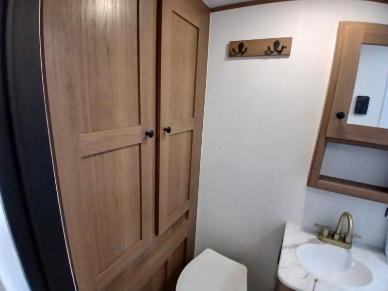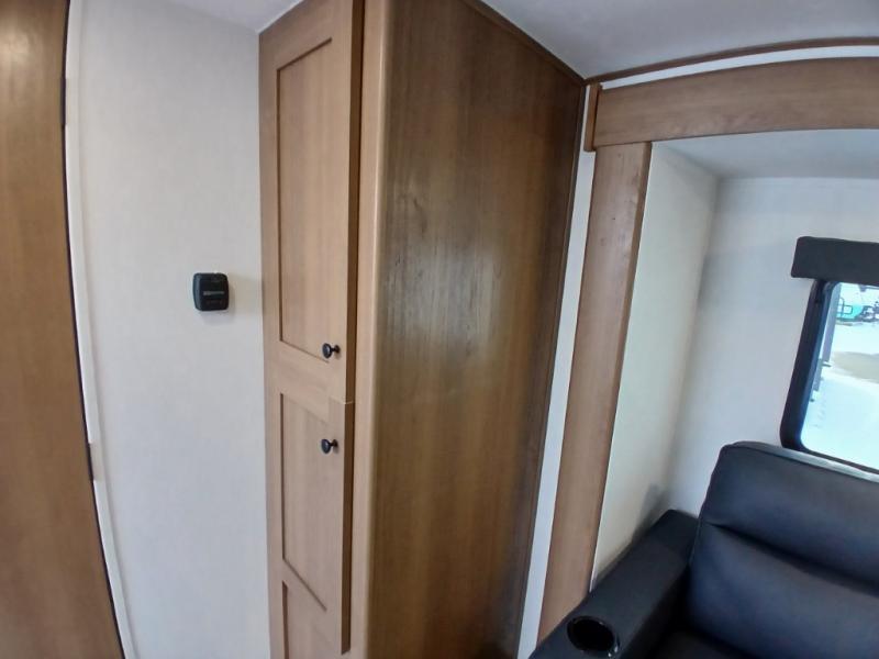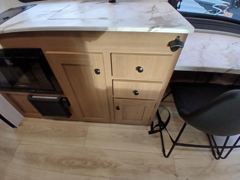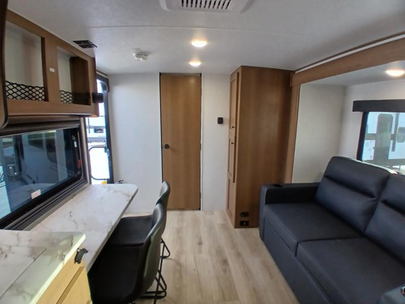 As you enter this travel trailer, you'll find the full rear bathroom designed for comfort and convenience. It features a shower, a skylight for natural light, and an on-demand tankless water heater, ensuring hot showers whenever you need them. A foot flush toilet and a wardrobe offer added practicality and storage for your essentials. Moving to the middle of the trailer, the main living area includes a sofa slide-out nestled between a pantry, perfect for storing snacks and dry goods, and a 10-cu. ft. refrigerator to keep your groceries fresh. Opposite the slide, the kitchen is fully equipped with a 2-burner cooktop and an air fryer microwave, allowing you to prepare meals with ease. Beside the kitchen is a counter with chairs, offering a cozy spot to dine or relax. At the front of the trailer, the private bedroom features a comfortable queen bed and dual wardrobes on either side, giving you a restful retreat with plenty of storage for your clothes and personal items.