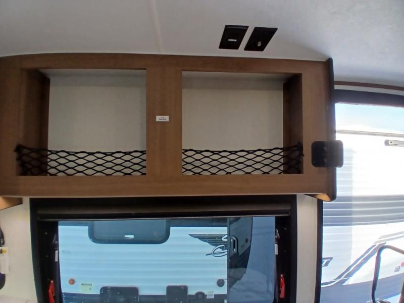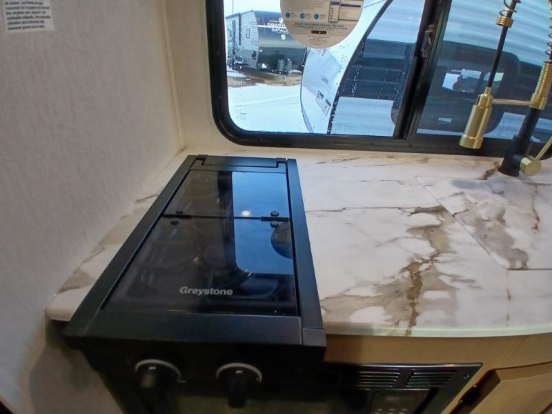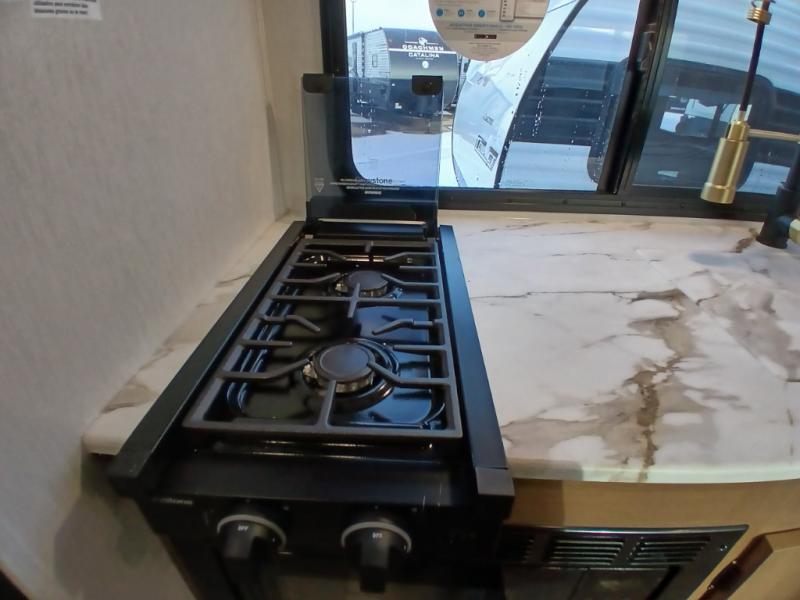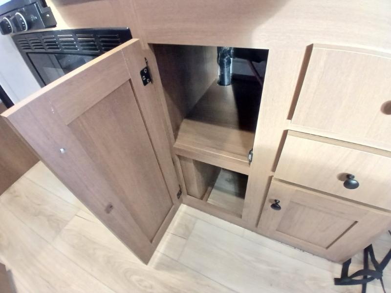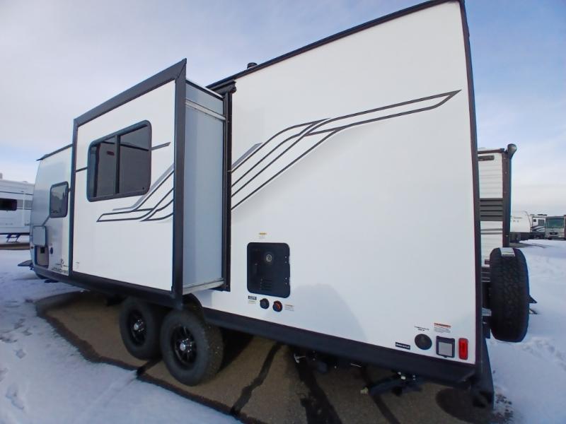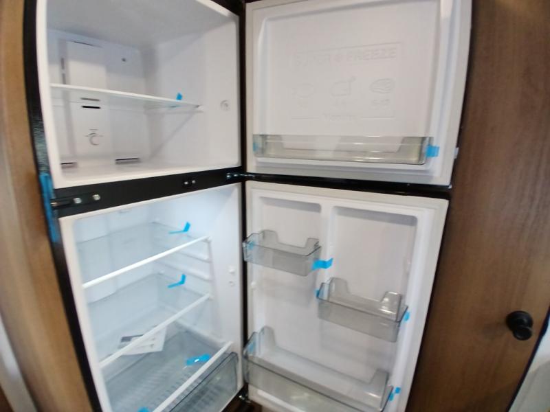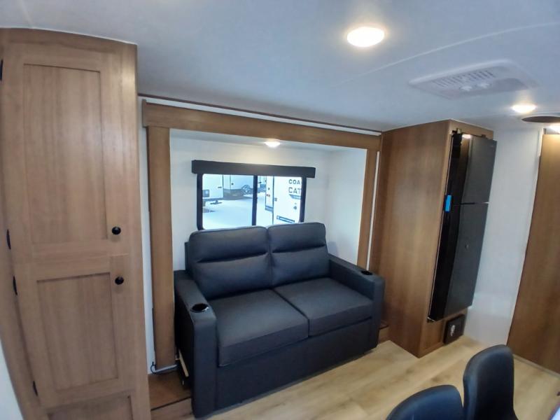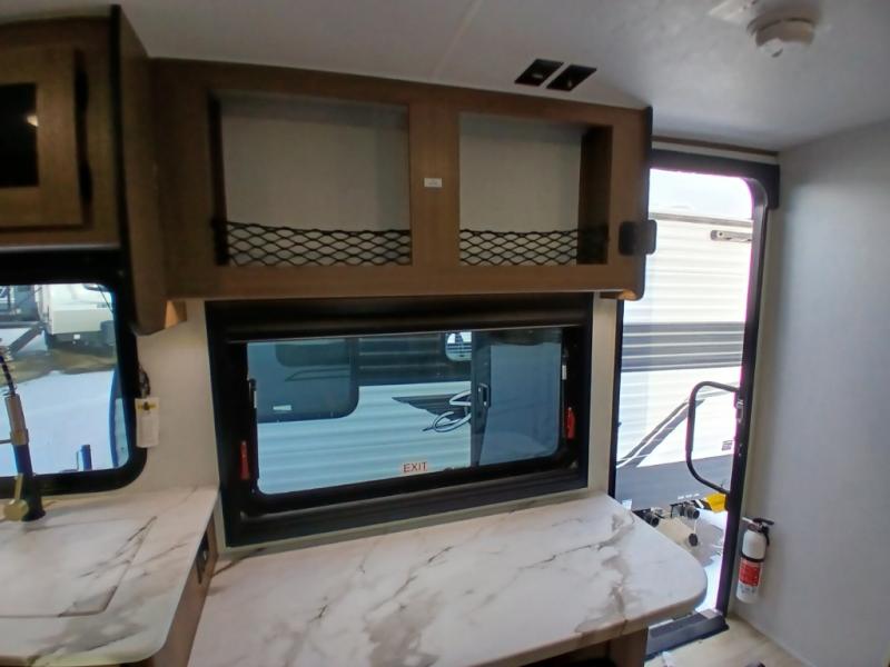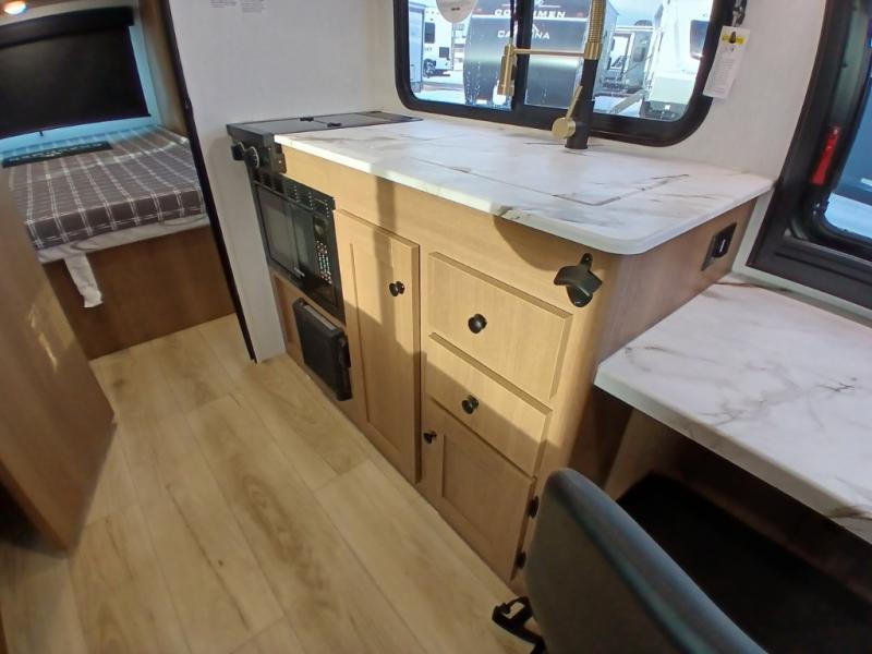 As you enter this travel trailer, you'll find the full rear bathroom designed for comfort and convenience. It features a shower, a skylight for natural light, and an on-demand tankless water heater, ensuring hot showers whenever you need them. A foot flush toilet and a wardrobe offer added practicality and storage for your essentials. Moving to the middle of the trailer, the main living area includes a sofa slide-out nestled between a pantry, perfect for storing snacks and dry goods, and a 10-cu. ft. refrigerator to keep your groceries fresh. Opposite the slide, the kitchen is fully equipped with a 2-burner cooktop and an air fryer microwave, allowing you to prepare meals with ease. Beside the kitchen is a counter with chairs, offering a cozy spot to dine or relax. At the front of the trailer, the private bedroom features a comfortable queen bed and dual wardrobes on either side, giving you a restful retreat with plenty of storage for your clothes and personal items.