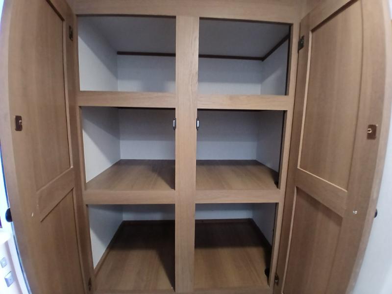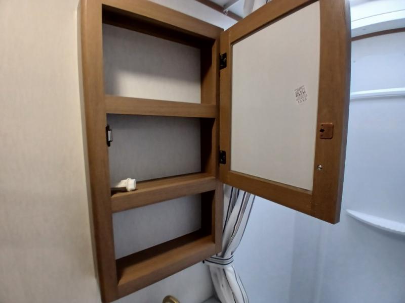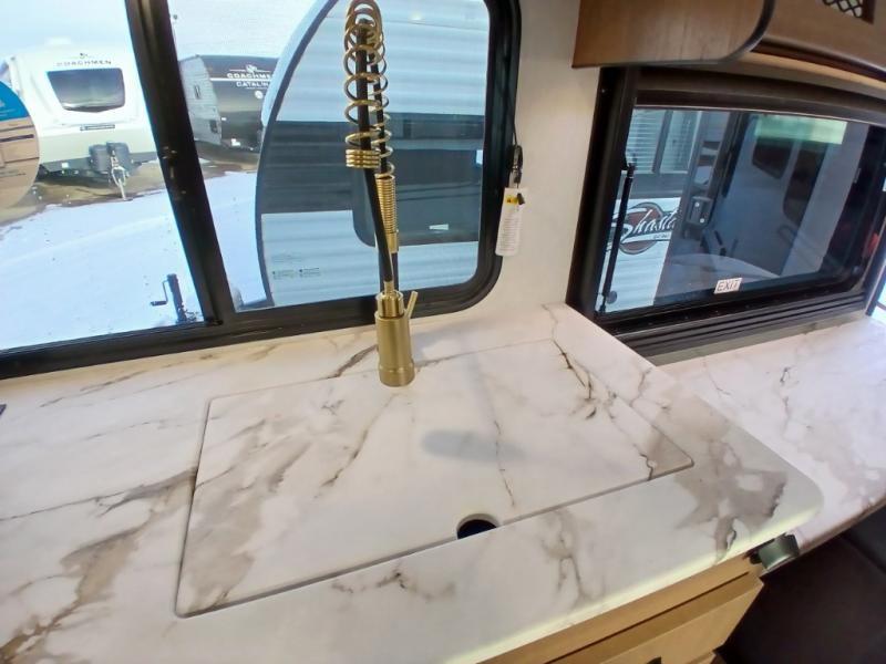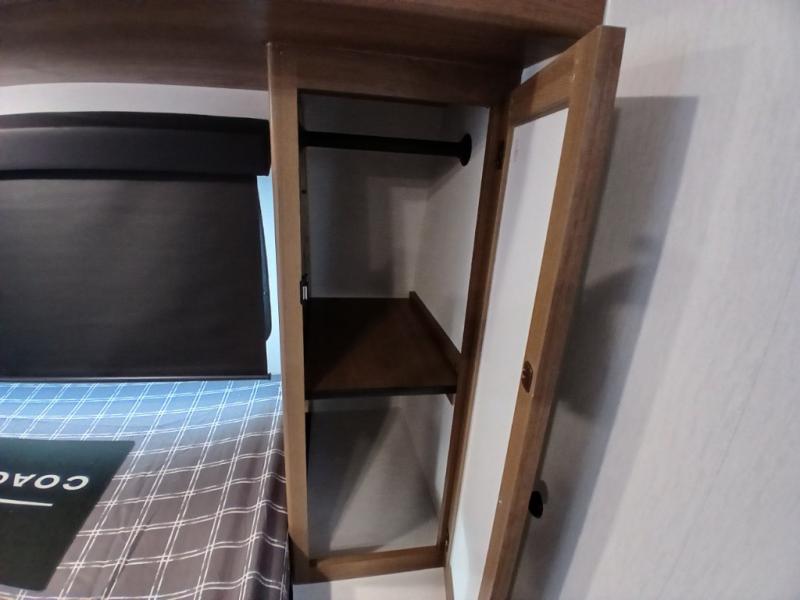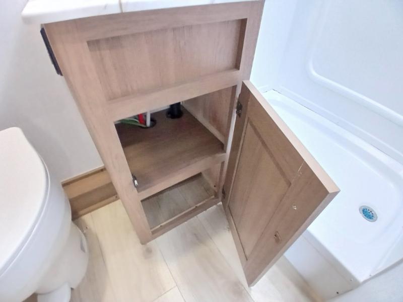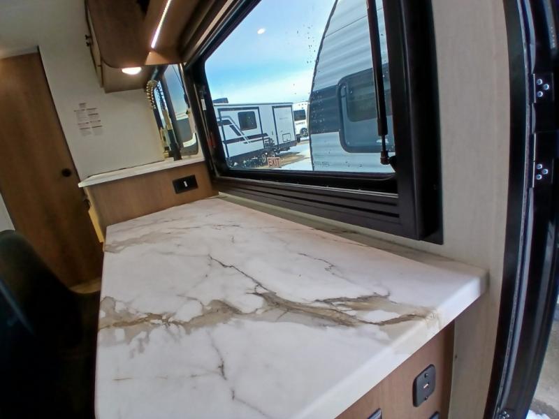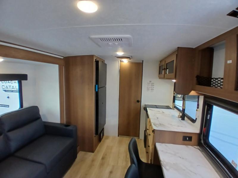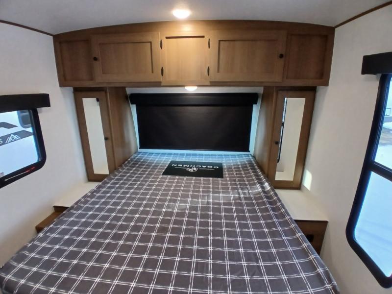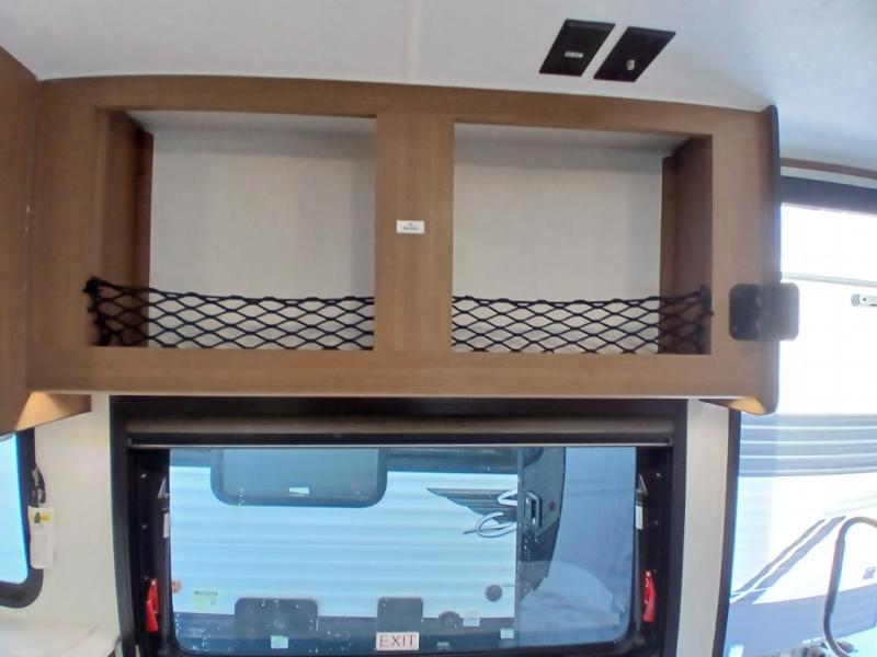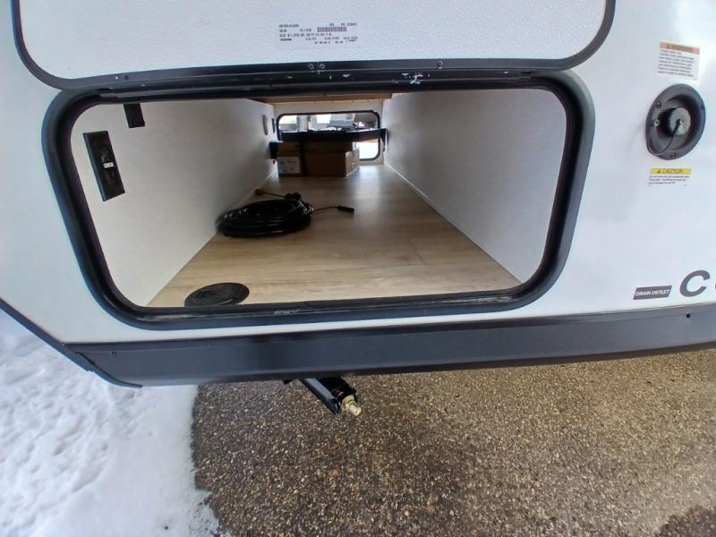 As you enter this travel trailer, you'll find the full rear bathroom designed for comfort and convenience. It features a shower, a skylight for natural light, and an on-demand tankless water heater, ensuring hot showers whenever you need them. A foot flush toilet and a wardrobe offer added practicality and storage for your essentials. Moving to the middle of the trailer, the main living area includes a sofa slide-out nestled between a pantry, perfect for storing snacks and dry goods, and a 10-cu. ft. refrigerator to keep your groceries fresh. Opposite the slide, the kitchen is fully equipped with a 2-burner cooktop and an air fryer microwave, allowing you to prepare meals with ease. Beside the kitchen is a counter with chairs, offering a cozy spot to dine or relax. At the front of the trailer, the private bedroom features a comfortable queen bed and dual wardrobes on either side, giving you a restful retreat with plenty of storage for your clothes and personal items.