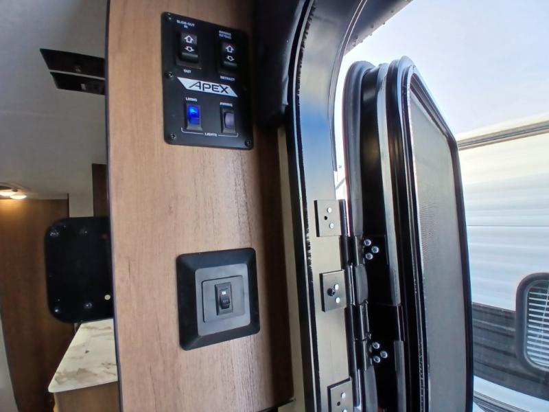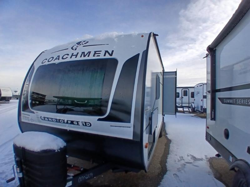You will find comfort, convenience, and a sturdy construction with each of these Coachmen RV Apex Nano travel trailers! They are held together with an aluma-cage construction, an I-beam chassis, plus vacuum-bonded laminated dual Azdel fiberglass walls for double the protection against the elements. The 400-watt solar panel with a 30-amp control charger is included, along with two 20 lb. LP tanks, a high velocity power roof vent, plus 12V outlets to keep you powered up. More exterior features include a hot/cold shower, four stabilizer jacks, a power awning with LED lighting, and radius thumb latch baggage doors to easily pack and unload your gear. You will love the interior of your Apex Nano with Congoleum residential flooring, one-piece seamless edge countertops, matte black hardware in the galley, and a hand-crafted wood medicine cabinet in the bath.