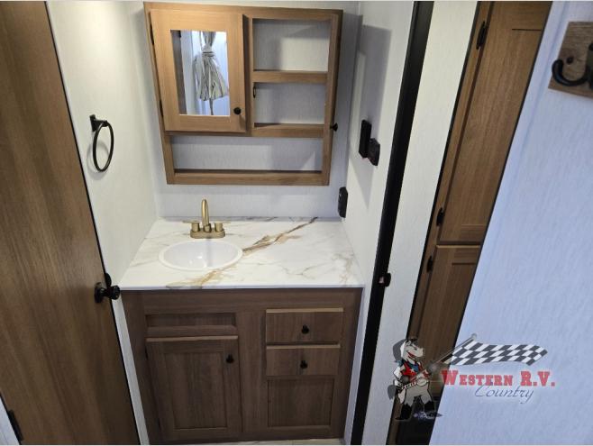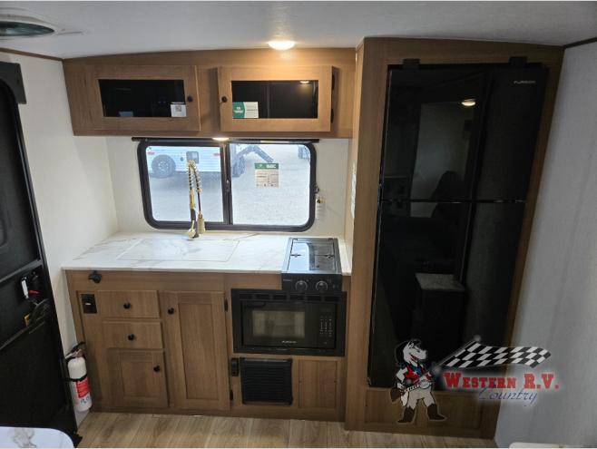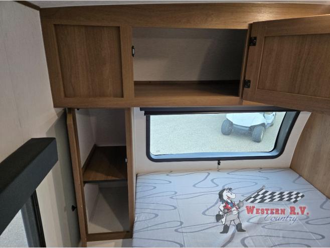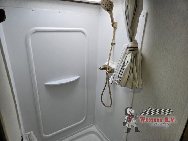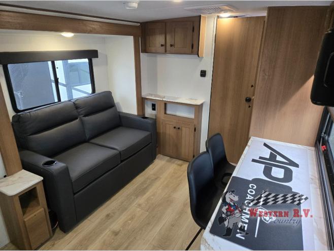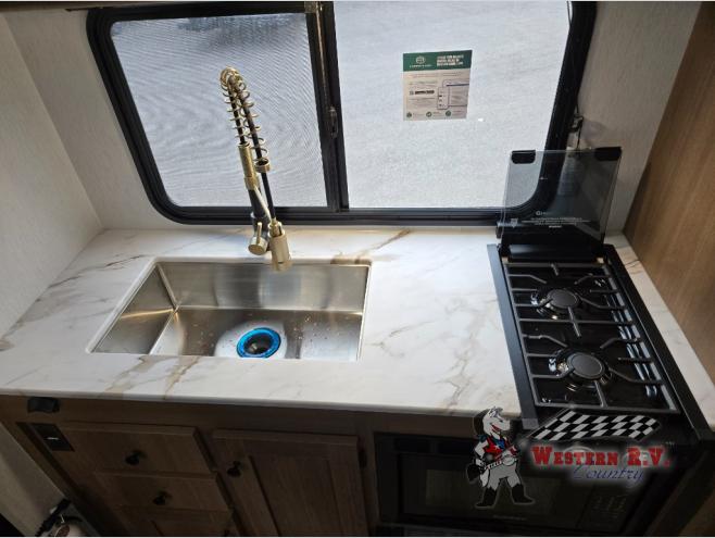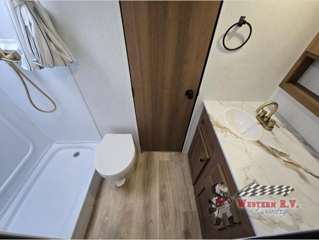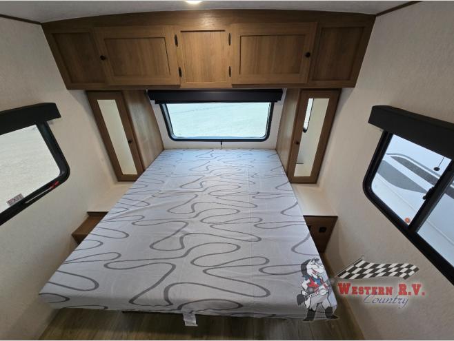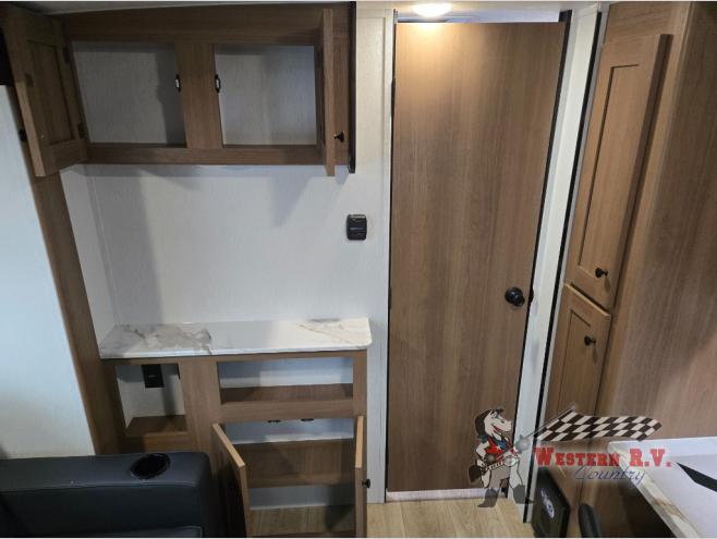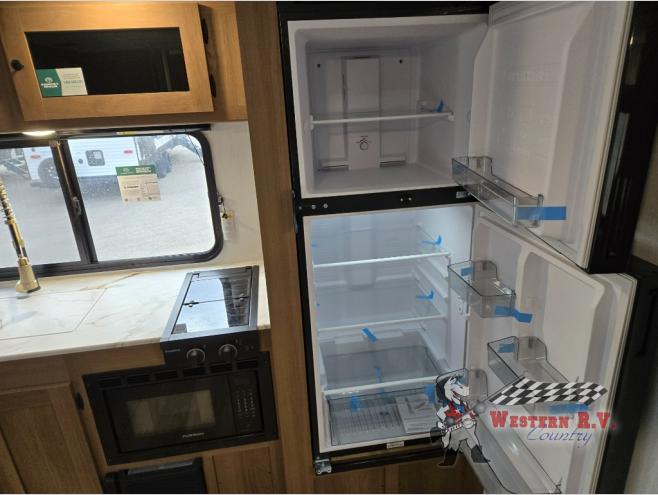 As you enter this travel trailer, you'll find the full rear bathroom designed for comfort and convenience. It features a shower, a skylight for natural light, and an on-demand tankless water heater, ensuring hot showers whenever you need them. A foot flush toilet and a wardrobe offer added practicality and storage for your essentials. Moving to the middle of the trailer, the main living area includes a sofa slide-out nestled between a pantry, perfect for storing snacks and dry goods, and a 10-cu. ft. refrigerator to keep your groceries fresh. Opposite the slide, the kitchen is fully equipped with a 2-burner cooktop and an air fryer microwave, allowing you to prepare meals with ease. Beside the kitchen is a counter with chairs, offering a cozy spot to dine or relax. At the front of the trailer, the private bedroom features a comfortable queen bed and dual wardrobes on either side, giving you a restful retreat with plenty of storage for your clothes and personal items.