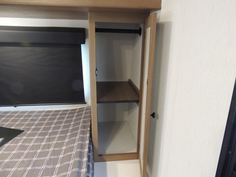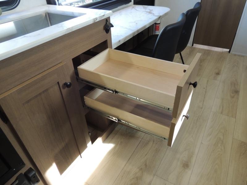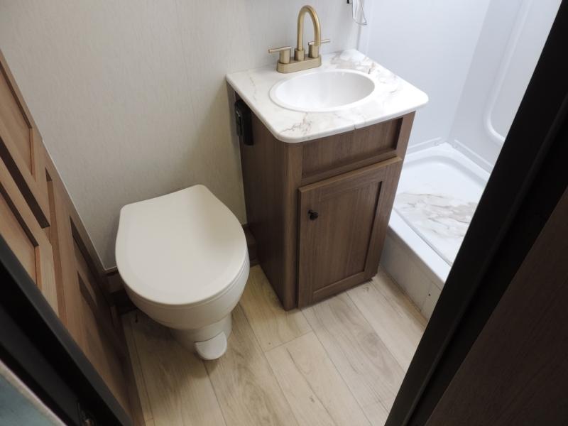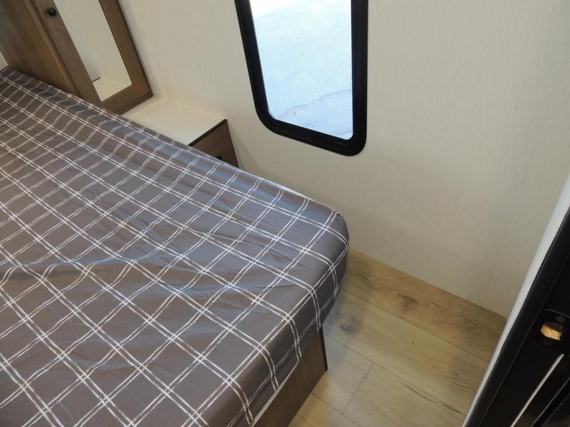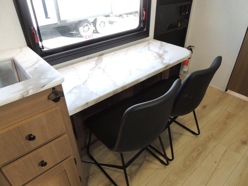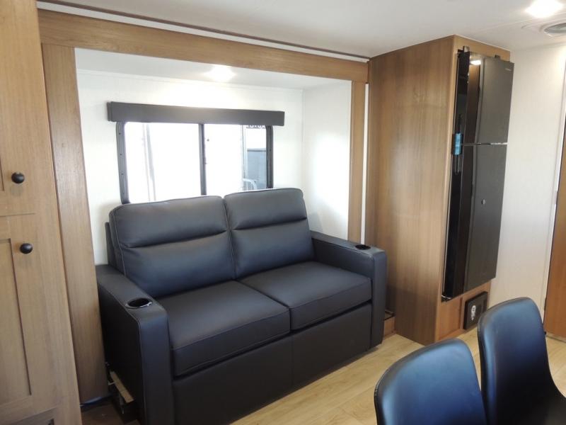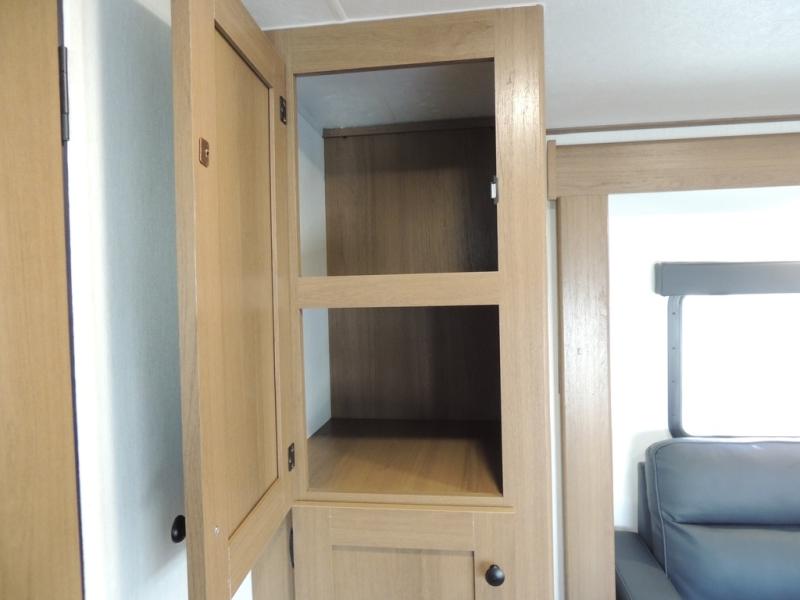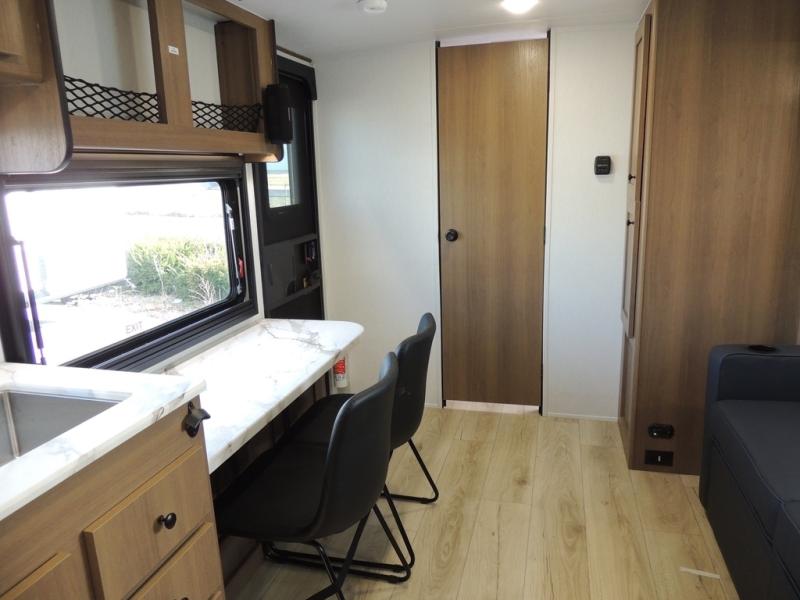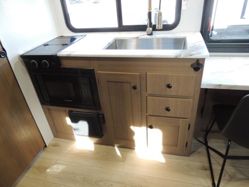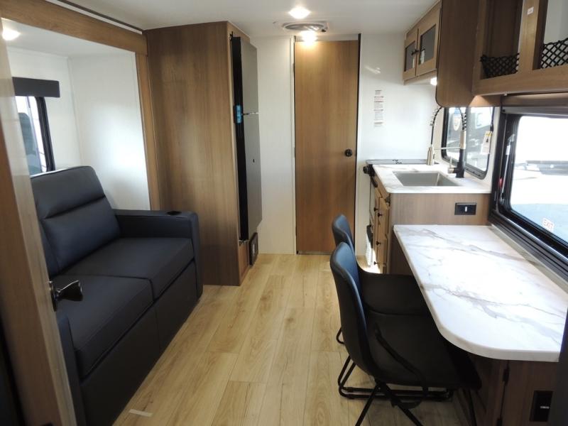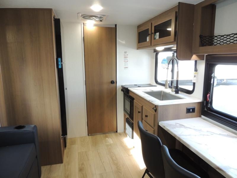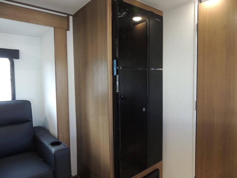 As you enter this travel trailer, you'll find the full rear bathroom designed for comfort and convenience. It features a shower, a skylight for natural light, and an on-demand tankless water heater, ensuring hot showers whenever you need them. A foot flush toilet and a wardrobe offer added practicality and storage for your essentials. Moving to the middle of the trailer, the main living area includes a sofa slide-out nestled between a pantry, perfect for storing snacks and dry goods, and a 10-cu. ft. refrigerator to keep your groceries fresh. Opposite the slide, the kitchen is fully equipped with a 2-burner cooktop and an air fryer microwave, allowing you to prepare meals with ease. Beside the kitchen is a counter with chairs, offering a cozy spot to dine or relax. At the front of the trailer, the private bedroom features a comfortable queen bed and dual wardrobes on either side, giving you a restful retreat with plenty of storage for your clothes and personal items.