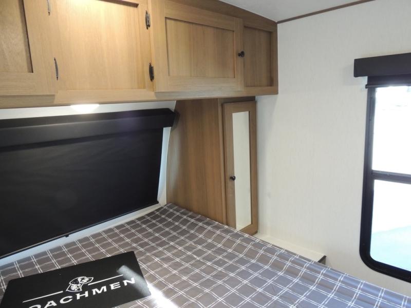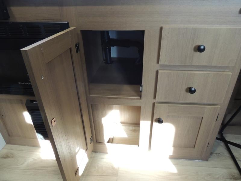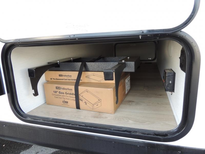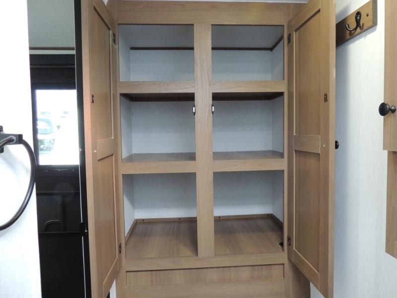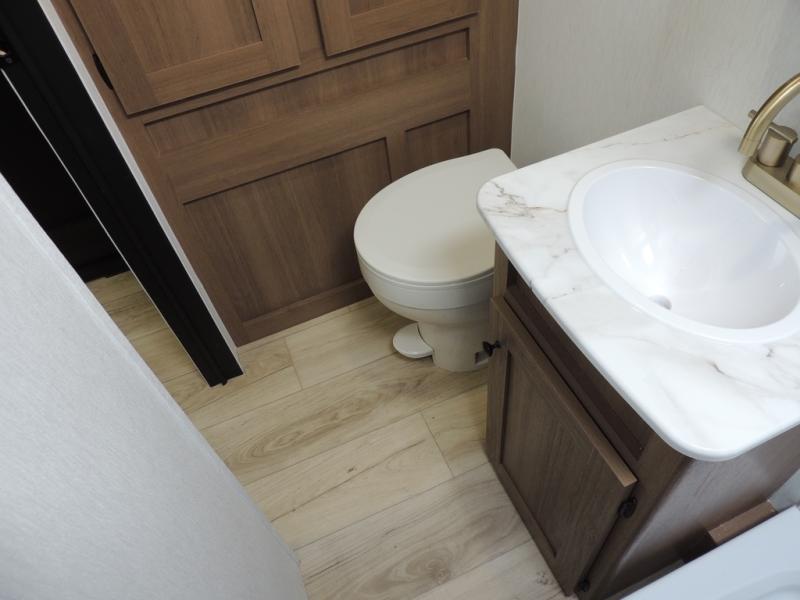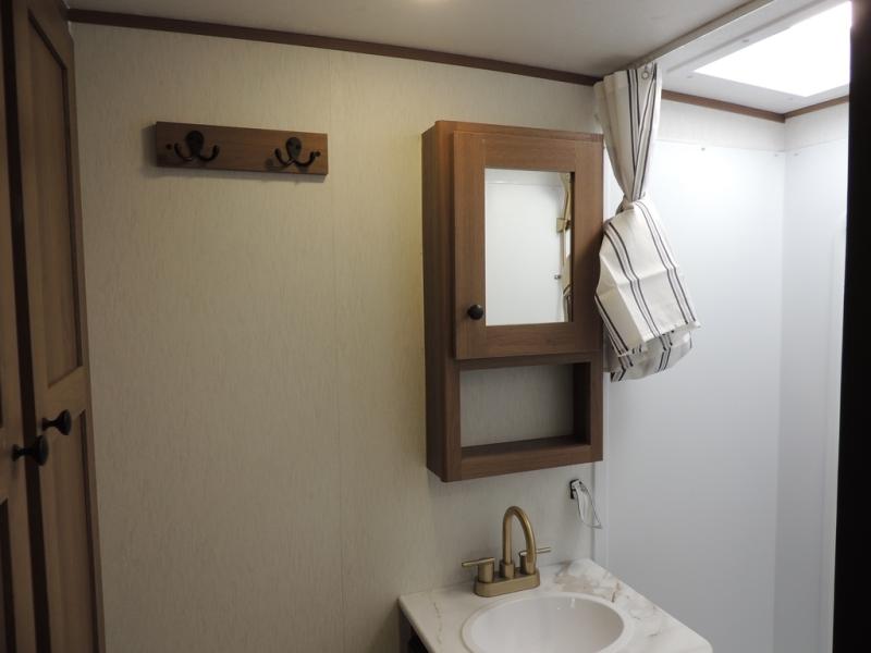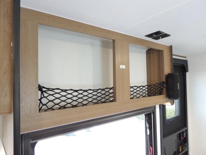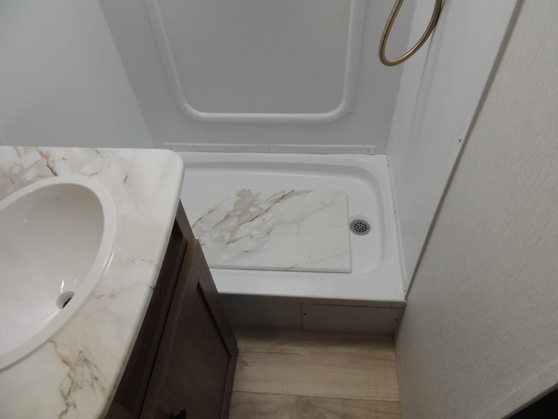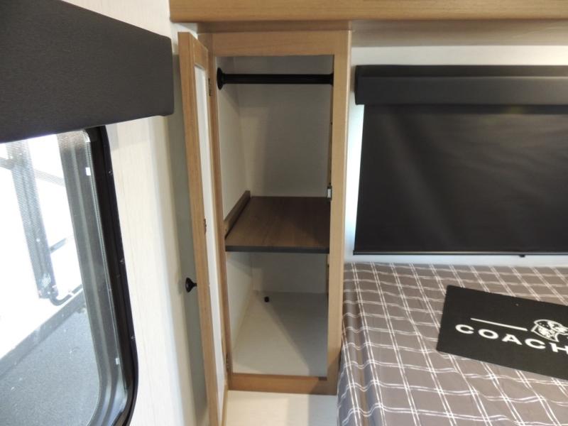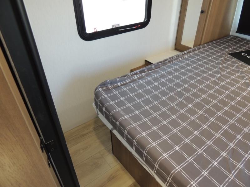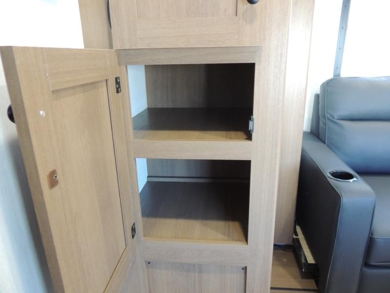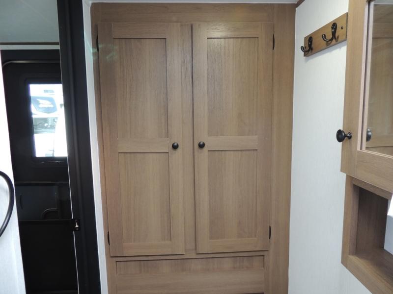 As you enter this travel trailer, you'll find the full rear bathroom designed for comfort and convenience. It features a shower, a skylight for natural light, and an on-demand tankless water heater, ensuring hot showers whenever you need them. A foot flush toilet and a wardrobe offer added practicality and storage for your essentials. Moving to the middle of the trailer, the main living area includes a sofa slide-out nestled between a pantry, perfect for storing snacks and dry goods, and a 10-cu. ft. refrigerator to keep your groceries fresh. Opposite the slide, the kitchen is fully equipped with a 2-burner cooktop and an air fryer microwave, allowing you to prepare meals with ease. Beside the kitchen is a counter with chairs, offering a cozy spot to dine or relax. At the front of the trailer, the private bedroom features a comfortable queen bed and dual wardrobes on either side, giving you a restful retreat with plenty of storage for your clothes and personal items.