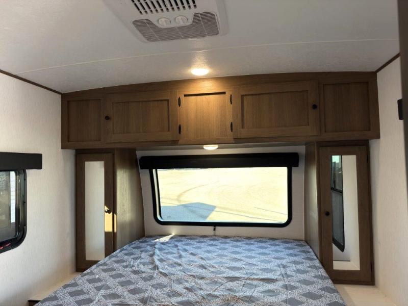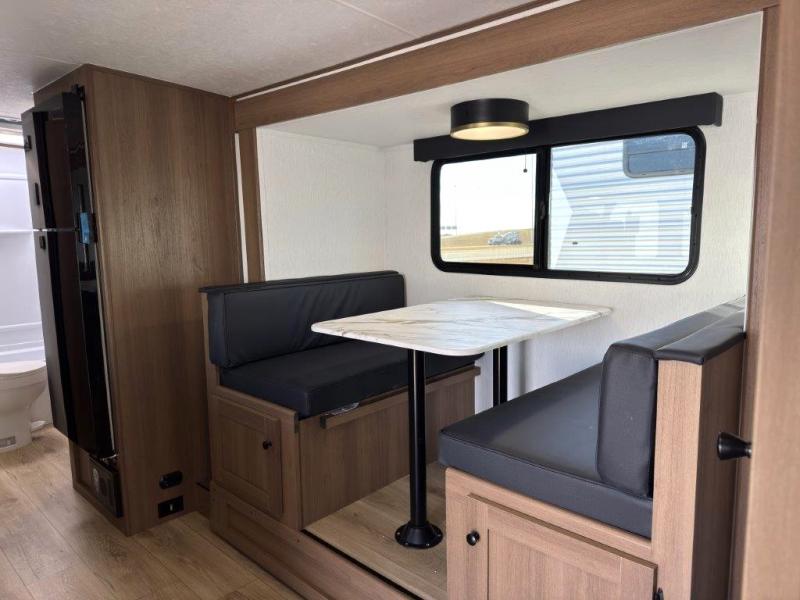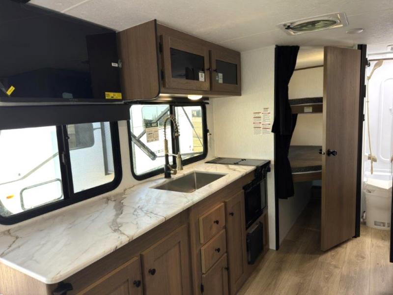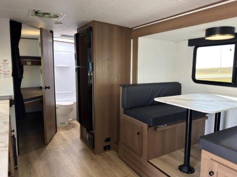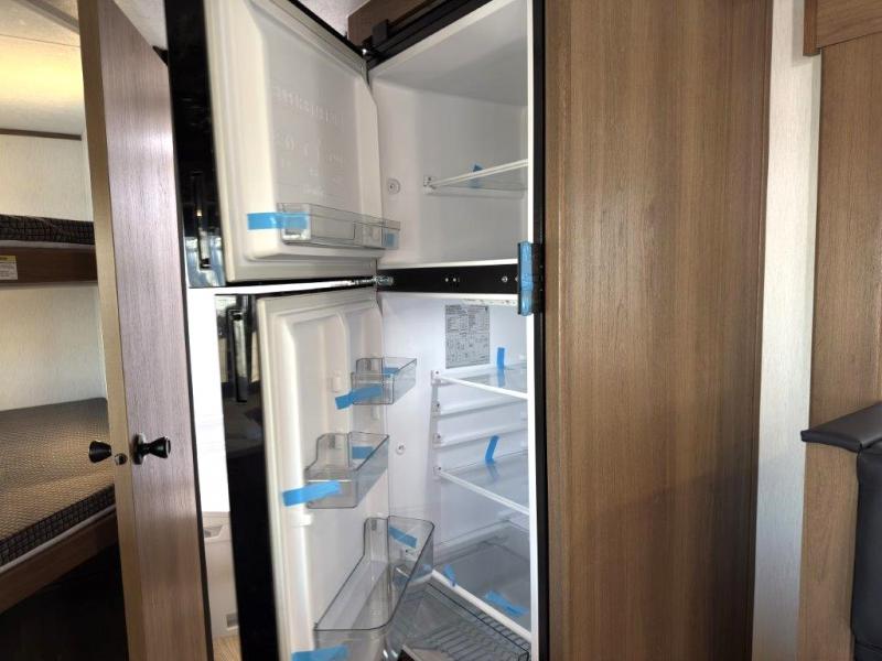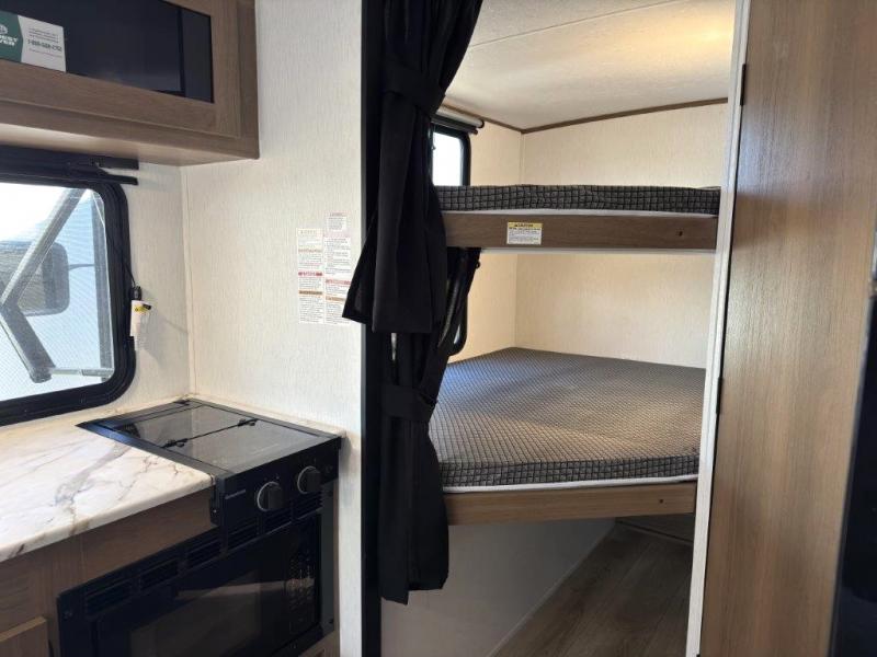As you step into this trailer, you're welcomed by a private front bedroom featuring a comfortable queen bed, perfect for a restful night's sleep, in between dual wardrobes to neatly store your clothes and essentials. Moving to the center of the space, the dinette nestled in the slide-out offers a cozy spot to dine, gather, or convert into an extra-sleeping area if needed. Just beside it, the 10-cu. ft. refrigerator provides ample space to keep your groceries fresh. Opposite the dinette, the fully equipped kitchen makes cooking on the road a breeze, complete with a stainless-steel sink with a flush-mount cover, an air fryer microwave, and a two-burner cooktop. Toward the rear, you’ll find 48" x 74" double bed bunks, with the lower bunk able to flip up for added flexibility, perfect for accommodating the whole crew. Adjacent to the bunks, a full bathroom adds extra convenience, eliminating the need to rely on campground facilities.