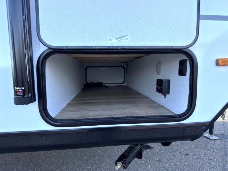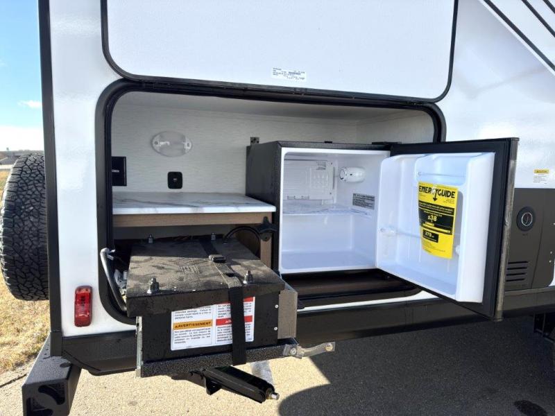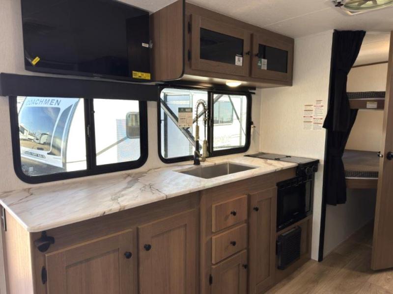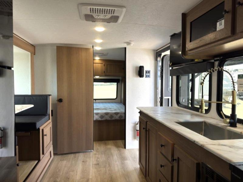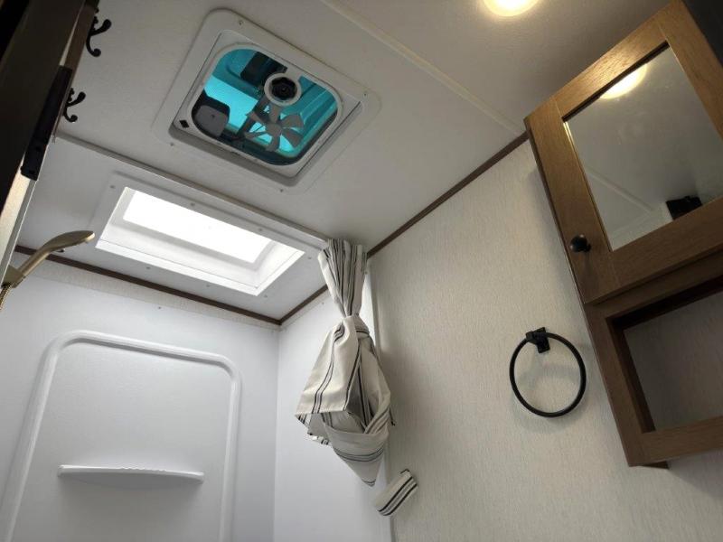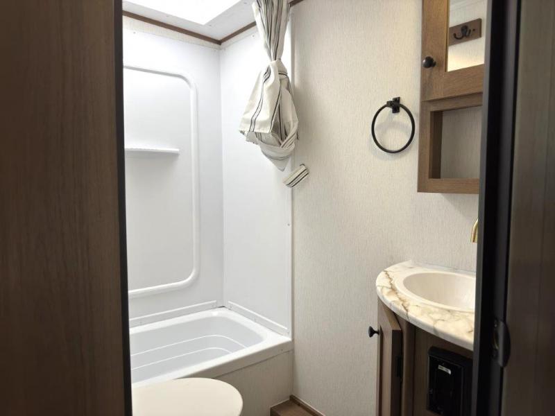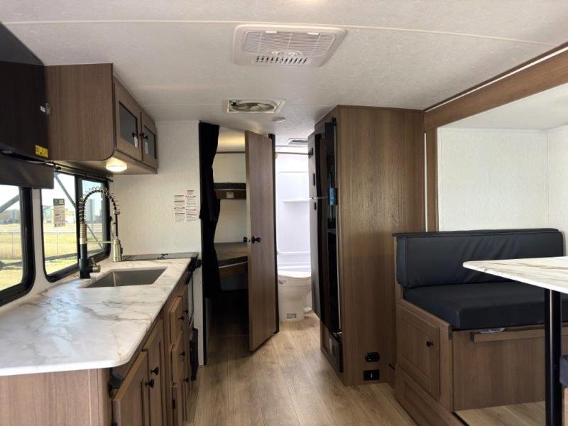 As you step into this trailer, you're welcomed by a private front bedroom featuring a comfortable queen bed, perfect for a restful night's sleep, in between dual wardrobes to neatly store your clothes and essentials. Moving to the center of the space, the dinette nestled in the slide-out offers a cozy spot to dine, gather, or convert into an extra-sleeping area if needed. Just beside it, the 10-cu. ft. refrigerator provides ample space to keep your groceries fresh. Opposite the dinette, the fully equipped kitchen makes cooking on the road a breeze, complete with a stainless-steel sink with a flush-mount cover, an air fryer microwave, and a two-burner cooktop. Toward the rear, you’ll find 48" x 74" double bed bunks, with the lower bunk able to flip up for added flexibility, perfect for accommodating the whole crew. Adjacent to the bunks, a full bathroom adds extra convenience, eliminating the need to rely on campground facilities.