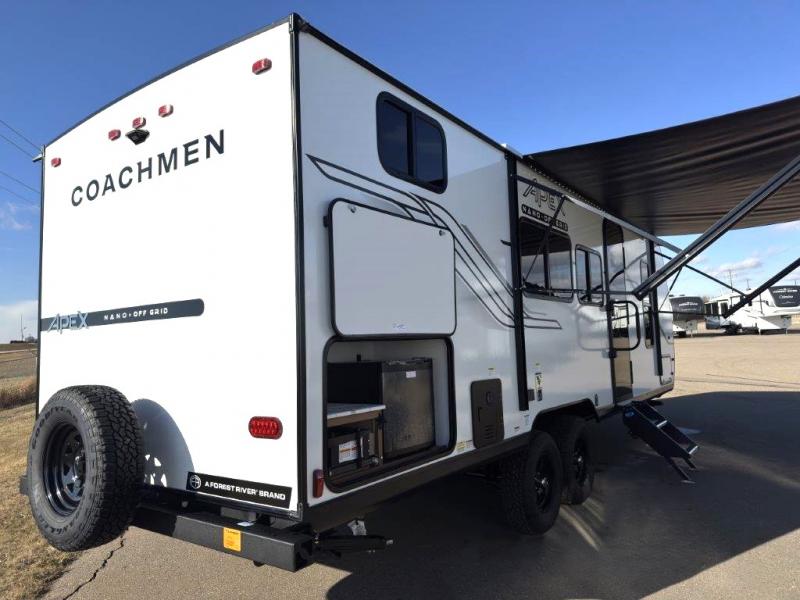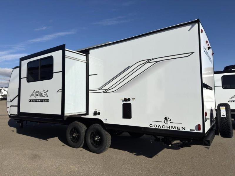 You will find comfort, convenience, and a sturdy construction with each of these Coachmen RV Apex Nano travel trailers! They are held together with an aluma-cage construction, an I-beam chassis, plus vacuum-bonded laminated dual Azdel fiberglass walls for double the protection against the elements. The 400-watt solar panel with a 30-amp control charger is included, along with two 20 lb. LP tanks, a high velocity power roof vent, plus 12V outlets to keep you powered up. More exterior features include a hot/cold shower, four stabilizer jacks, a power awning with LED lighting, and radius thumb latch baggage doors to easily pack and unload your gear. You will love the interior of your Apex Nano with Congoleum residential flooring, one-piece seamless edge countertops, matte black hardware in the galley, and a hand-crafted wood medicine cabinet in the bath.