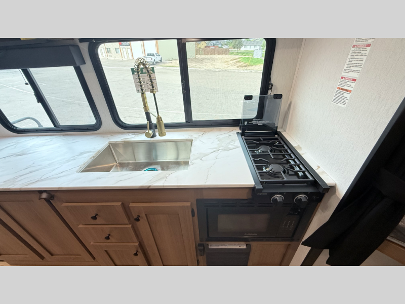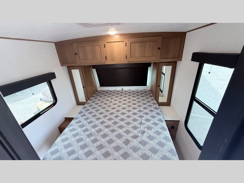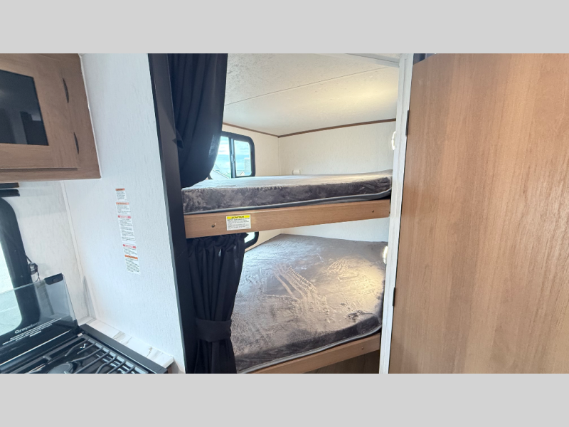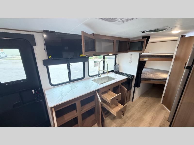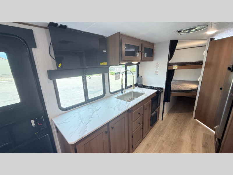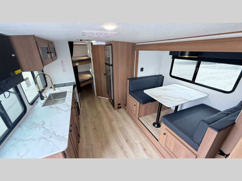 Lightweight laminated fiberglass build with Azdel composite (no wood rot!). Sleeps up to 8 with double-over-double bunks, a private front queen bedroom, and a large U-shaped dinette slide. Full kitchen inside plus an outdoor camp kitchen, power awning, and tons of storage. Solar-ready, enclosed underbelly, and half-ton towable — perfect balance of comfort, quality, and value for family adventures!