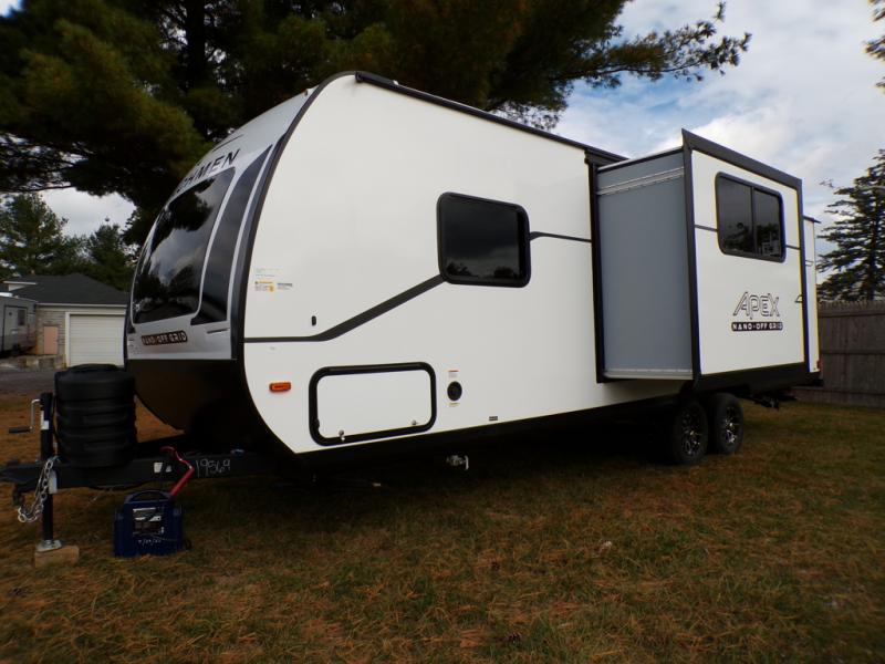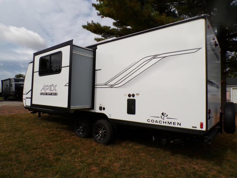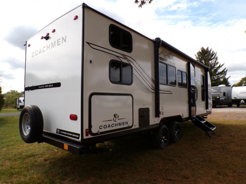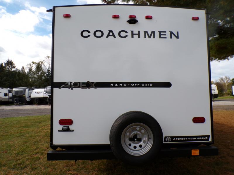 You will find comfort, convenience, and a sturdy construction with each of these Coachmen RV Apex Nano travel trailers! They are held together with an aluma-cage construction, an I-beam chassis, plus vacuum-bonded laminated dual Azdel fiberglass walls for double the protection against the elements. The 400-watt solar panel with a 30-amp control charger is included, along with two 20 lb. LP tanks, a high velocity power roof vent, plus 12V outlets to keep you powered up. More exterior features include a hot/cold shower, four stabilizer jacks, a power awning with LED lighting, and radius thumb latch baggage doors to easily pack and unload your gear. You will love the interior of your Apex Nano with Congoleum residential flooring, one-piece seamless edge countertops, matte black hardware in the galley, and a hand-crafted wood medicine cabinet in the bath.