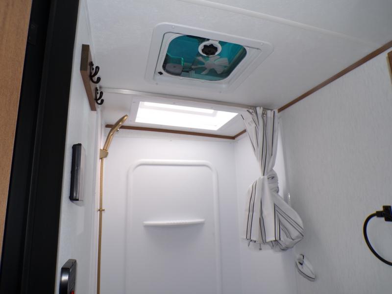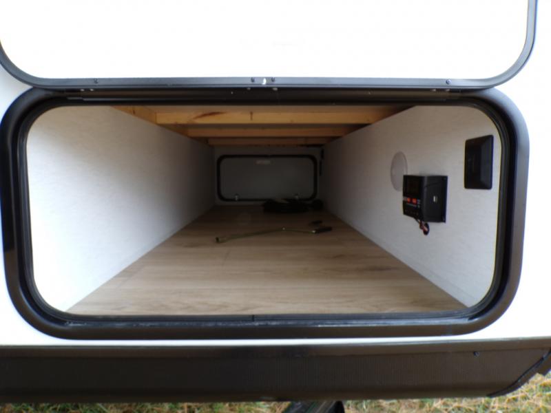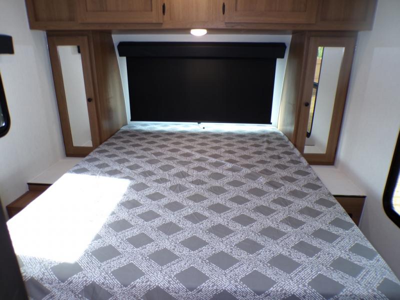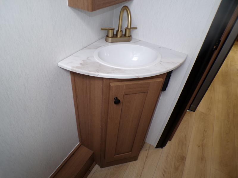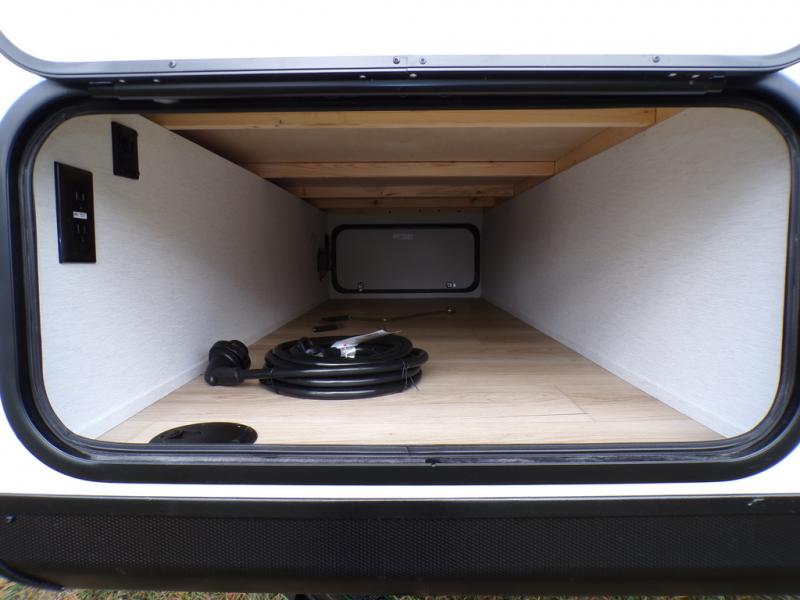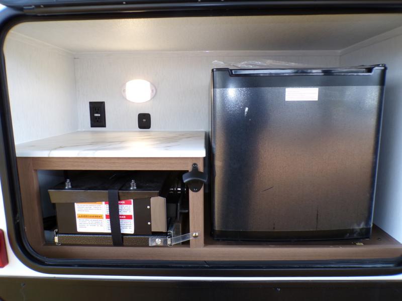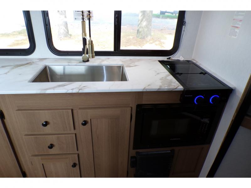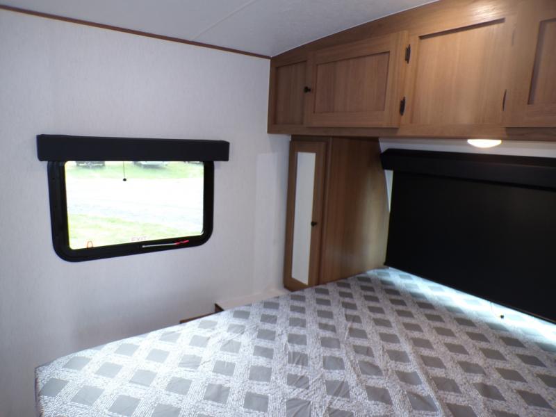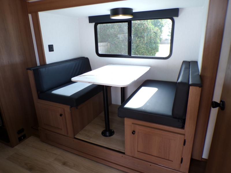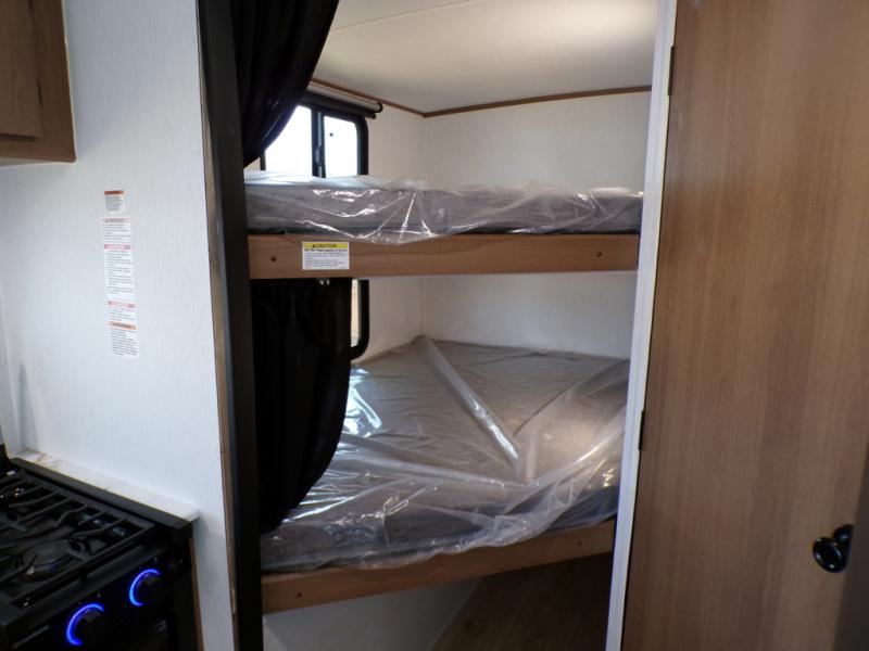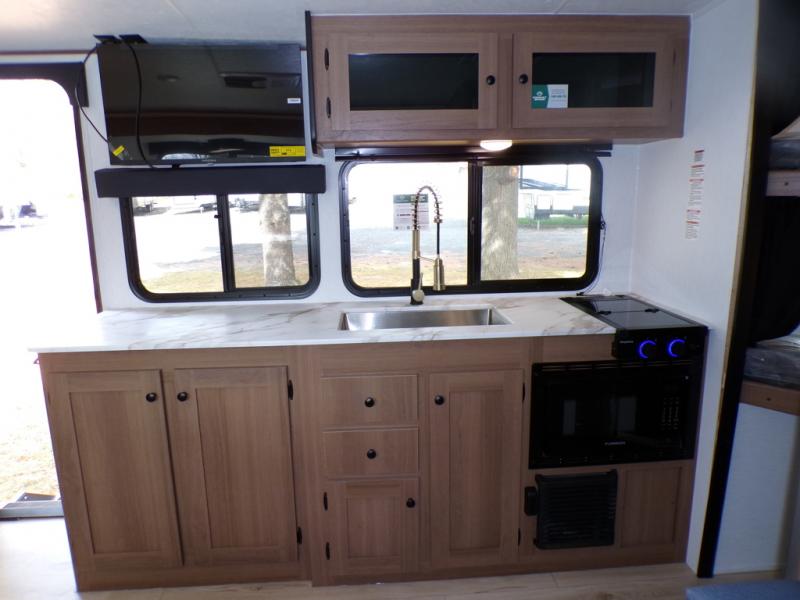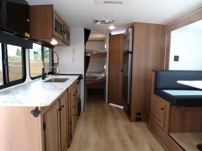 As you step into this trailer, you're welcomed by a private front bedroom featuring a comfortable queen bed, perfect for a restful night's sleep, in between dual wardrobes to neatly store your clothes and essentials. Moving to the center of the space, the dinette nestled in the slide-out offers a cozy spot to dine, gather, or convert into an extra-sleeping area if needed. Just beside it, the 10-cu. ft. refrigerator provides ample space to keep your groceries fresh. Opposite the dinette, the fully equipped kitchen makes cooking on the road a breeze, complete with a stainless-steel sink with a flush-mount cover, an air fryer microwave, and a two-burner cooktop. Toward the rear, you’ll find 48" x 74" double bed bunks, with the lower bunk able to flip up for added flexibility, perfect for accommodating the whole crew. Adjacent to the bunks, a full bathroom adds extra convenience, eliminating the need to rely on campground facilities.