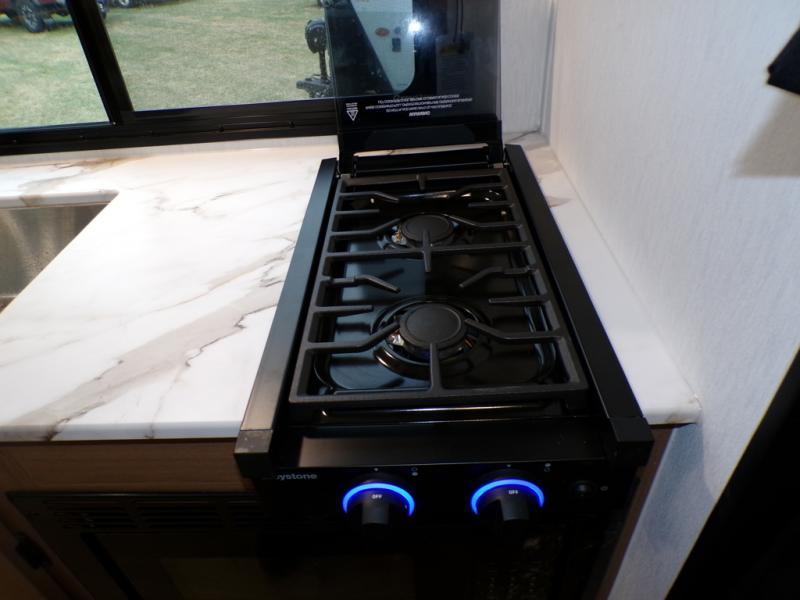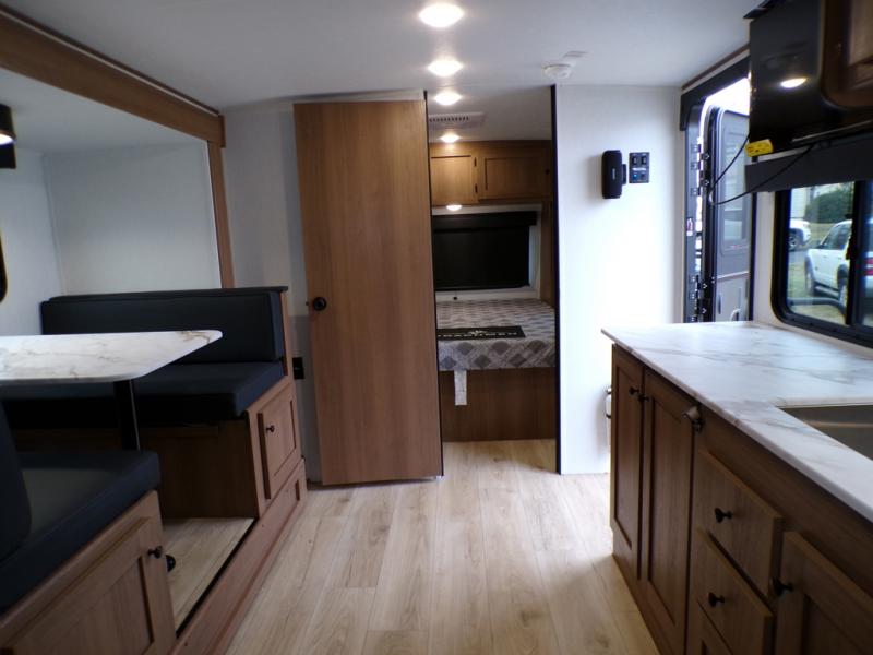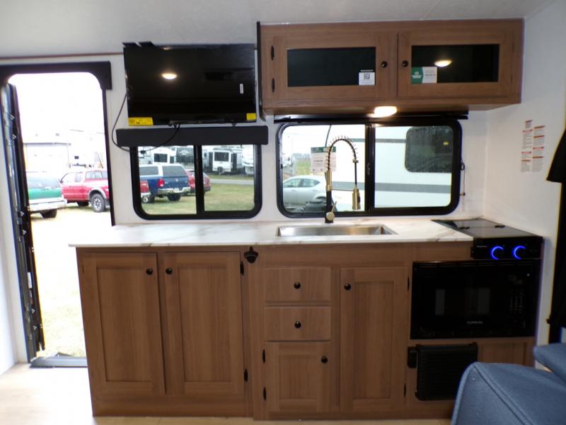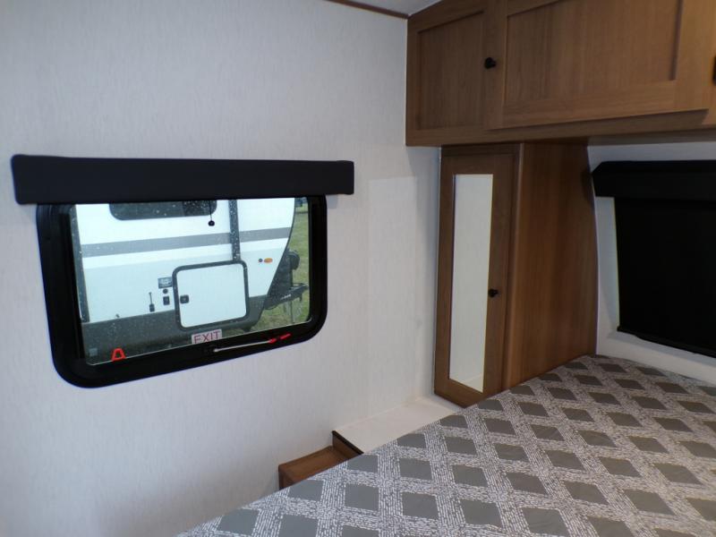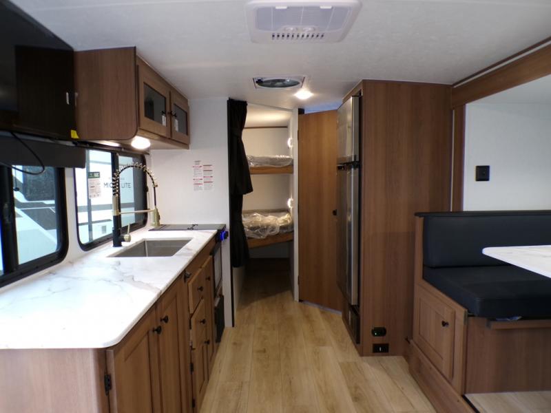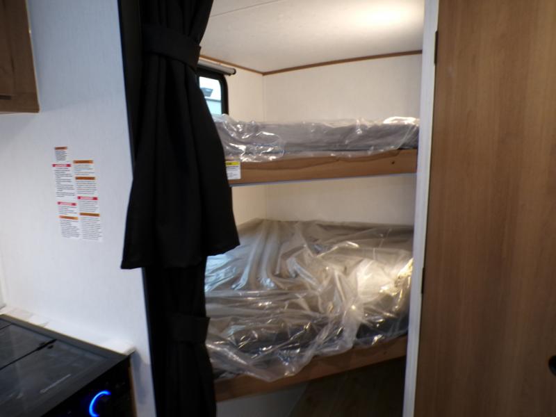 As you step into this trailer, you're welcomed by a private front bedroom featuring a comfortable queen bed, perfect for a restful night's sleep, in between dual wardrobes to neatly store your clothes and essentials. Moving to the center of the space, the dinette nestled in the slide-out offers a cozy spot to dine, gather, or convert into an extra-sleeping area if needed. Just beside it, the 10-cu. ft. refrigerator provides ample space to keep your groceries fresh. Opposite the dinette, the fully equipped kitchen makes cooking on the road a breeze, complete with a stainless-steel sink with a flush-mount cover, an air fryer microwave, and a two-burner cooktop. Toward the rear, you’ll find 48" x 74" double bed bunks, with the lower bunk able to flip up for added flexibility, perfect for accommodating the whole crew. Adjacent to the bunks, a full bathroom adds extra convenience, eliminating the need to rely on campground facilities.