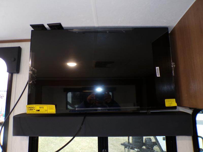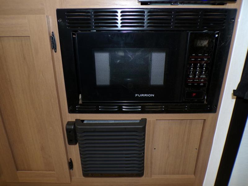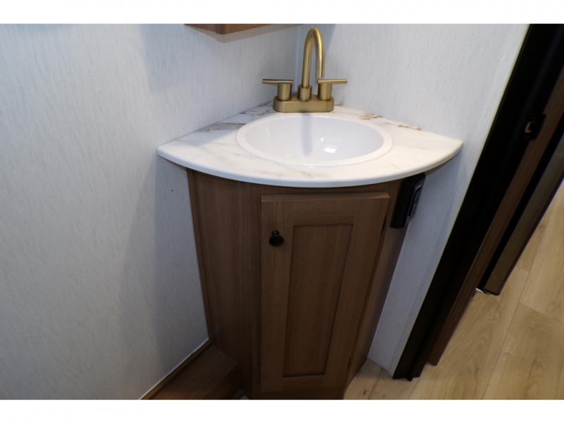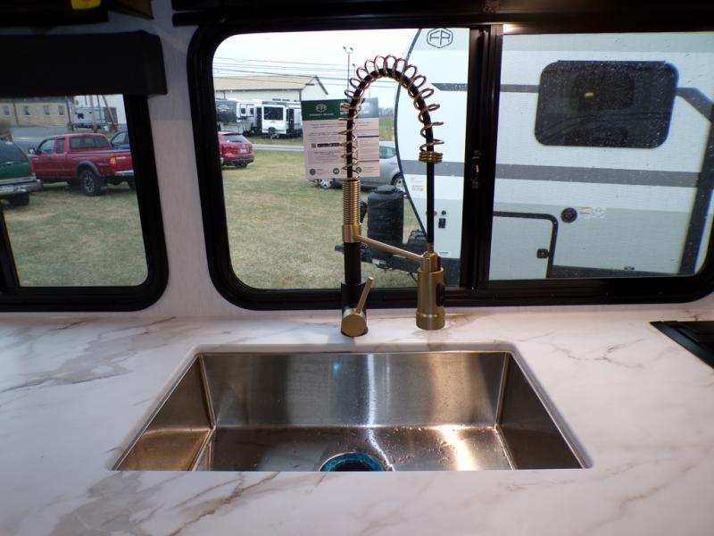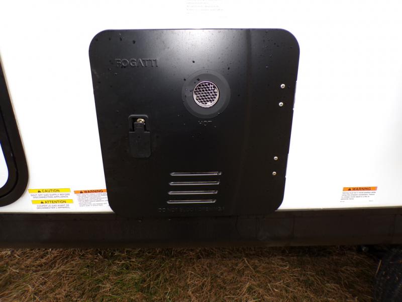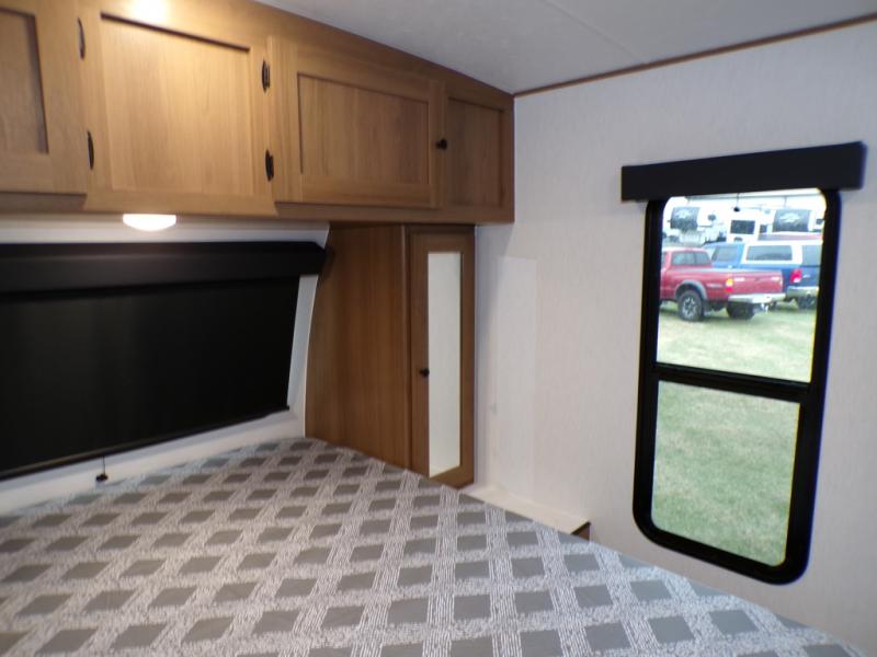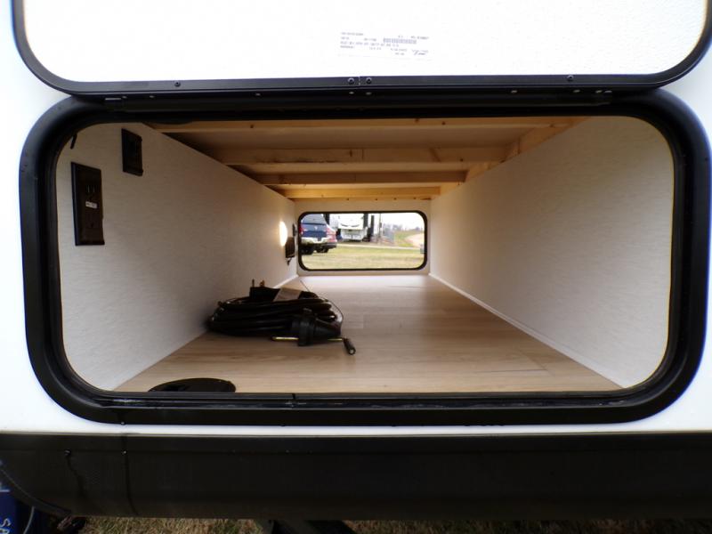 As you step into this trailer, you're welcomed by a private front bedroom featuring a comfortable queen bed, perfect for a restful night's sleep, in between dual wardrobes to neatly store your clothes and essentials. Moving to the center of the space, the dinette nestled in the slide-out offers a cozy spot to dine, gather, or convert into an extra-sleeping area if needed. Just beside it, the 10-cu. ft. refrigerator provides ample space to keep your groceries fresh. Opposite the dinette, the fully equipped kitchen makes cooking on the road a breeze, complete with a stainless-steel sink with a flush-mount cover, an air fryer microwave, and a two-burner cooktop. Toward the rear, you’ll find 48" x 74" double bed bunks, with the lower bunk able to flip up for added flexibility, perfect for accommodating the whole crew. Adjacent to the bunks, a full bathroom adds extra convenience, eliminating the need to rely on campground facilities.