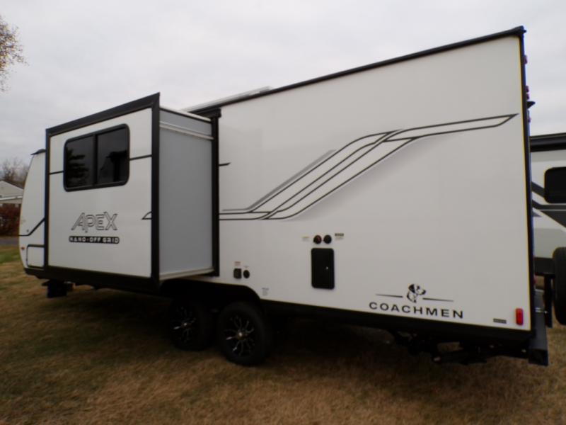 You will find comfort, convenience, and a sturdy construction with each of these Coachmen RV Apex Nano travel trailers! They are held together with an aluma-cage construction, an I-beam chassis, plus vacuum-bonded laminated dual Azdel fiberglass walls for double the protection against the elements. The 400-watt solar panel with a 30-amp control charger is included, along with two 20 lb. LP tanks, a high velocity power roof vent, plus 12V outlets to keep you powered up. More exterior features include a hot/cold shower, four stabilizer jacks, a power awning with LED lighting, and radius thumb latch baggage doors to easily pack and unload your gear. You will love the interior of your Apex Nano with Congoleum residential flooring, one-piece seamless edge countertops, matte black hardware in the galley, and a hand-crafted wood medicine cabinet in the bath.