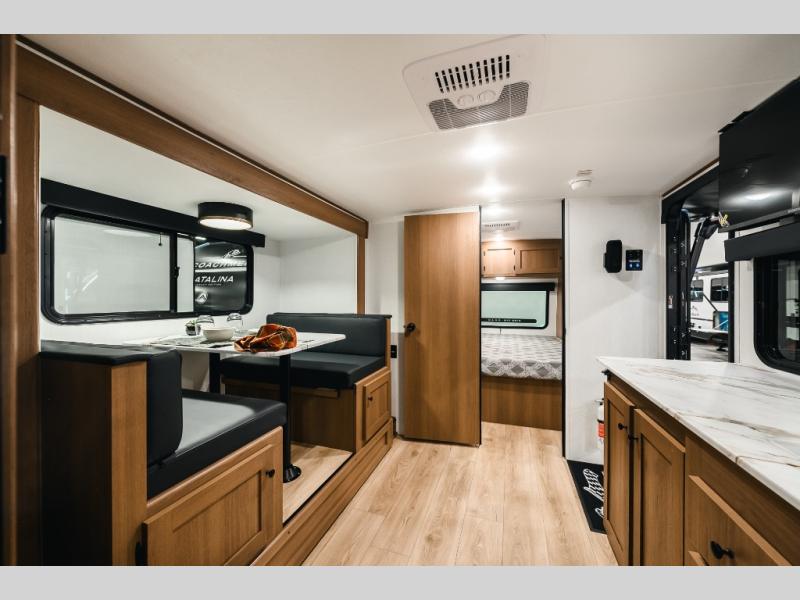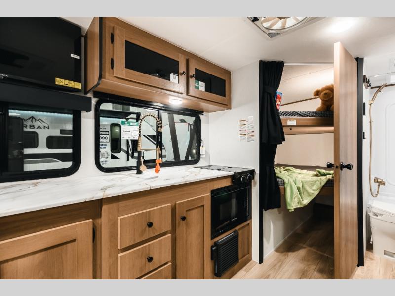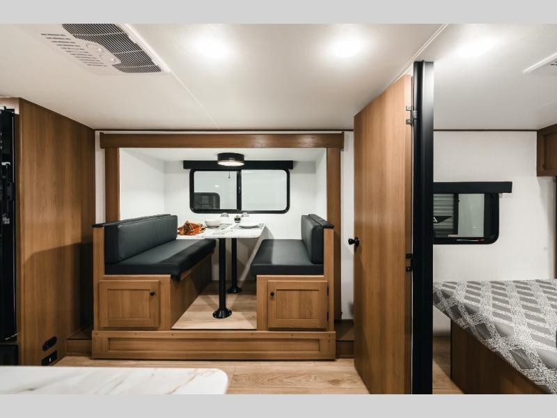 As you step into this trailer, you're welcomed by a private front bedroom featuring a comfortable queen bed, perfect for a restful night's sleep, in between dual wardrobes to neatly store your clothes and essentials. Moving to the center of the space, the dinette nestled in the slide-out offers a cozy spot to dine, gather, or convert into an extra-sleeping area if needed. Just beside it, the 10-cu. ft. refrigerator provides ample space to keep your groceries fresh. Opposite the dinette, the fully equipped kitchen makes cooking on the road a breeze, complete with a stainless-steel sink with a flush-mount cover, an air fryer microwave, and a two-burner cooktop. Toward the rear, you’ll find 48" x 74" double bed bunks, with the lower bunk able to flip up for added flexibility, perfect for accommodating the whole crew. Adjacent to the bunks, a full bathroom adds extra convenience, eliminating the need to rely on campground facilities.