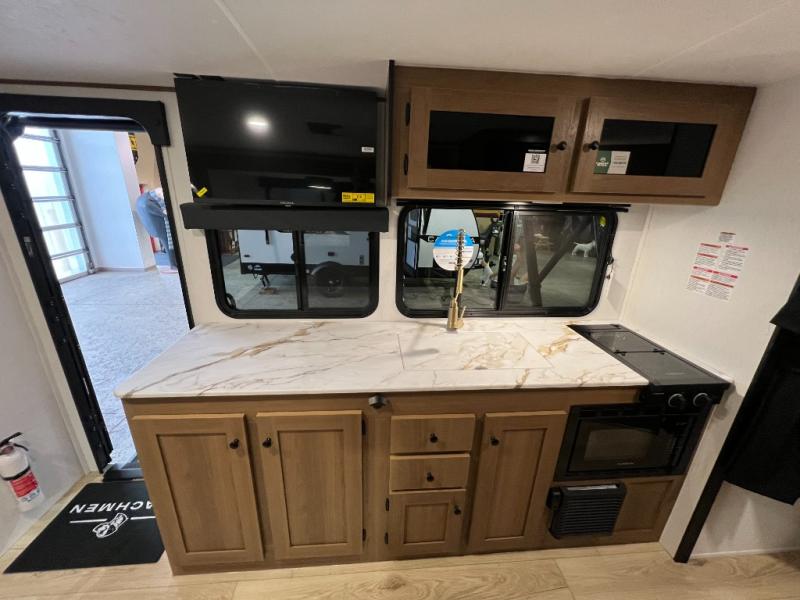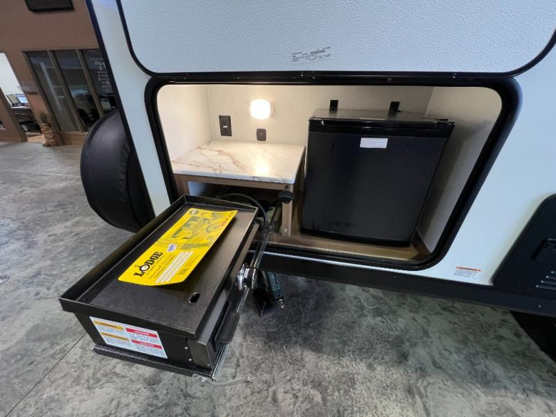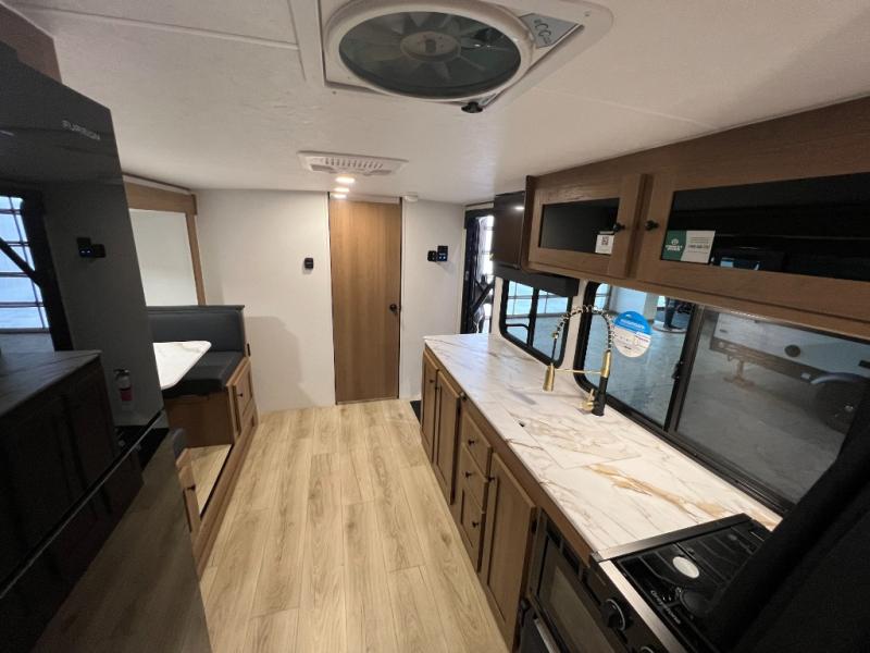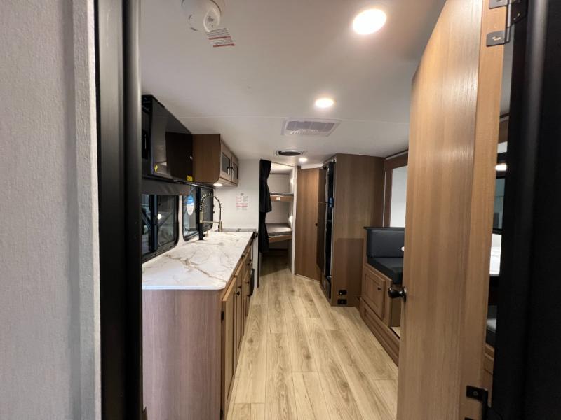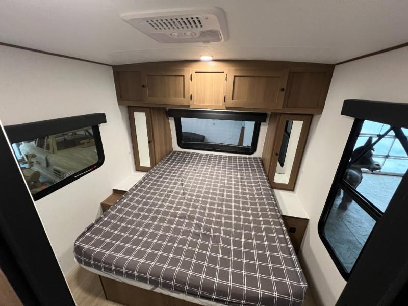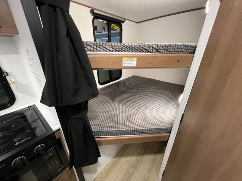 As you step into this trailer, you're welcomed by a private front bedroom featuring a comfortable queen bed, perfect for a restful night's sleep, in between dual wardrobes to neatly store your clothes and essentials. Moving to the center of the space, the dinette nestled in the slide-out offers a cozy spot to dine, gather, or convert into an extra-sleeping area if needed. Just beside it, the 10-cu. ft. refrigerator provides ample space to keep your groceries fresh. Opposite the dinette, the fully equipped kitchen makes cooking on the road a breeze, complete with a stainless-steel sink with a flush-mount cover, an air fryer microwave, and a two-burner cooktop. Toward the rear, you’ll find 48" x 74" double bed bunks, with the lower bunk able to flip up for added flexibility, perfect for accommodating the whole crew. Adjacent to the bunks, a full bathroom adds extra convenience, eliminating the need to rely on campground facilities.
