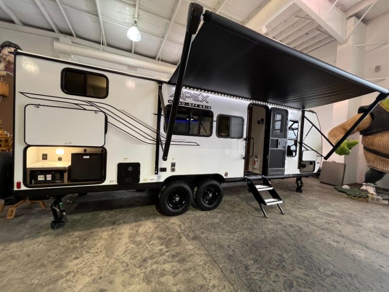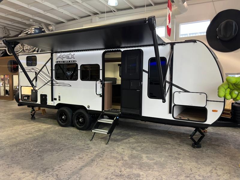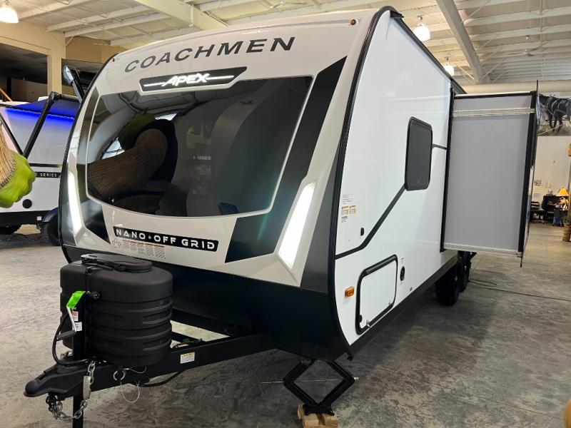 You will find comfort, convenience, and a sturdy construction with each of these Coachmen RV Apex Nano travel trailers! They are held together with an aluma-cage construction, an I-beam chassis, plus vacuum-bonded laminated dual Azdel fiberglass walls for double the protection against the elements. The 400-watt solar panel with a 30-amp control charger is included, along with two 20 lb. LP tanks, a high velocity power roof vent, plus 12V outlets to keep you powered up. More exterior features include a hot/cold shower, four stabilizer jacks, a power awning with LED lighting, and radius thumb latch baggage doors to easily pack and unload your gear. You will love the interior of your Apex Nano with Congoleum residential flooring, one-piece seamless edge countertops, matte black hardware in the galley, and a hand-crafted wood medicine cabinet in the bath.
