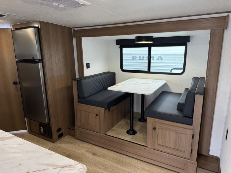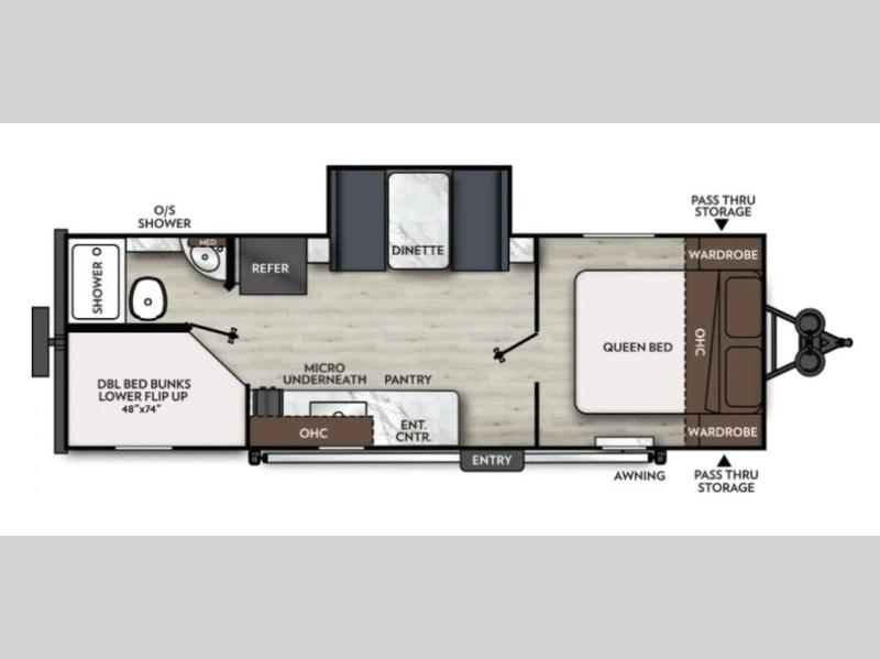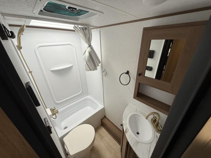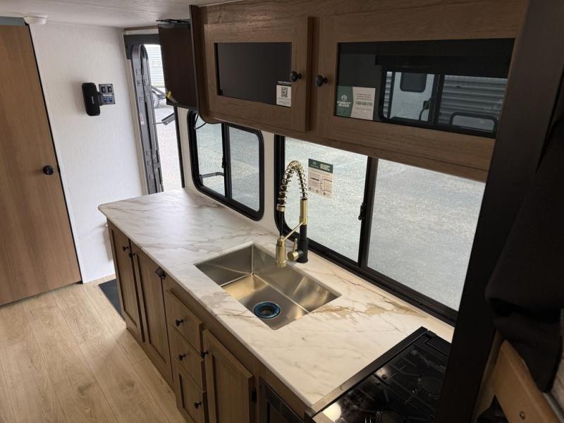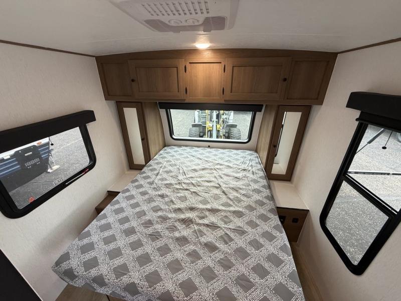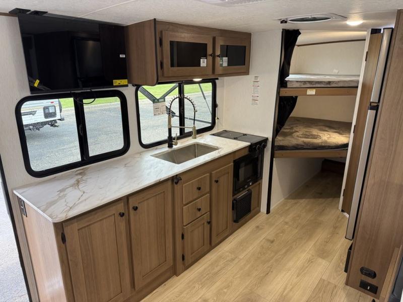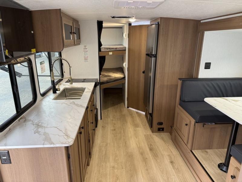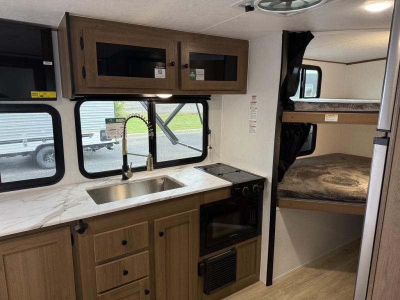 As you step into this trailer, you're welcomed by a private front bedroom featuring a comfortable queen bed, perfect for a restful night's sleep, in between dual wardrobes to neatly store your clothes and essentials. Moving to the center of the space, the dinette nestled in the slide-out offers a cozy spot to dine, gather, or convert into an extra-sleeping area if needed. Just beside it, the 10-cu. ft. refrigerator provides ample space to keep your groceries fresh. Opposite the dinette, the fully equipped kitchen makes cooking on the road a breeze, complete with a stainless-steel sink with a flush-mount cover, an air fryer microwave, and a two-burner cooktop. Toward the rear, you’ll find 48" x 74" double bed bunks, with the lower bunk able to flip up for added flexibility, perfect for accommodating the whole crew. Adjacent to the bunks, a full bathroom adds extra convenience, eliminating the need to rely on campground facilities.