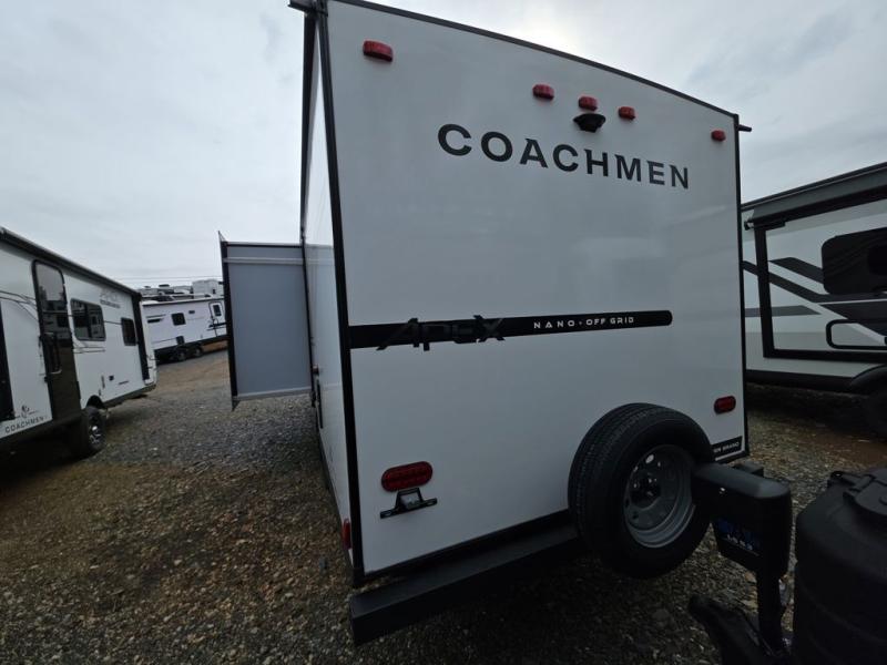 You will find comfort, convenience, and a sturdy construction with each of these Coachmen RV Apex Nano travel trailers! They are held together with an aluma-cage construction, an I-beam chassis, plus vacuum-bonded laminated dual Azdel fiberglass walls for double the protection against the elements. The 400-watt solar panel with a 30-amp control charger is included, along with two 20 lb. LP tanks, a high velocity power roof vent, plus 12V outlets to keep you powered up. More exterior features include a hot/cold shower, four stabilizer jacks, a power awning with LED lighting, and radius thumb latch baggage doors to easily pack and unload your gear. You will love the interior of your Apex Nano with Congoleum residential flooring, one-piece seamless edge countertops, matte black hardware in the galley, and a hand-crafted wood medicine cabinet in the bath.
