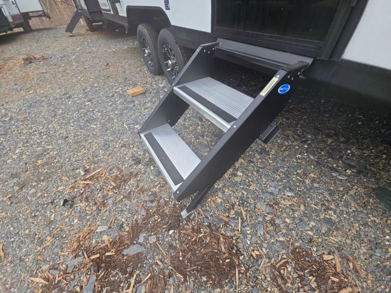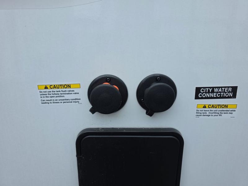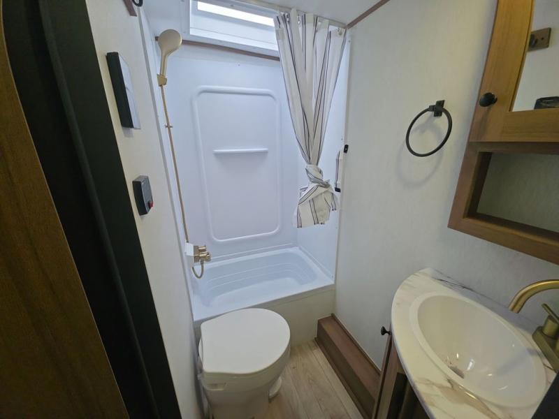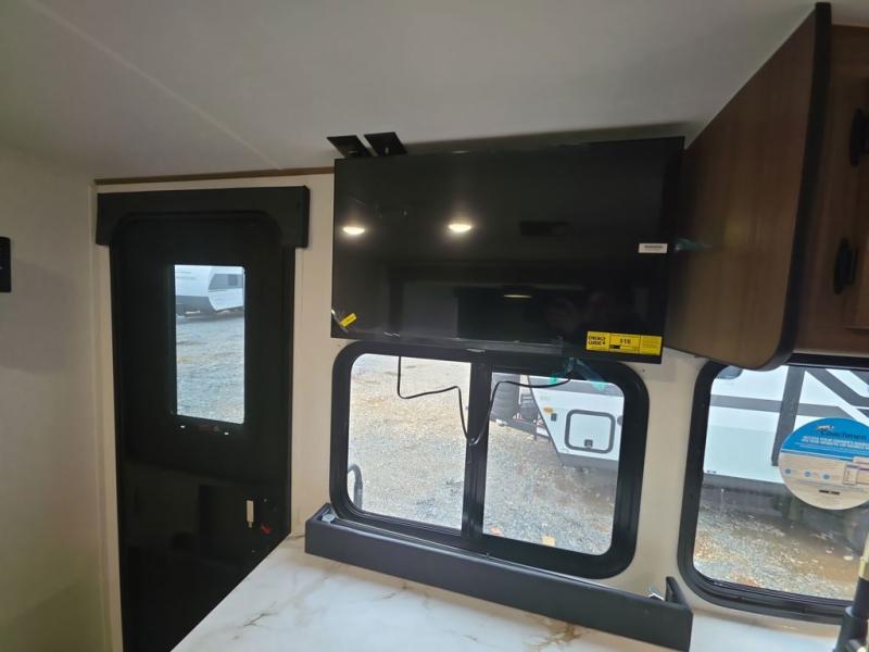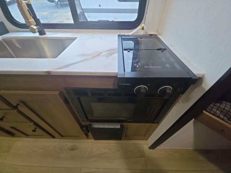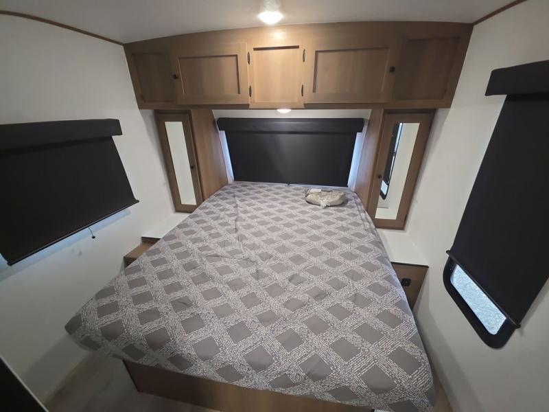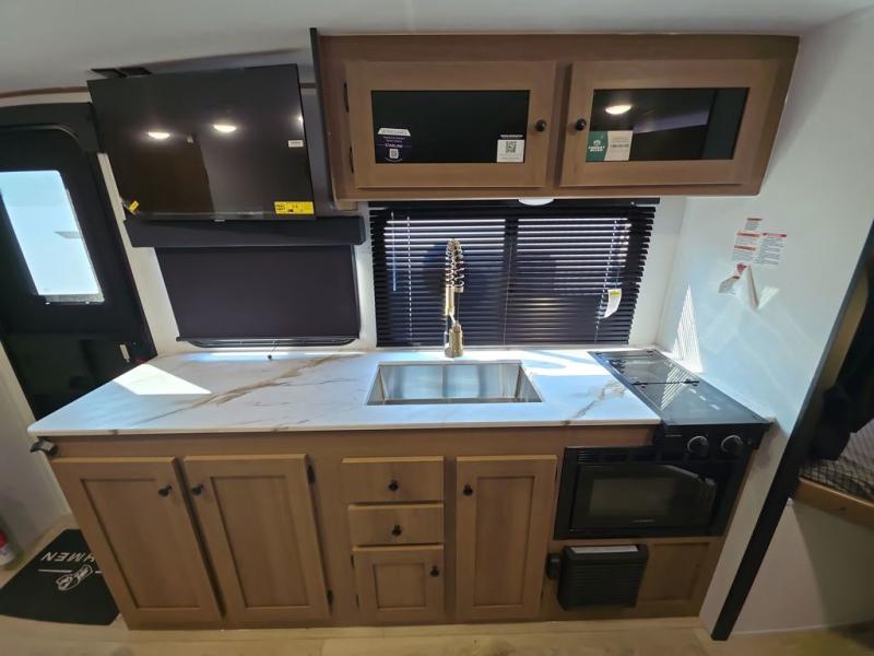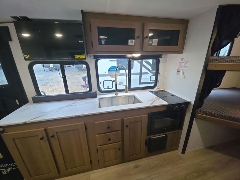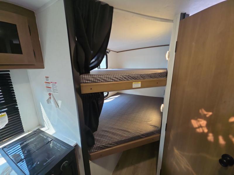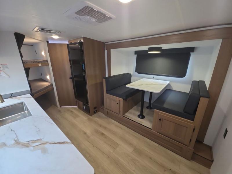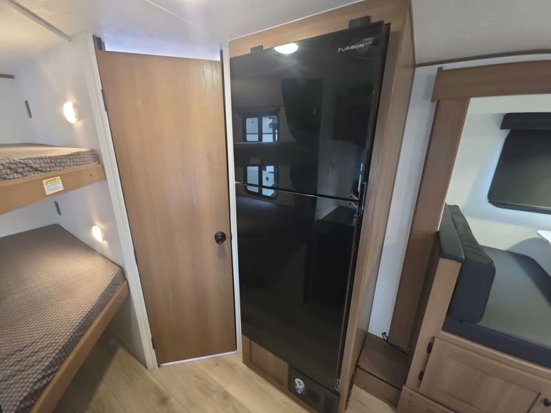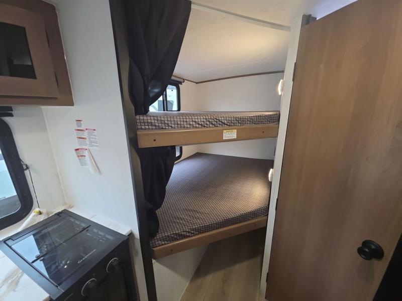 As you step into this trailer, you're welcomed by a private front bedroom featuring a comfortable queen bed, perfect for a restful night's sleep, in between dual wardrobes to neatly store your clothes and essentials. Moving to the center of the space, the dinette nestled in the slide-out offers a cozy spot to dine, gather, or convert into an extra-sleeping area if needed. Just beside it, the 10-cu. ft. refrigerator provides ample space to keep your groceries fresh. Opposite the dinette, the fully equipped kitchen makes cooking on the road a breeze, complete with a stainless-steel sink with a flush-mount cover, an air fryer microwave, and a two-burner cooktop. Toward the rear, you’ll find 48" x 74" double bed bunks, with the lower bunk able to flip up for added flexibility, perfect for accommodating the whole crew. Adjacent to the bunks, a full bathroom adds extra convenience, eliminating the need to rely on campground facilities.