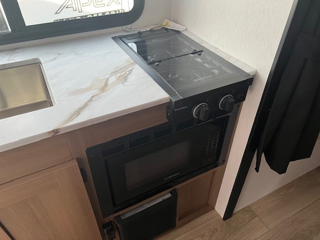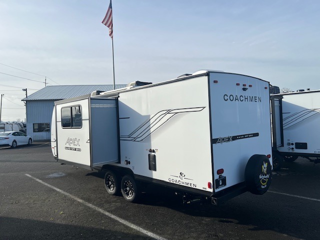 You will find comfort, convenience, and a sturdy construction with each of these Coachmen RV Apex Nano travel trailers! They are held together with an aluma-cage construction, an I-beam chassis, plus vacuum-bonded laminated dual Azdel fiberglass walls for double the protection against the elements. The 400-watt solar panel with a 30-amp control charger is included, along with two 20 lb. LP tanks, a high velocity power roof vent, plus 12V outlets to keep you powered up. More exterior features include a hot/cold shower, four stabilizer jacks, a power awning with LED lighting, and radius thumb latch baggage doors to easily pack and unload your gear. You will love the interior of your Apex Nano with Congoleum residential flooring, one-piece seamless edge countertops, matte black hardware in the galley, and a hand-crafted wood medicine cabinet in the bath.