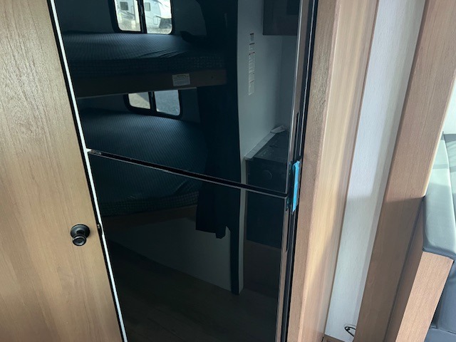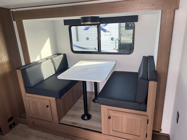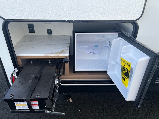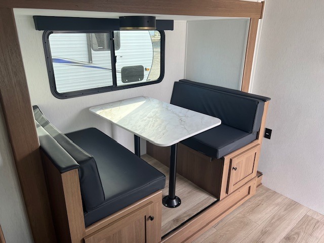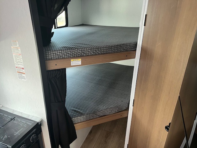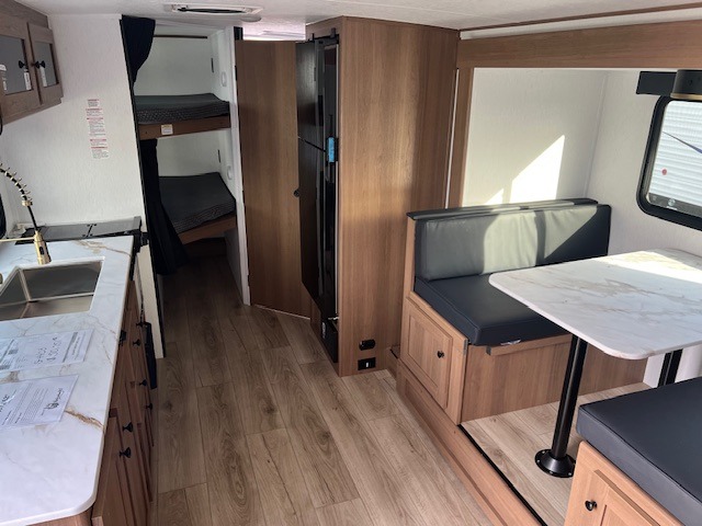 As you step into this trailer, you're welcomed by a private front bedroom featuring a comfortable queen bed, perfect for a restful night's sleep, in between dual wardrobes to neatly store your clothes and essentials. Moving to the center of the space, the dinette nestled in the slide-out offers a cozy spot to dine, gather, or convert into an extra-sleeping area if needed. Just beside it, the 10-cu. ft. refrigerator provides ample space to keep your groceries fresh. Opposite the dinette, the fully equipped kitchen makes cooking on the road a breeze, complete with a stainless-steel sink with a flush-mount cover, an air fryer microwave, and a two-burner cooktop. Toward the rear, you’ll find 48" x 74" double bed bunks, with the lower bunk able to flip up for added flexibility, perfect for accommodating the whole crew. Adjacent to the bunks, a full bathroom adds extra convenience, eliminating the need to rely on campground facilities.