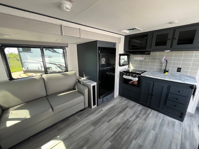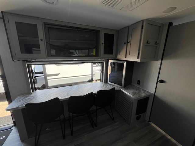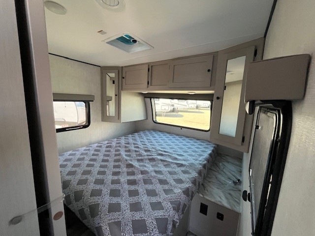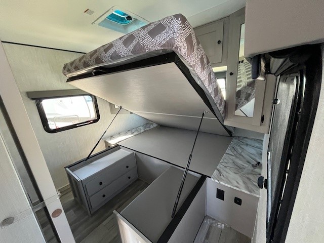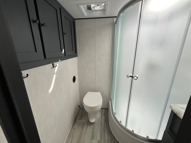 You will love this travel trailer front bedroom. Ideal for you and your partner, this bedroom is fitted with a 60x80 queen bed with super storage, dual wardrobes beside the bed and a over head cabinet. On the kitchen area you will find a 12V refrigerator, pantry, three burner cooktop and a bar countertop with stools, for have a nice drink on a hot day, in addition, you or your guests can rest on the 68" trifold sofa. Take a relaxing bath in the full bathroom furnished with 34" shower and overhead cabinets. You will also love the outdoor kitchen, perfect to have a meal while admiring nature.