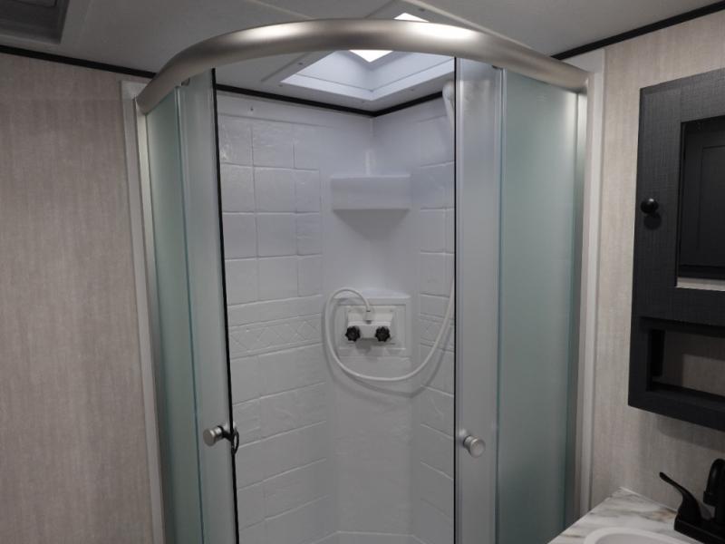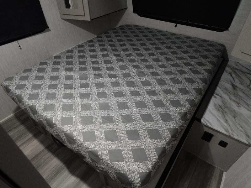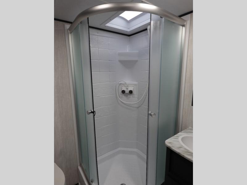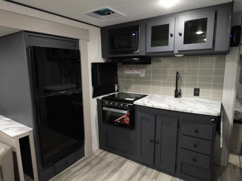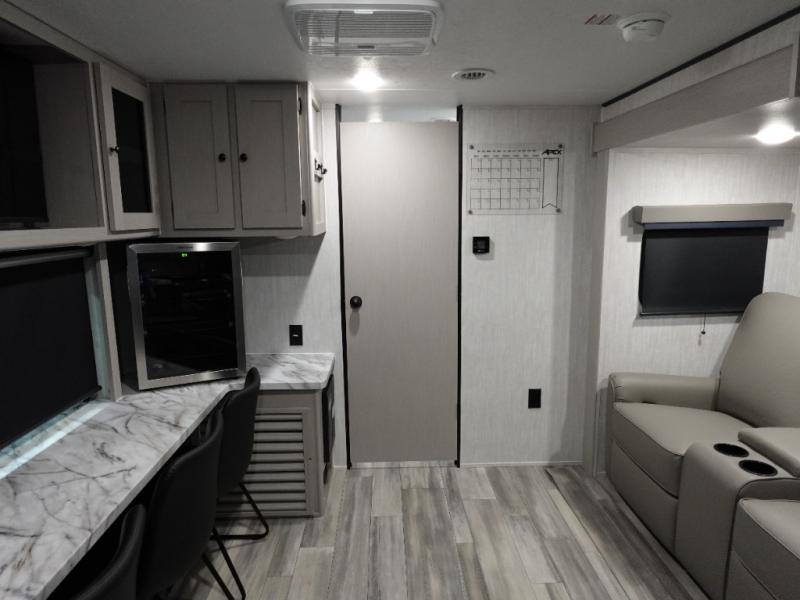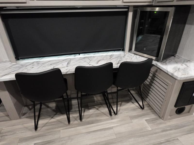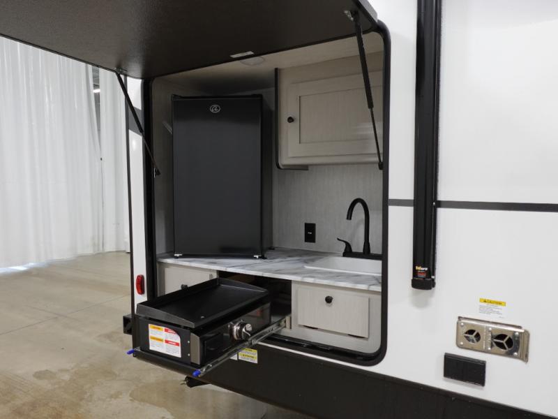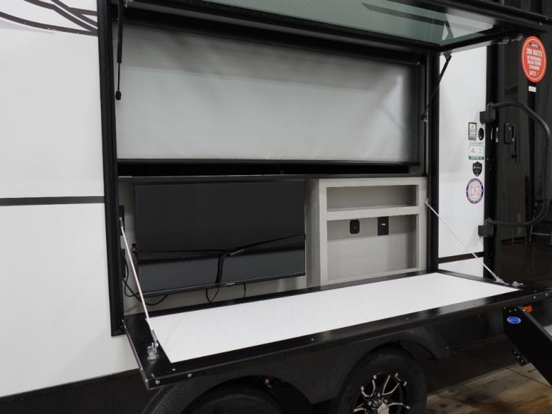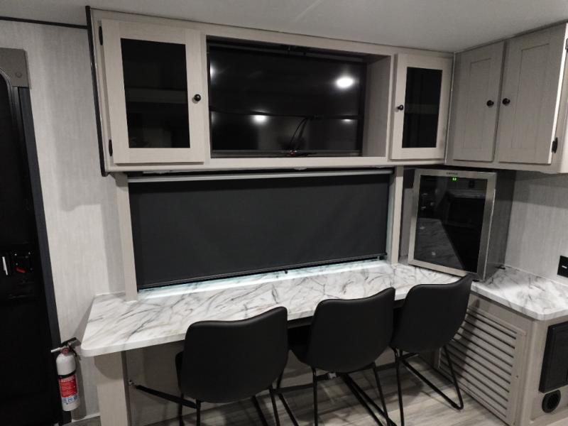 You will love this travel trailer front bedroom. Ideal for you and your partner, this bedroom is fitted with a 60x80 queen bed with super storage, dual wardrobes beside the bed and a over head cabinet. On the kitchen area you will find a 12V refrigerator, pantry, three burner cooktop and a bar countertop with stools, for have a nice drink on a hot day, in addition, you or your guests can rest on the 68" trifold sofa. Take a relaxing bath in the full bathroom furnished with 34" shower and overhead cabinets. You will also love the outdoor kitchen, perfect to have a meal while admiring nature.