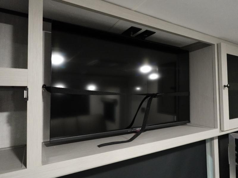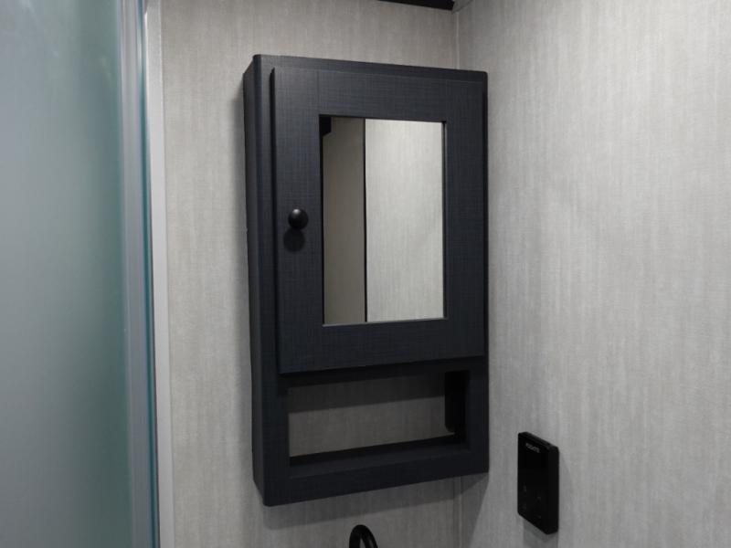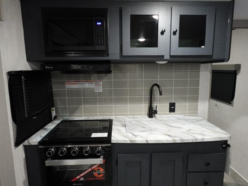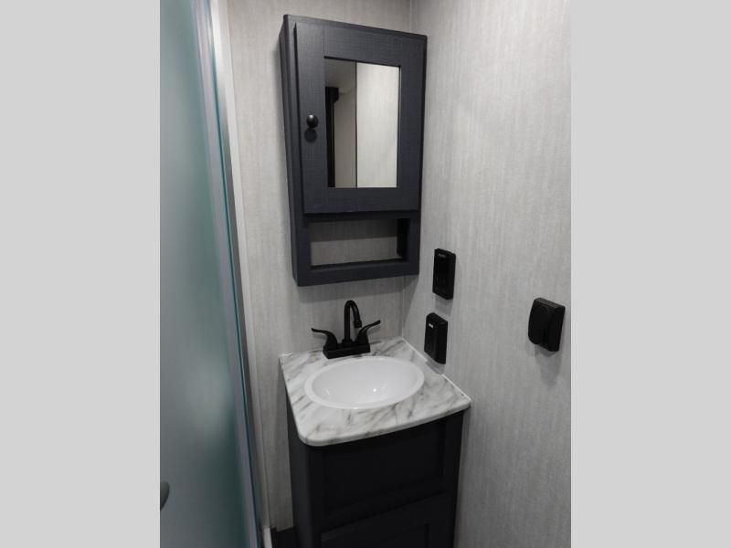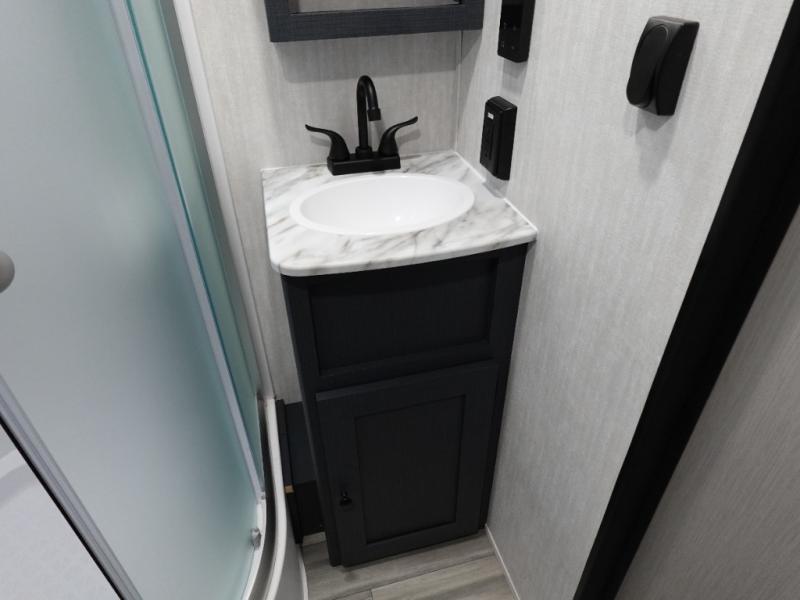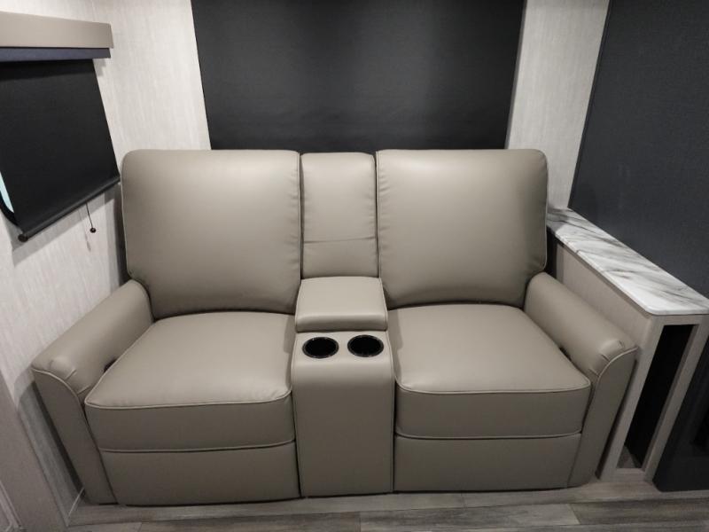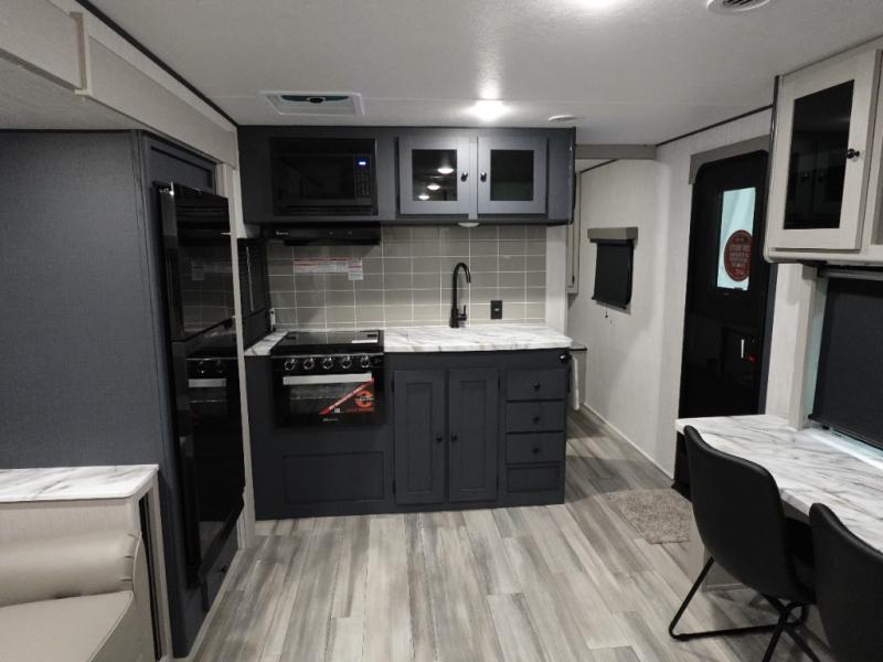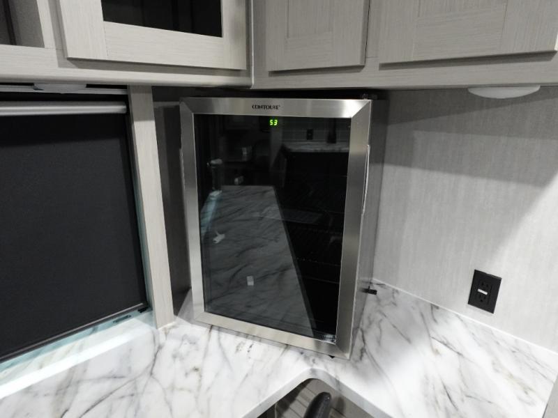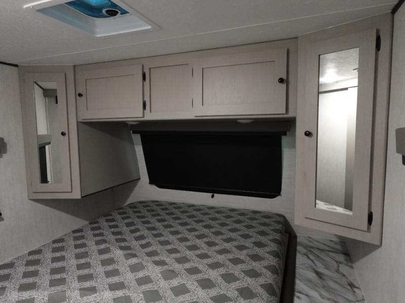 You will love this travel trailer front bedroom. Ideal for you and your partner, this bedroom is fitted with a 60x80 queen bed with super storage, dual wardrobes beside the bed and a over head cabinet. On the kitchen area you will find a 12V refrigerator, pantry, three burner cooktop and a bar countertop with stools, for have a nice drink on a hot day, in addition, you or your guests can rest on the 68" trifold sofa. Take a relaxing bath in the full bathroom furnished with 34" shower and overhead cabinets. You will also love the outdoor kitchen, perfect to have a meal while admiring nature.