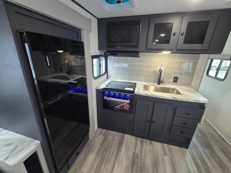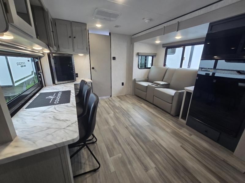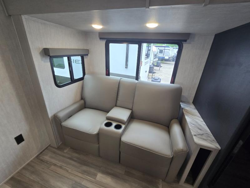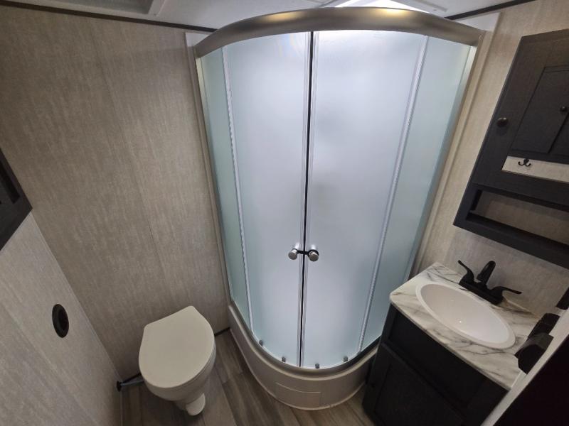 You will love this travel trailer front bedroom. Ideal for you and your partner, this bedroom is fitted with a 60x80 queen bed with super storage, dual wardrobes beside the bed and a over head cabinet. On the kitchen area you will find a 12V refrigerator, pantry, three burner cooktop and a bar countertop with stools, for have a nice drink on a hot day, in addition, you or your guests can rest on the 68" trifold sofa. Take a relaxing bath in the full bathroom furnished with 34" shower and overhead cabinets. You will also love the outdoor kitchen, perfect to have a meal while admiring nature.