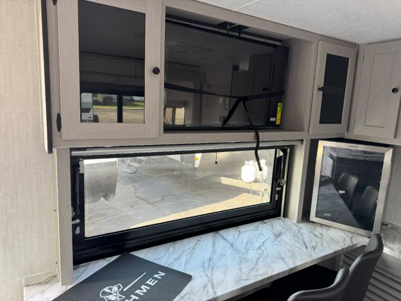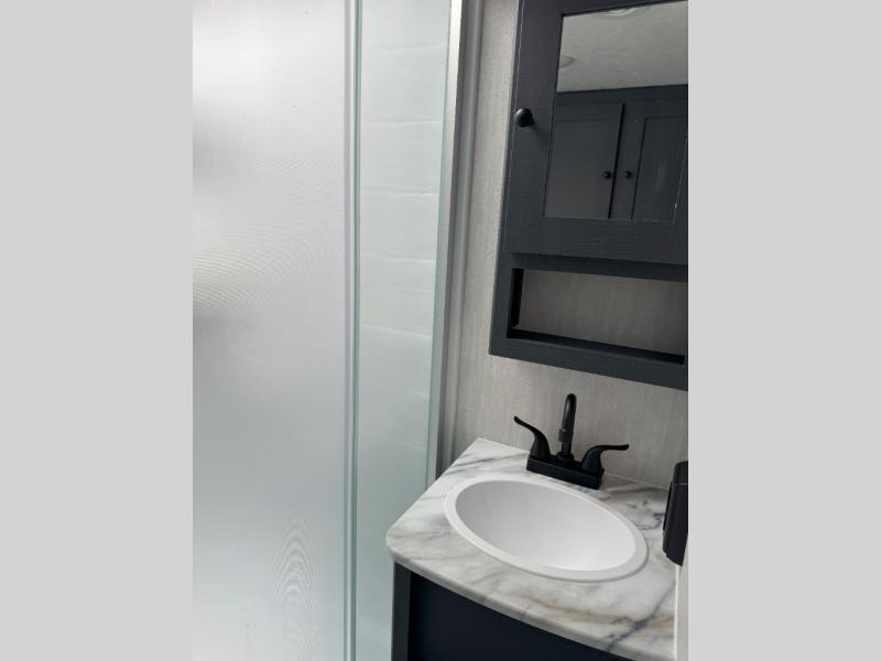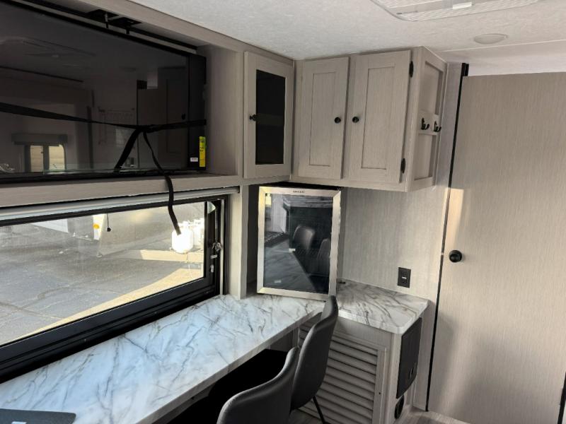 You will love this travel trailer front bedroom. Ideal for you and your partner, this bedroom is fitted with a 60x80 queen bed with super storage, dual wardrobes beside the bed and a over head cabinet. On the kitchen area you will find a 12V refrigerator, pantry, three burner cooktop and a bar countertop with stools, for have a nice drink on a hot day, in addition, you or your guests can rest on the 68" trifold sofa. Take a relaxing bath in the full bathroom furnished with 34" shower and overhead cabinets. You will also love the outdoor kitchen, perfect to have a meal while admiring nature.