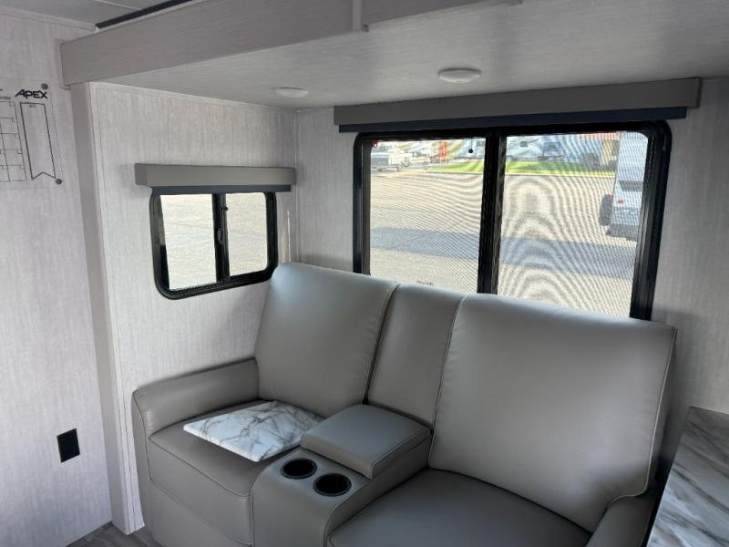 Lightweight living and camping is found with the Apex Ultra-Lite travel trailers by Coachmen. These eco-friendly units are made to last thanks to the Azdel composite sidewalls, the laminated aluminum floor, and the vacuum-bonded laminated crowned roof. Easy lube axles make towing easier than ever, plus there is a friction hinge entrance door, a 200-watt solar panel with a 30 Amp control charger, and slam latch baggage door catches for easy unloading. Some of the interior comforts you'll fall in love with are the one-piece seamless edge countertops, the hard valances with night shades, the matte black hardware, and the Casino Bisque cabinetry. The Apex Ultra-Lite trailers also include a USB charge station, plus a digital TV antenna with cable hook-ups and Wi-Fi capability for the option to stay connected as you camp!