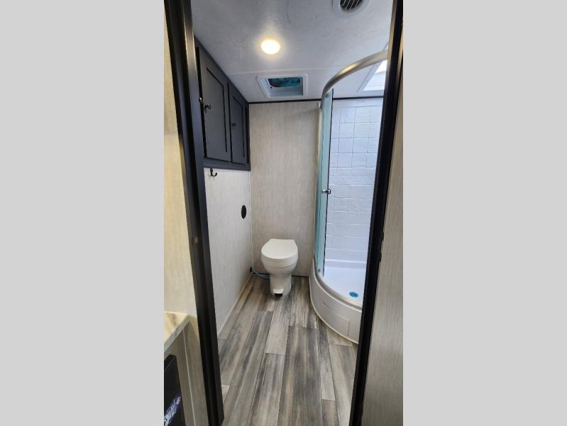 You will love this travel trailer front bedroom. Ideal for you and your partner, this bedroom is fitted with a 60x80 queen bed with super storage, dual wardrobes beside the bed and a over head cabinet. In the kitchen area you will find a 12V refrigerator, pantry, three burner cooktop and a bar countertop with stools, for have a nice drink on a hot day, in addition, you or your guests can rest on the 68" trifold sofa. Take a relaxing bath in the full bathroom furnished with 34" shower and overhead cabinets. You will also love the outdoor kitchen, perfect to have a meal while admiring nature.