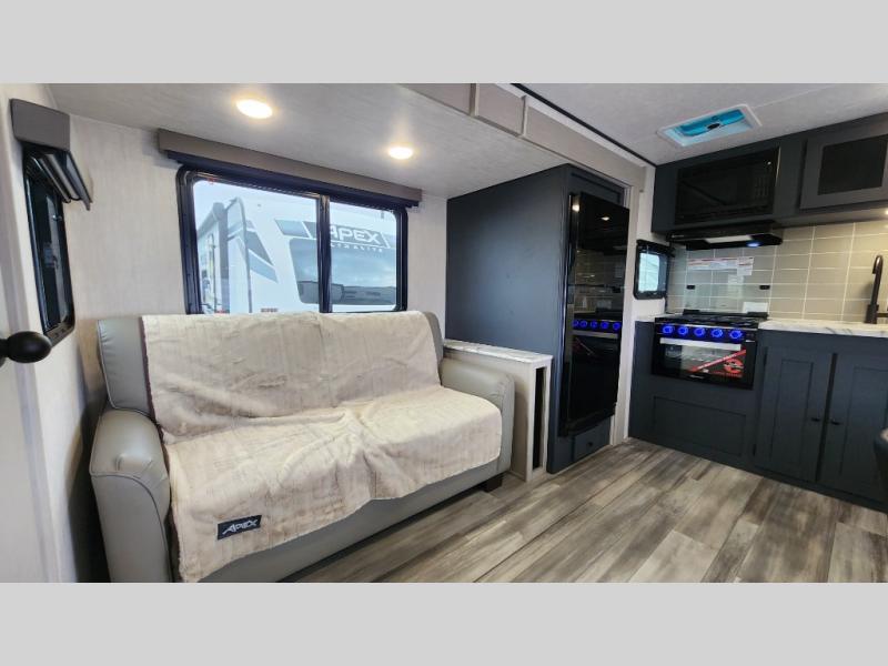 Lightweight living and camping is found with the Apex Ultra-Lite travel trailers by Coachmen. These eco-friendly units are made to last thanks to the Azdel composite sidewalls, the laminated aluminum floor, and the vacuum-bonded laminated trussed roof. Super lube axles make towing easier than ever, plus there is a friction hinge entrance door, a 200-watt solar panel with a 30 Amp control charger, and slam latch baggage door catches for easy unloading. Some of the interior comforts you'll fall in love with are the one-piece seamless edge countertops, the hard valances with roller shades, the matte black hardware, and the Casino Bisque cabinetry. The Apex Ultra-Lite trailers also include a USB charge station, plus a digital TV antenna with cable hook-ups and Wi-Fi capability for the option to stay connected as you camp!