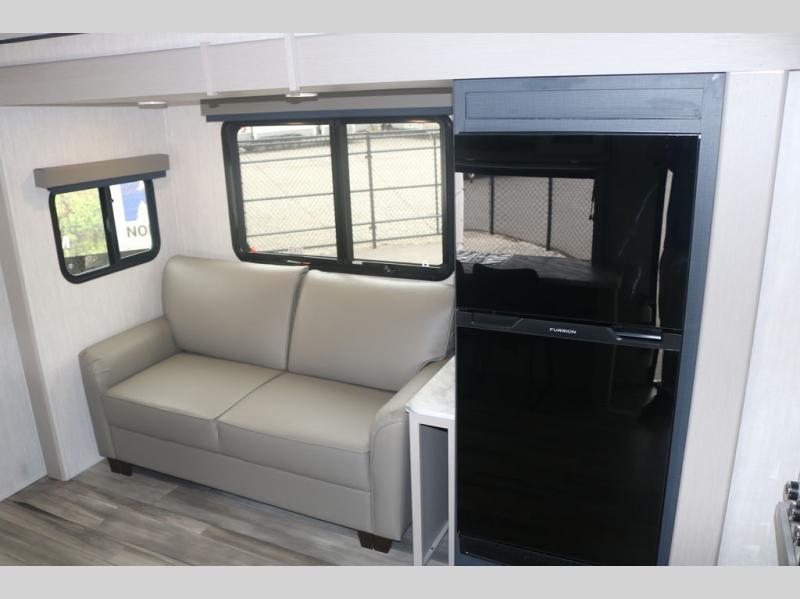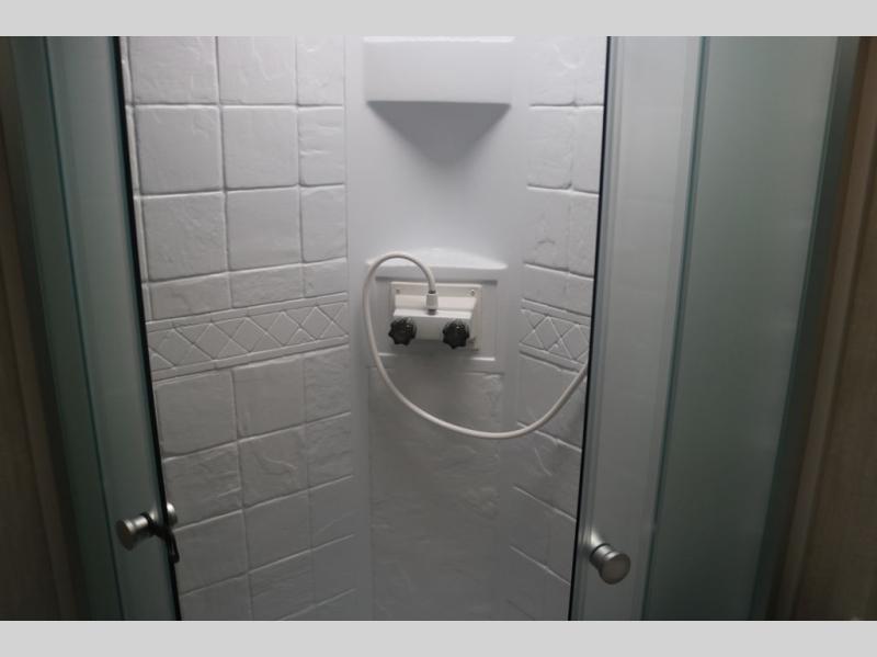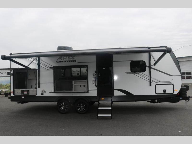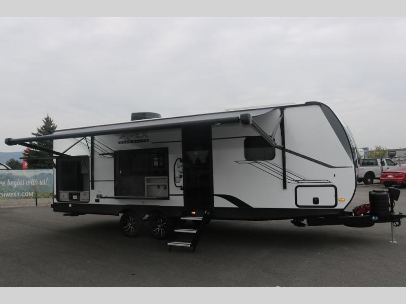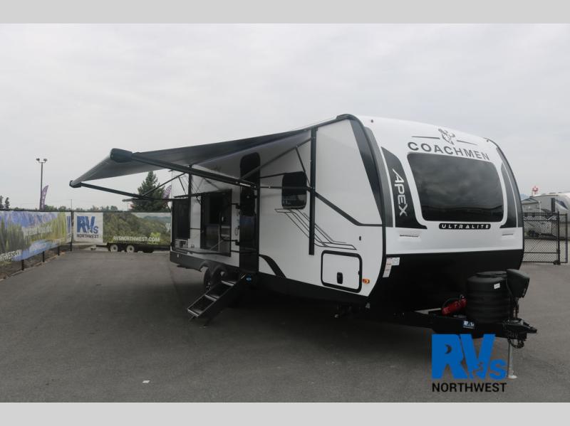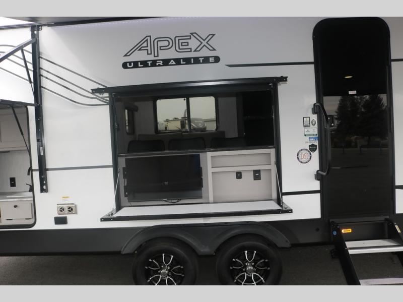 Lightweight living and camping is found with the Apex Ultra-Lite travel trailers by Coachmen. These eco-friendly units are made to last thanks to the Azdel composite sidewalls, the laminated aluminum floor, and the vacuum-bonded laminated trussed roof. There is a friction hinge entrance door, a 400-watt solar panel with a 30 Amp control charger, and slam latch baggage door catches for easy unloading. Some of the interior comforts you'll fall in love with are the one-piece seamless edge countertops, the hard valances with roller shades, and the Sorrento cabinetry. The Apex Ultra-Lite trailers also include USB/USB-C chargers. And when the adventure’s over, the hot/cold outside shower makes it easy to rinse off sandy feet, muddy gear, or pets before you ever step back inside.