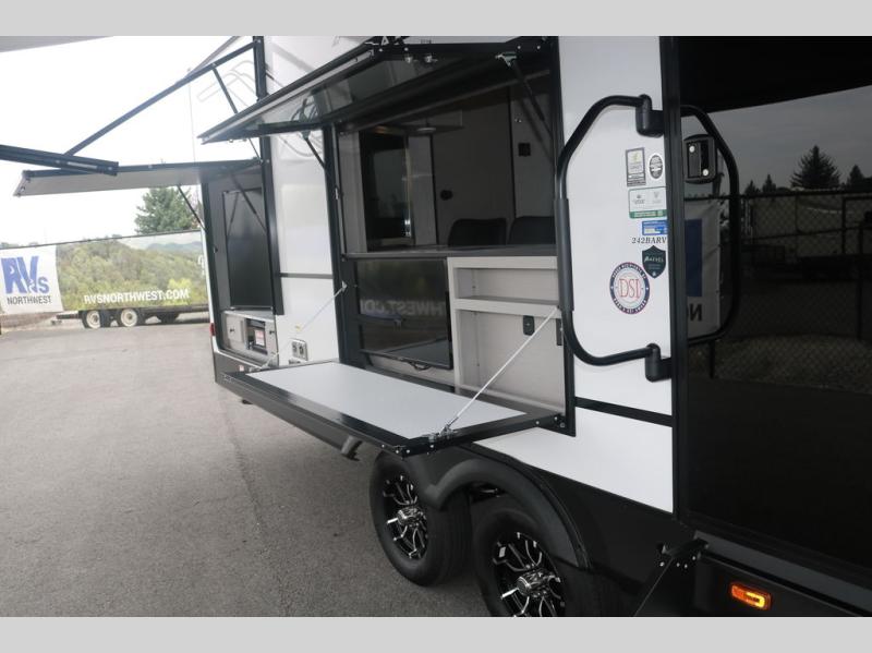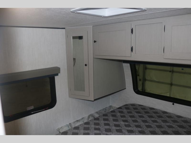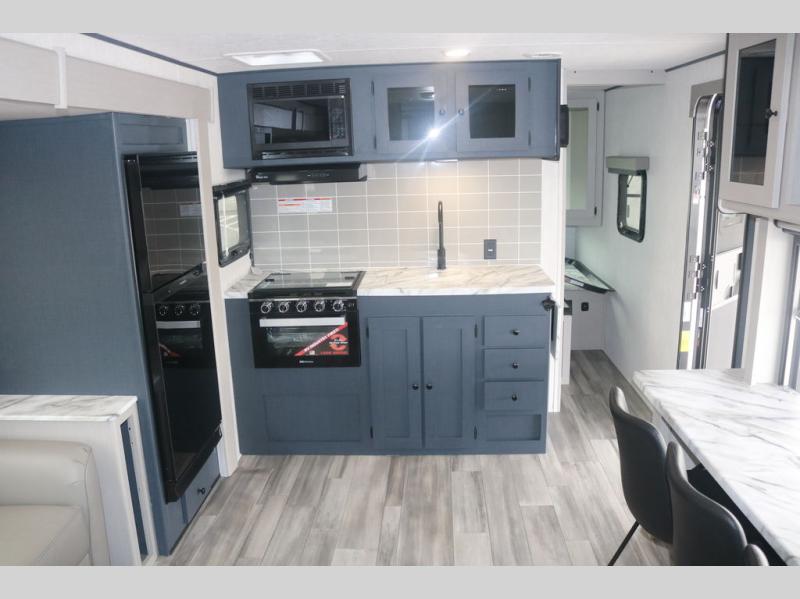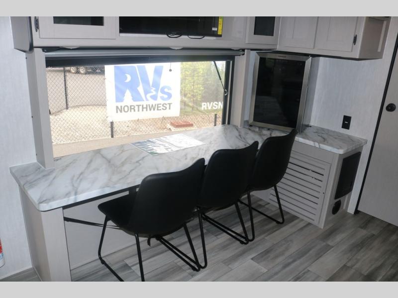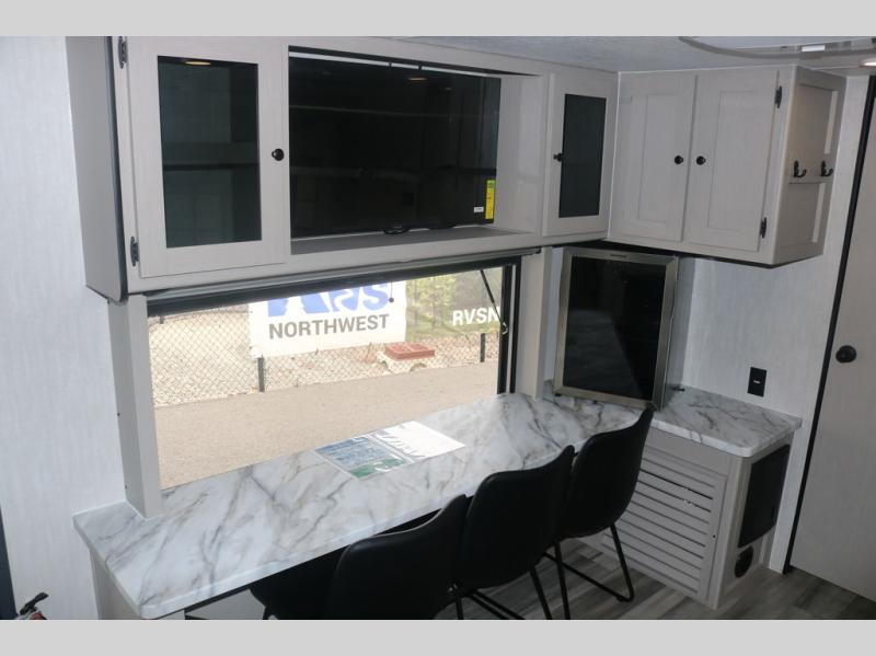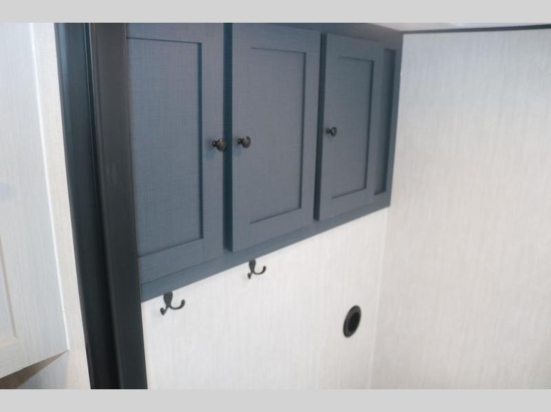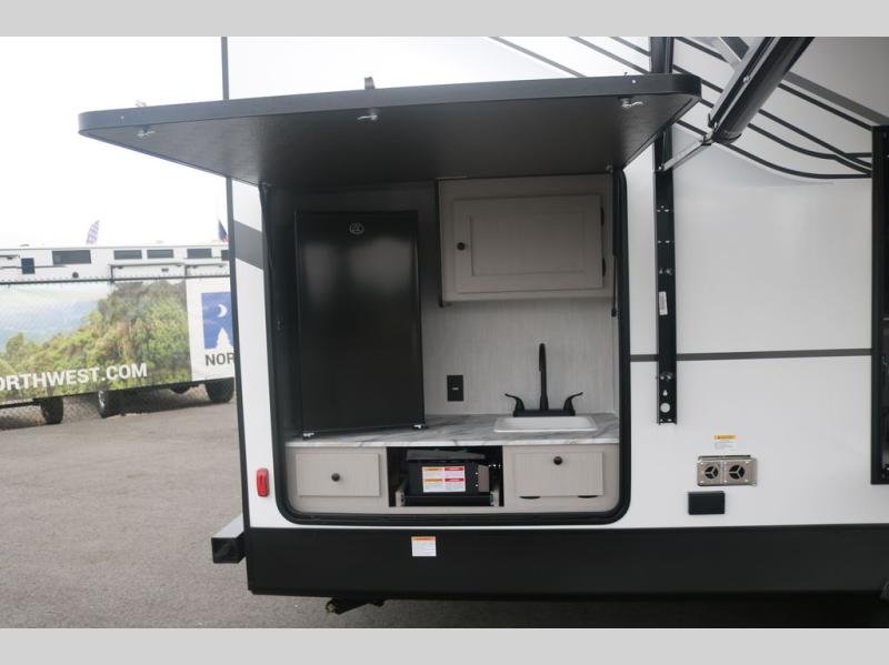 You will love this travel trailer front bedroom. Ideal for you and your partner, this bedroom is fitted with a 60 x 80 queen bed with super storage, dual wardrobes beside the bed and a over head cabinet. In the kitchen area you will find a 12V refrigerator, pantry, three burner cooktop and a bar countertop with chairs to have a nice drink on a hot day, in addition, you or your guests can rest on the 68" trifold sofa. Take a relaxing bath in the full bathroom furnished with a 34" shower and overhead cabinets. You will also love the outdoor camp kitchen, perfect to have a meal while admiring nature.