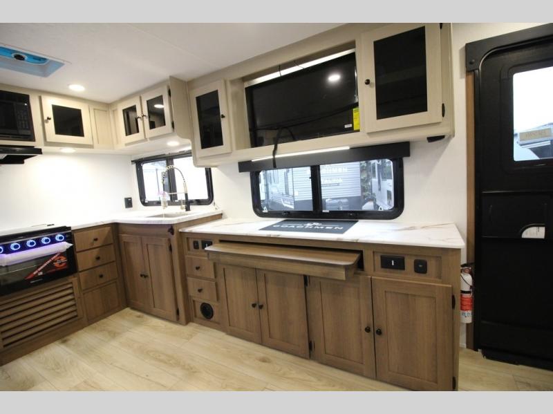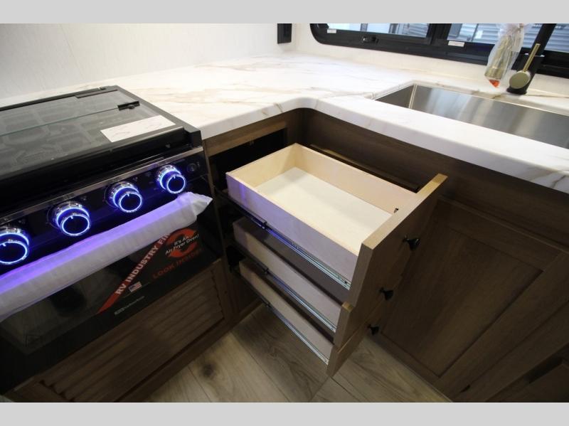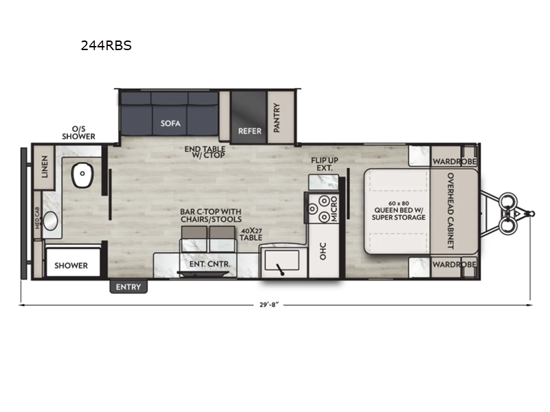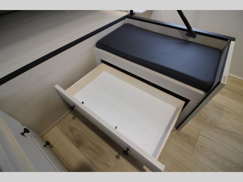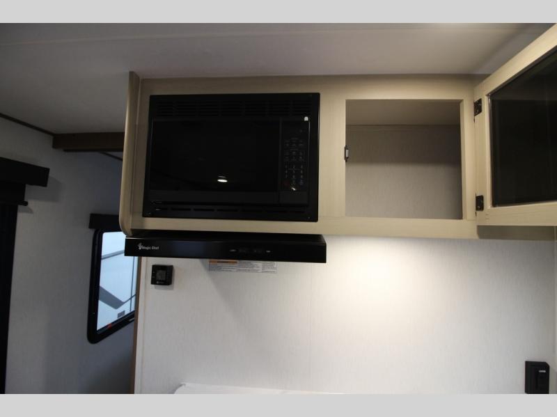 You will love this travel trailer's front bedroom, which is ideal for you and your partner. This bedroom is fitted with a 60 x 80 queen bed with super storage, dual wardrobes beside the bed and an overhead cabinet. In the kitchen area you will find a 12V refrigerator, 40 x 27 table, three burner cooktop and a bar countertop with chairs to have a refreshing drink on a hot day. Take a relaxing bath in the full bathroom furnished with a shower, medicine cabinet, and linen storage for an organized and clean space. After a long day of traveling, you can extend the large slide, kick back on the sofa with a cold drink from the nearby refrigerator, set it safely on the end table, and relax while you watch the big game.