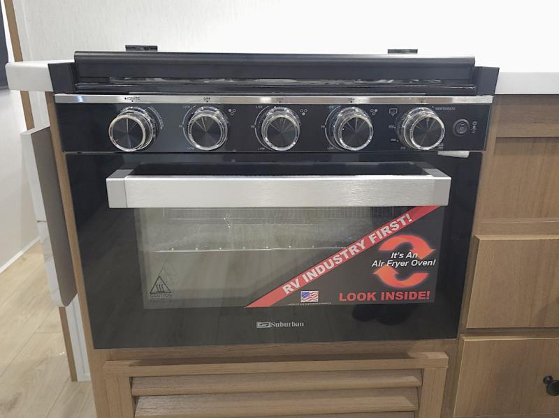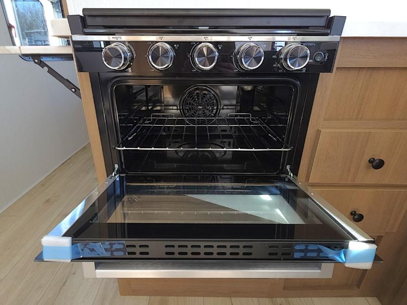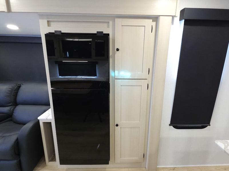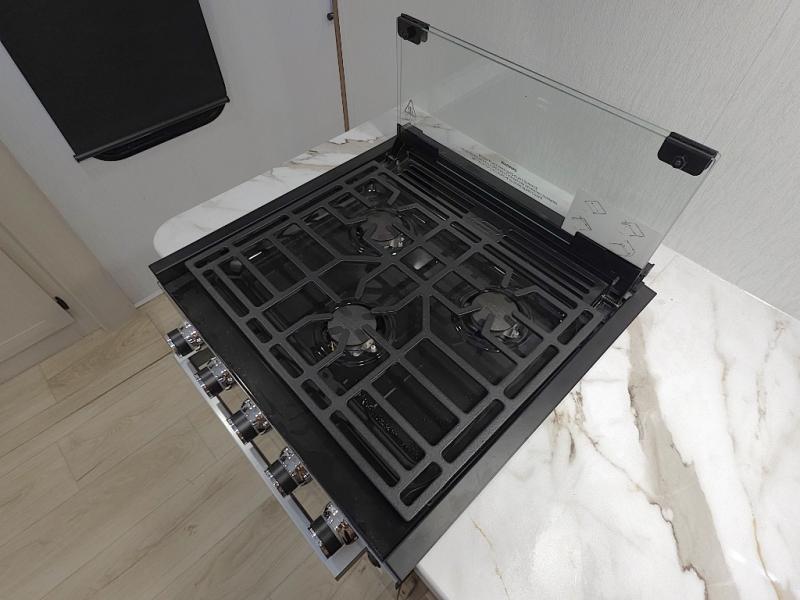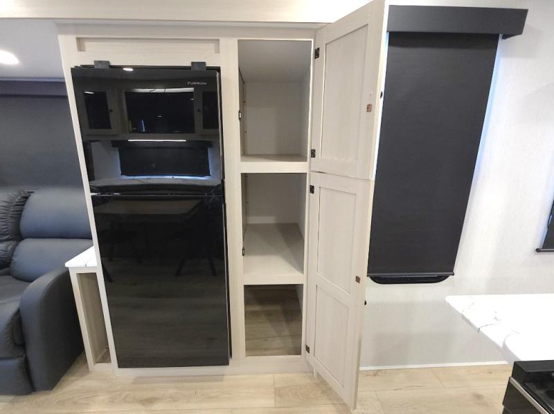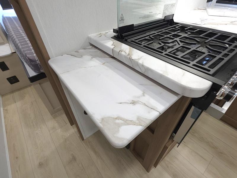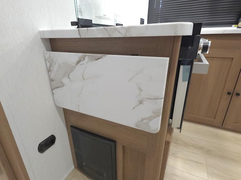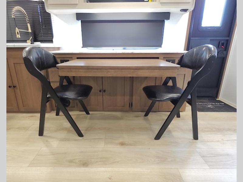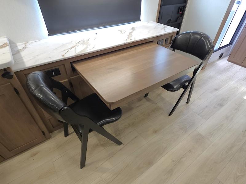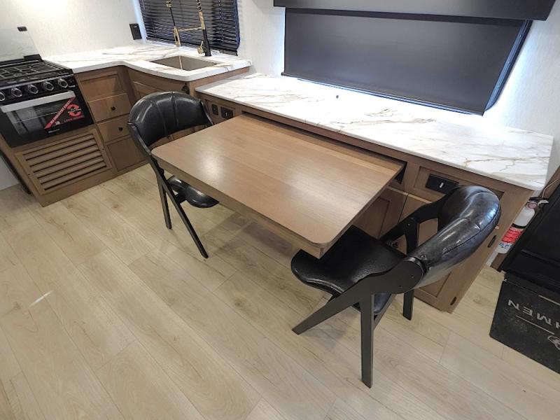 In the kitchen, meal prep is simple and efficient with a three-burner cooktop, 12V refrigerator, and generous pantry storage. The 40 x 27 table provides a comfortable place for meals, while the bar countertop with chairs is perfect for enjoying a refreshing drink or quick snack on warm afternoons.