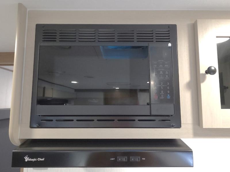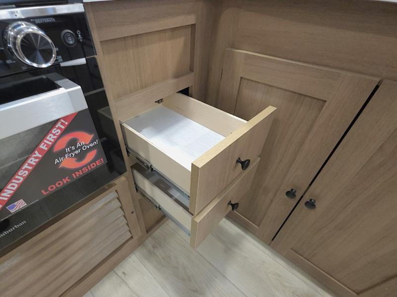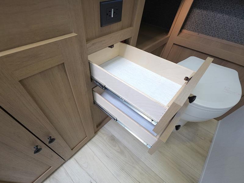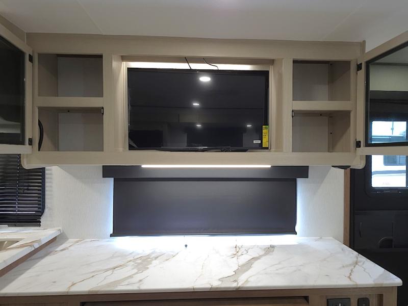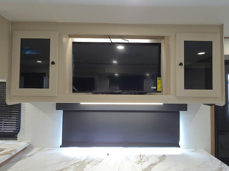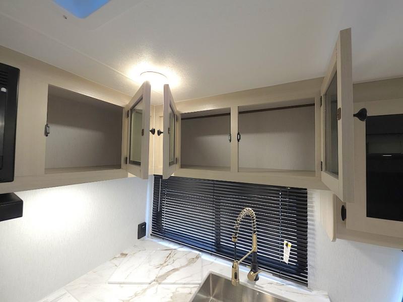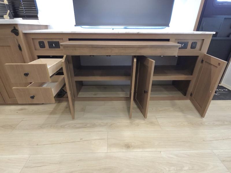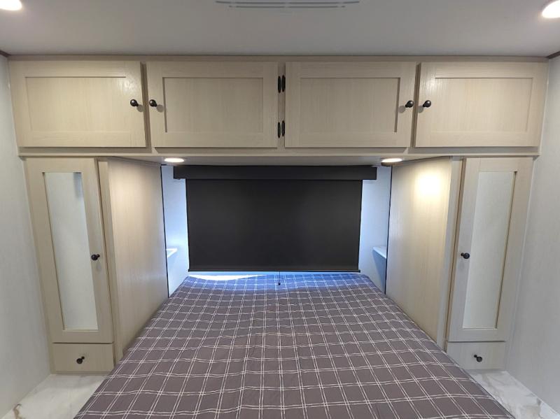 The front private bedroom offers a peaceful retreat after a day of adventure. You’ll appreciate the 60 x 80 queen bed with super storage underneath, dual wardrobes on each side, and an overhead cabinet that keeps essentials close at hand and clutter-free.