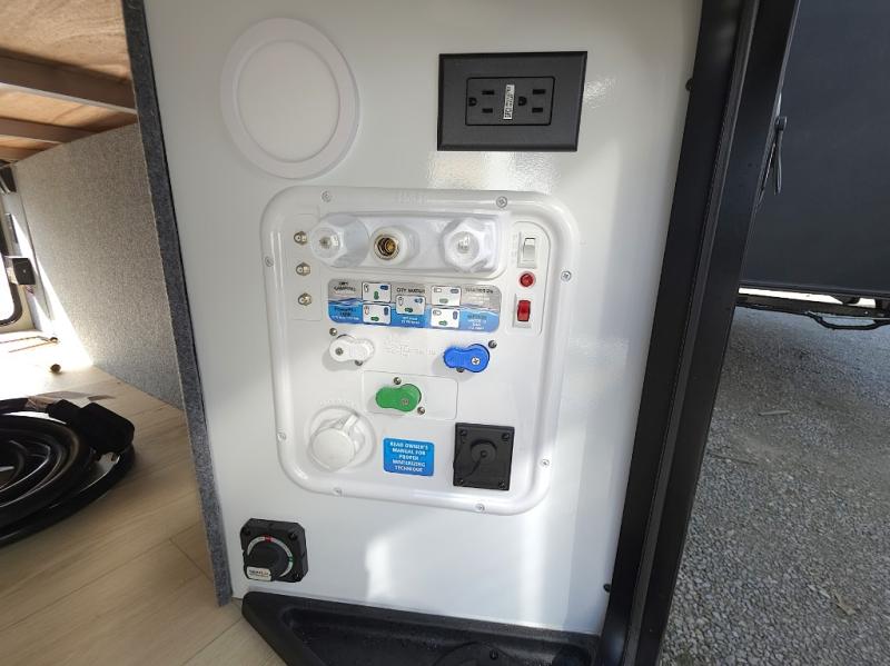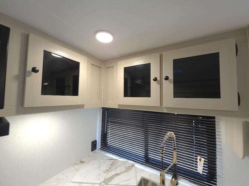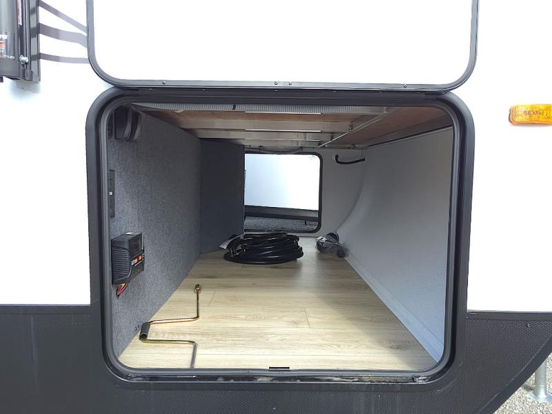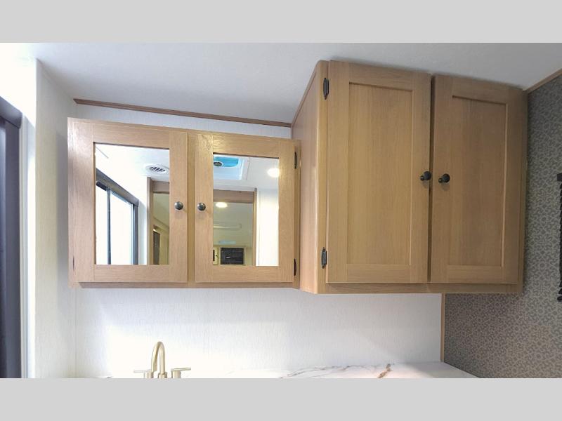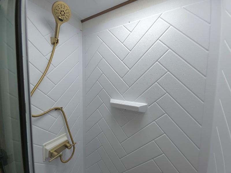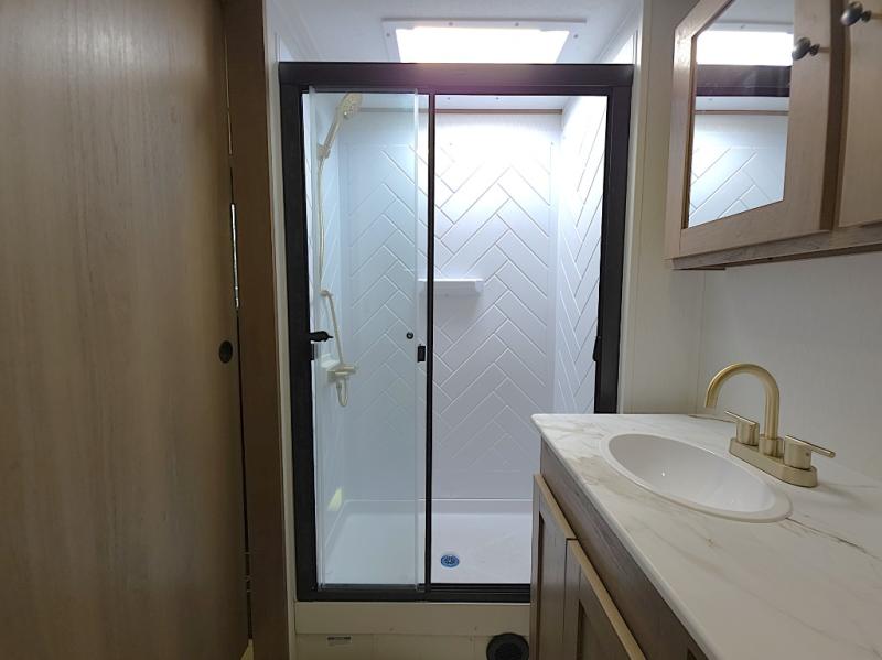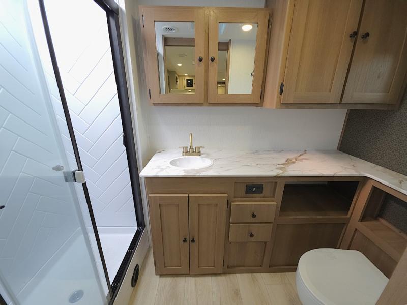 At the rear of the trailer, the full bathroom is thoughtfully designed with a roomy shower, medicine cabinet, and linen storage, giving you everything you need to stay refreshed and organized on the road. Outside, the hot and cold outside shower makes cleanup quick and easy after hiking, beach days, or traveling with pets.