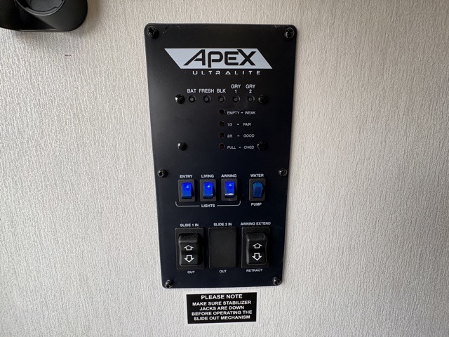 Lightweight living and camping is found with the Apex Ultra-Lite travel trailers by Coachmen. These eco-friendly units are made to last thanks to the Azdel composite sidewalls, the laminated aluminum floor, and the vacuum-bonded laminated trussed roof. There is a friction hinge entrance door, a 400-watt solar panel with a 30 Amp control charger, and slam latch baggage door catches for easy unloading. Some of the interior comforts you'll fall in love with are the one-piece seamless edge countertops, the hard valances with roller shades, and the Sorrento cabinetry. The Apex Ultra-Lite trailers also include USB/USB-C chargers. And when the adventure’s over, the hot/cold outside shower makes it easy to rinse off sandy feet, muddy gear, or pets before you ever step back inside.
