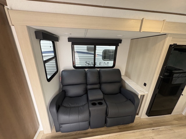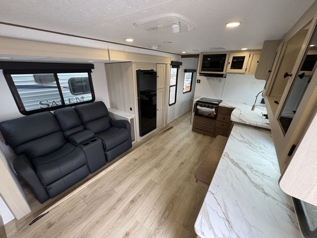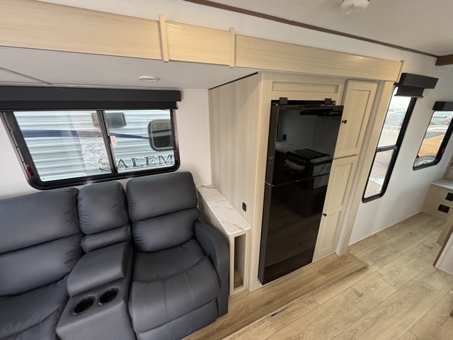 You will love this travel trailer's front bedroom, which is ideal for you and your partner. This bedroom is fitted with a 60 x 80 queen bed with super storage, dual wardrobes beside the bed and an overhead cabinet. In the kitchen area you will find a 12V refrigerator, 40 x 27 table, three burner cooktop and a bar countertop with chairs to have a refreshing drink on a hot day. Take a relaxing bath in the full bathroom furnished with a shower, medicine cabinet, and linen storage for an organized and clean space. After a long day of traveling, you can extend the large slide, kick back on the sofa with a cold drink from the nearby refrigerator, set it safely on the end table, and relax while you watch the big game.