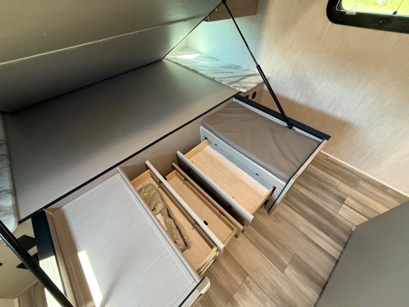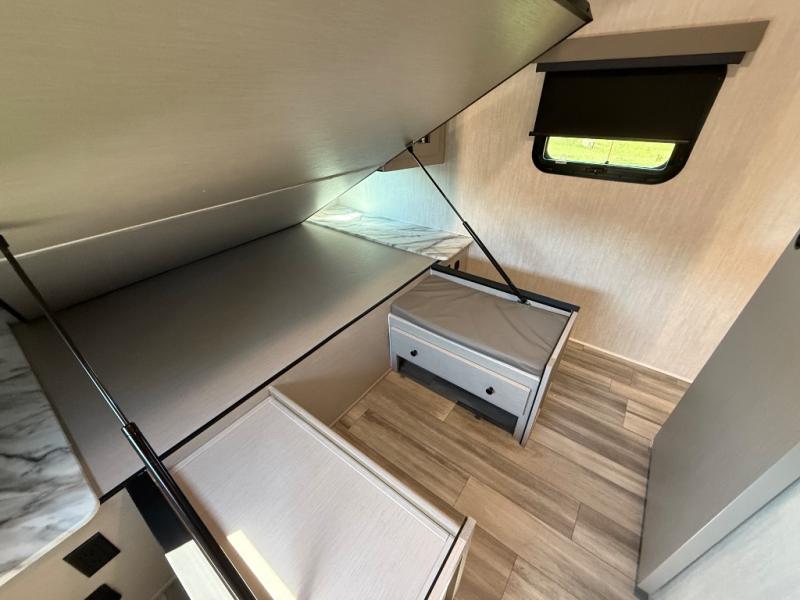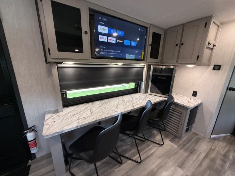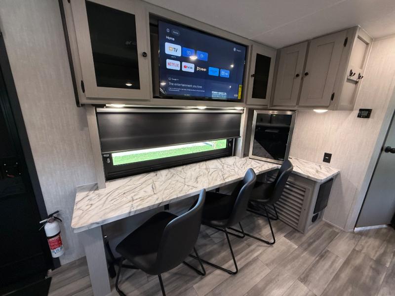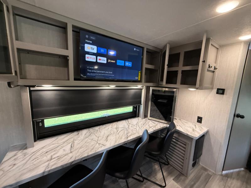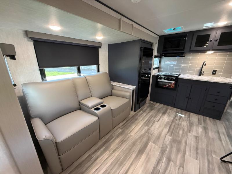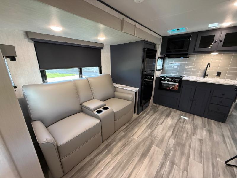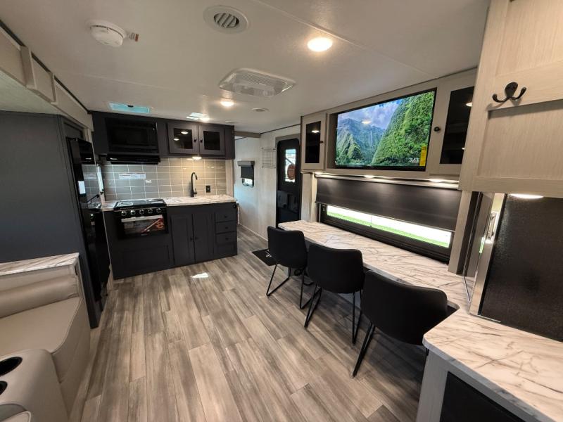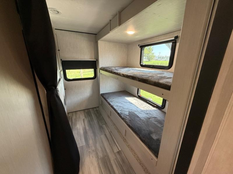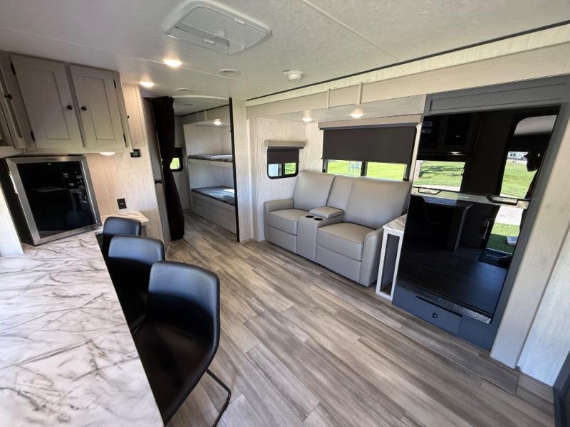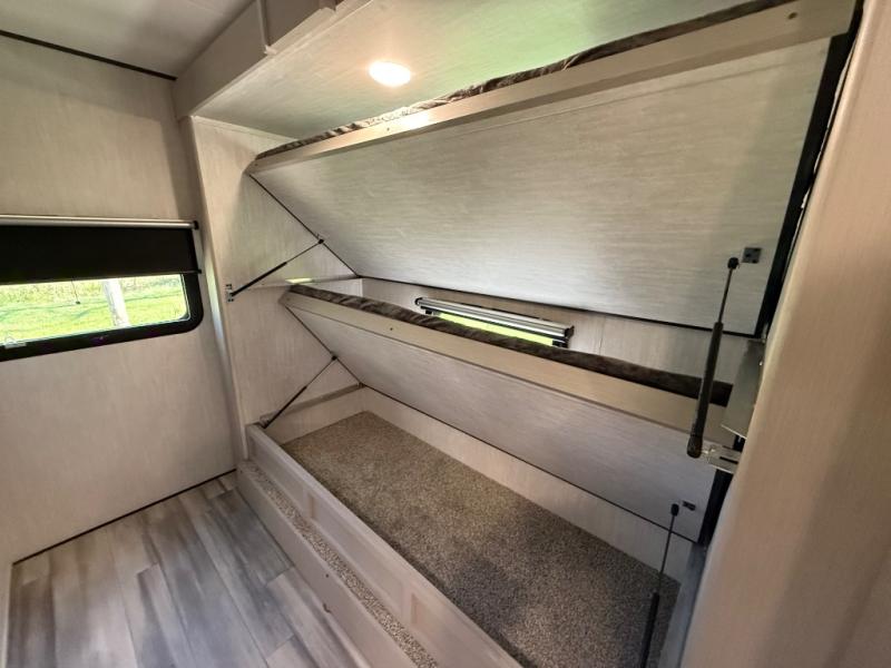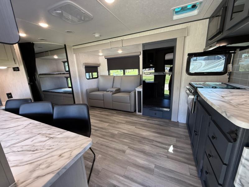 This travel trailer resembles the layout of 242BARV, but you'll enjoy the added semi-private bunkhouse in this unit. There is a 30" x 74" bottom bunk with storage and a 30" x 74" tilt-up bunk above, plus a wardrobe and flip-up TV prep in the wall. The owners will enjoy the front private bedroom with a 60 x 80 queen bed with super storage, dual wardrobes beside the bed and a overhead cabinet. In the kitchen area you will find a 12V refrigerator, pantry, three burner cooktop and a bar countertop with chairs. There is also a tri-fold sofa slide for more seating and sleeping space. This unit also includes a spacious full bath with one of the dual entry doors to the unit for added convenience!