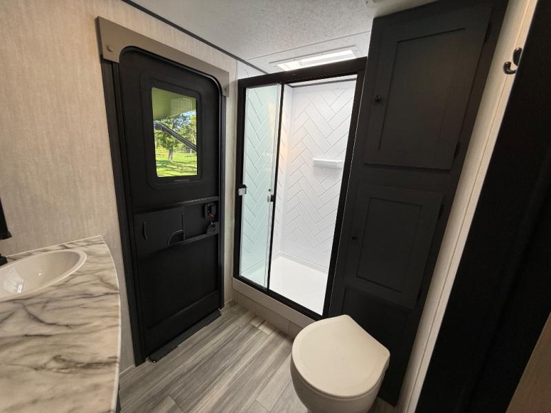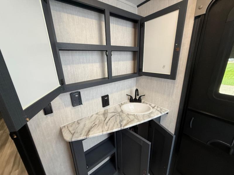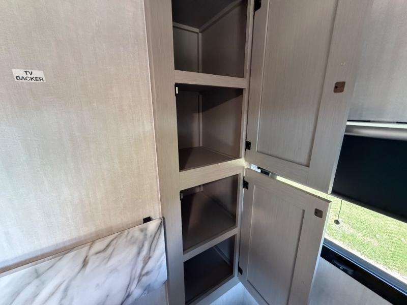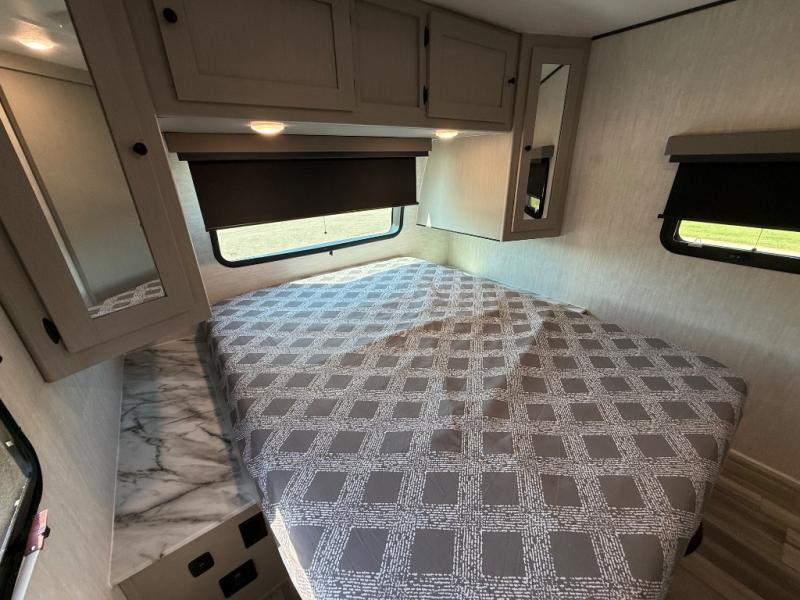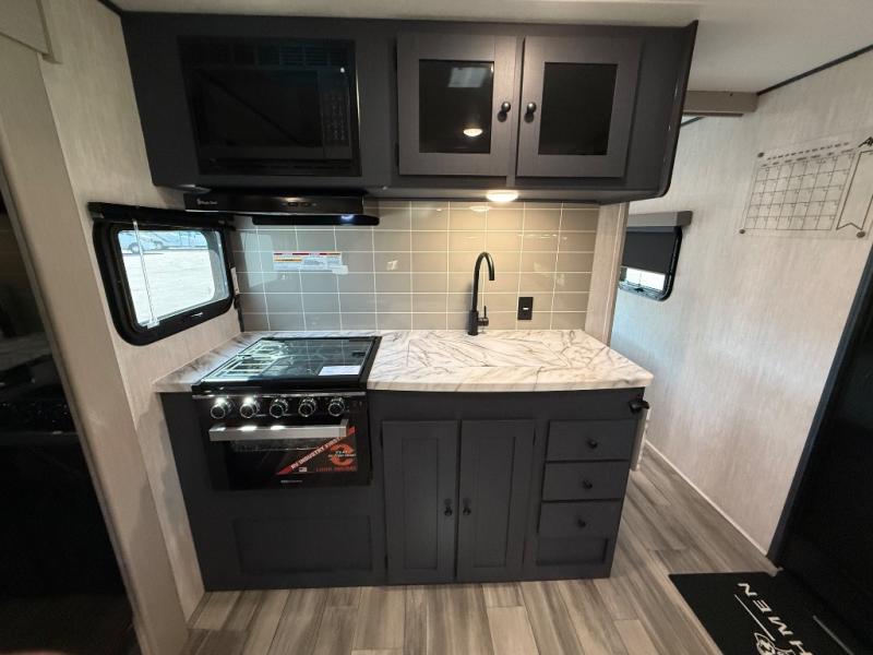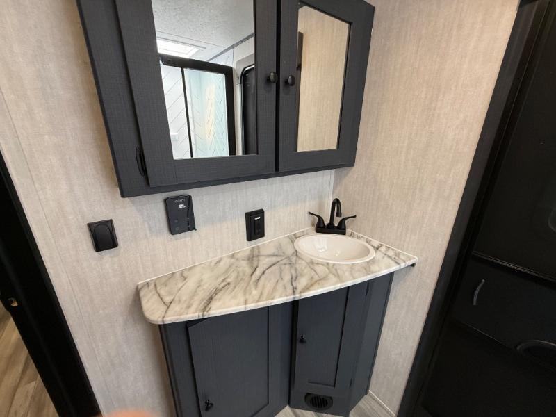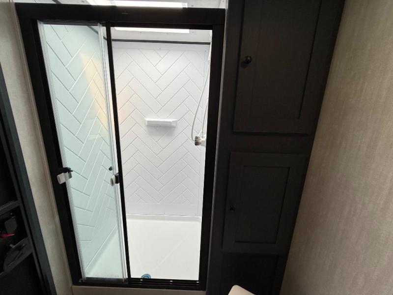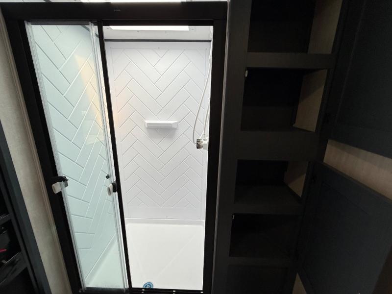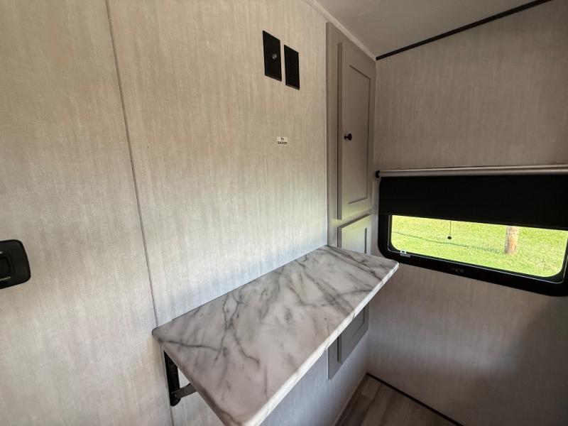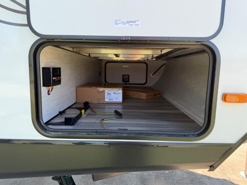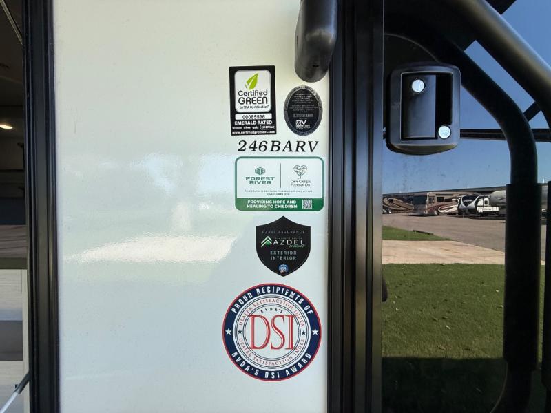 This travel trailer resembles the layout of 242BARV, but you'll enjoy the added semi-private bunkhouse in this unit. There is a 30" x 74" bottom bunk with storage and a 30" x 74" tilt-up bunk above, plus a wardrobe and flip-up TV prep in the wall. The owners will enjoy the front private bedroom with a 60 x 80 queen bed with super storage, dual wardrobes beside the bed and a overhead cabinet. In the kitchen area you will find a 12V refrigerator, pantry, three burner cooktop and a bar countertop with chairs. There is also a tri-fold sofa slide for more seating and sleeping space. This unit also includes a spacious full bath with one of the dual entry doors to the unit for added convenience!